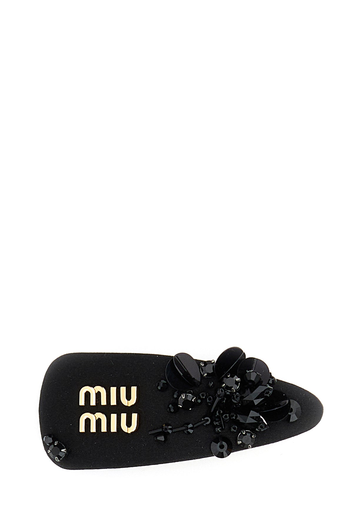 Fermaglio per capelli realizzato in raso caratterizzato da logo in lettere metalliche arricchito da particolari decorazione con perline e paillettes tonali.