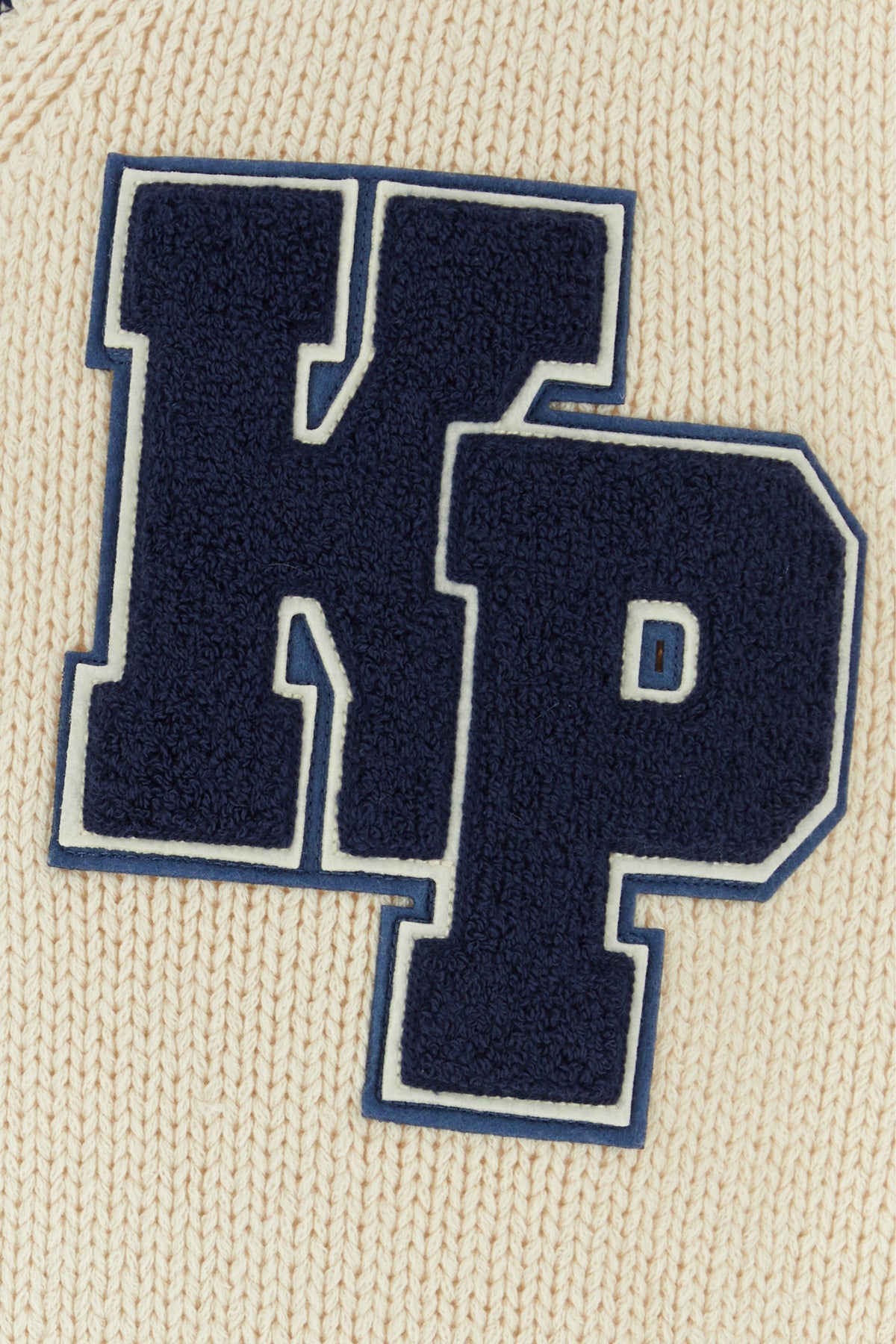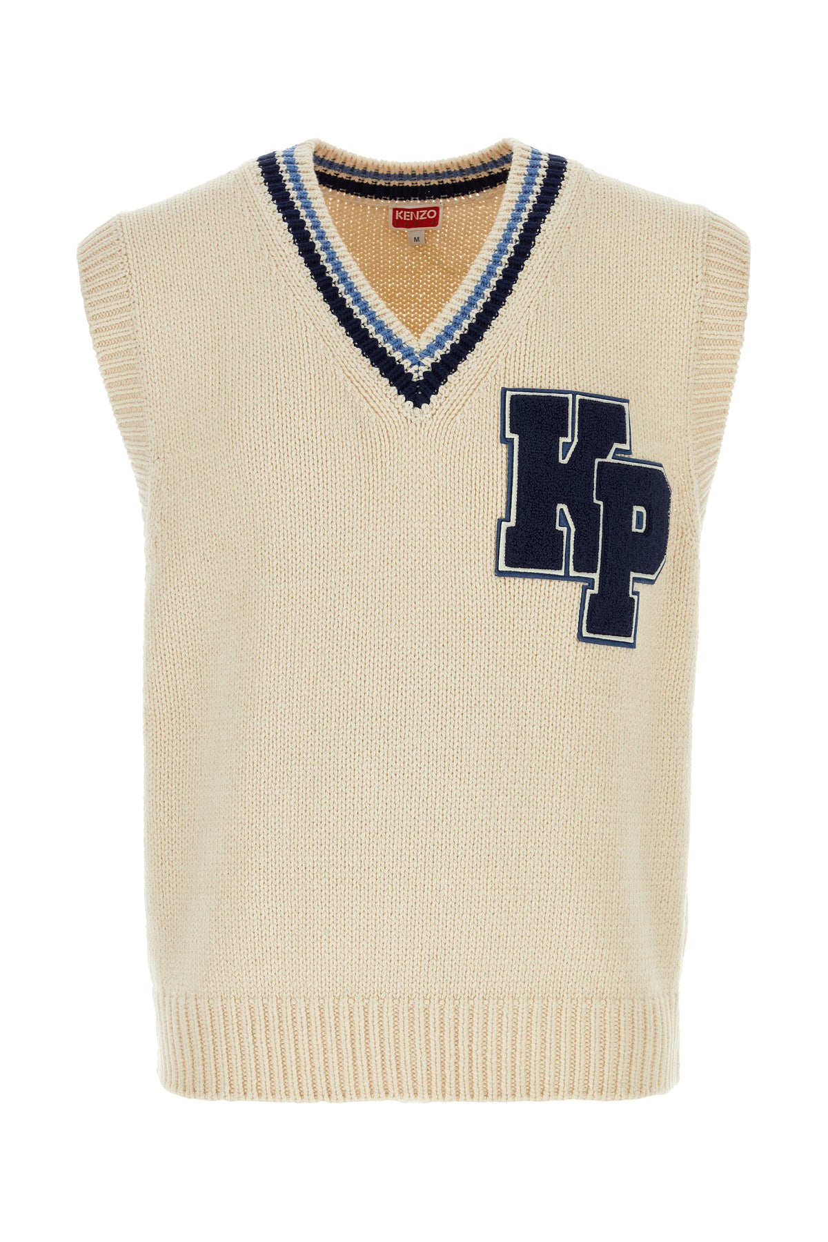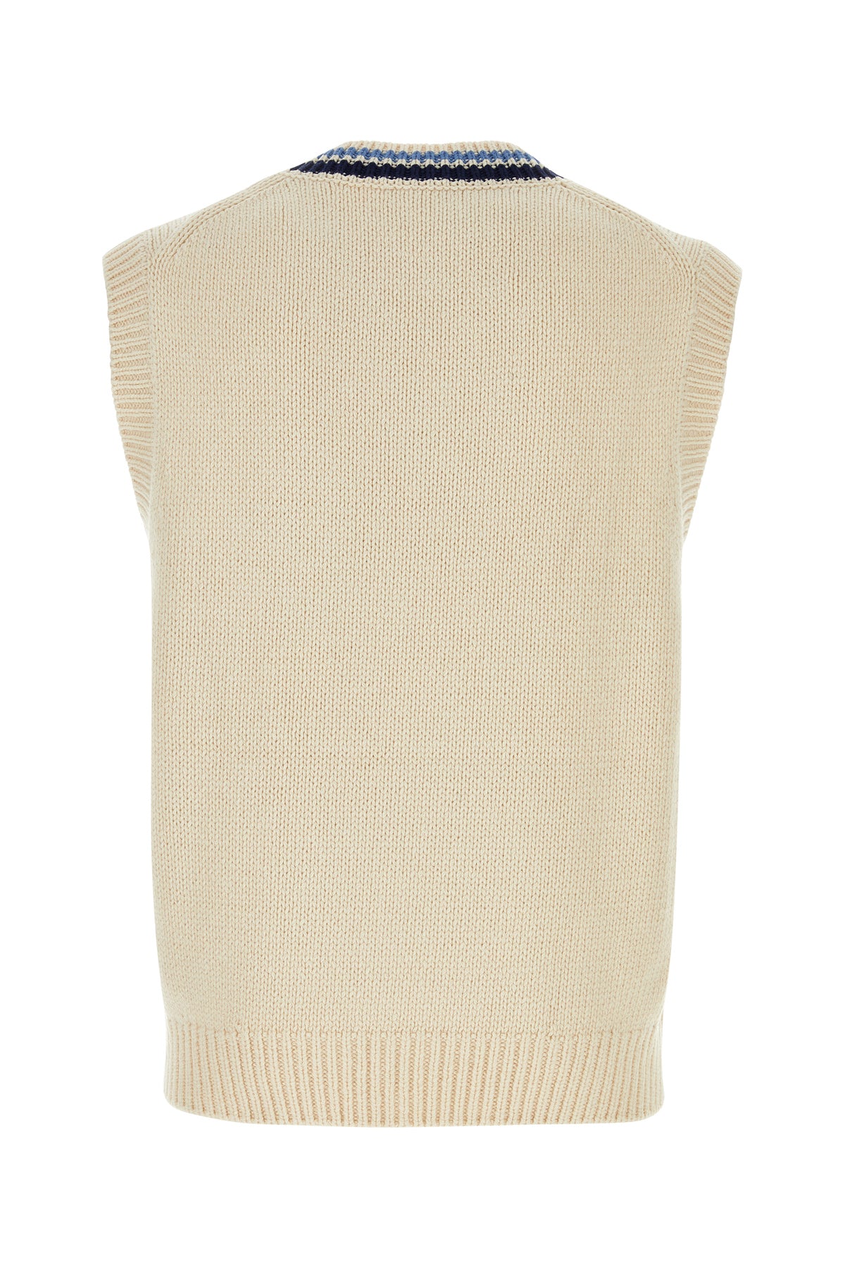 Gilet realizzato in lana e cotone caratterizzato da profilature a contrasto sulla scollatura a V arricchito da applicazione a contrasto sul petto.