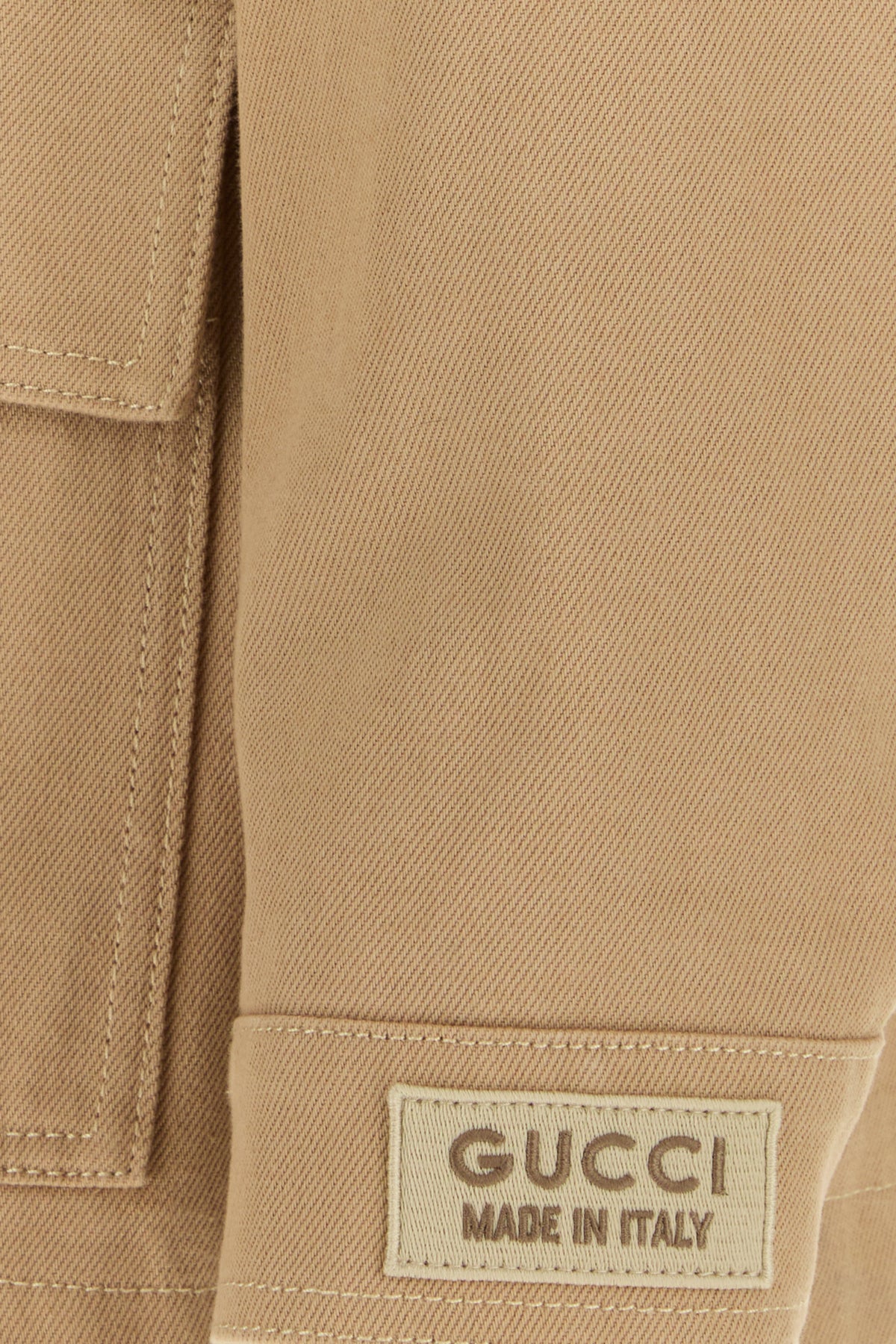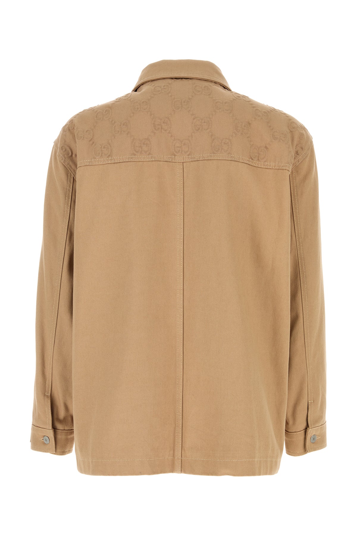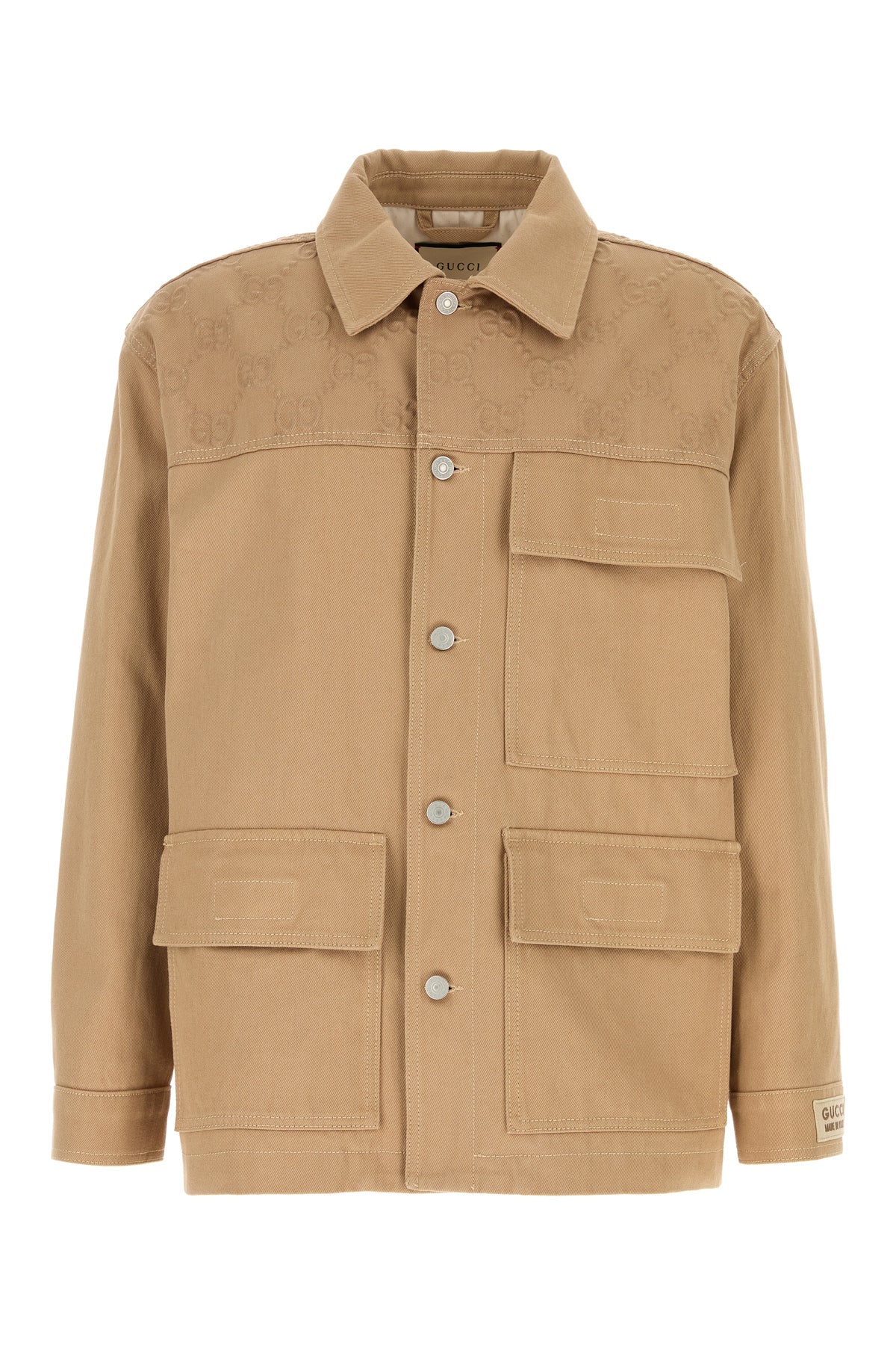 Giubbino realizzato in puro cotone caratterizzato da motivo GG in rilievo sulla parte superiore arricchito da etichetta Gucci Made In Italy sulla manica.