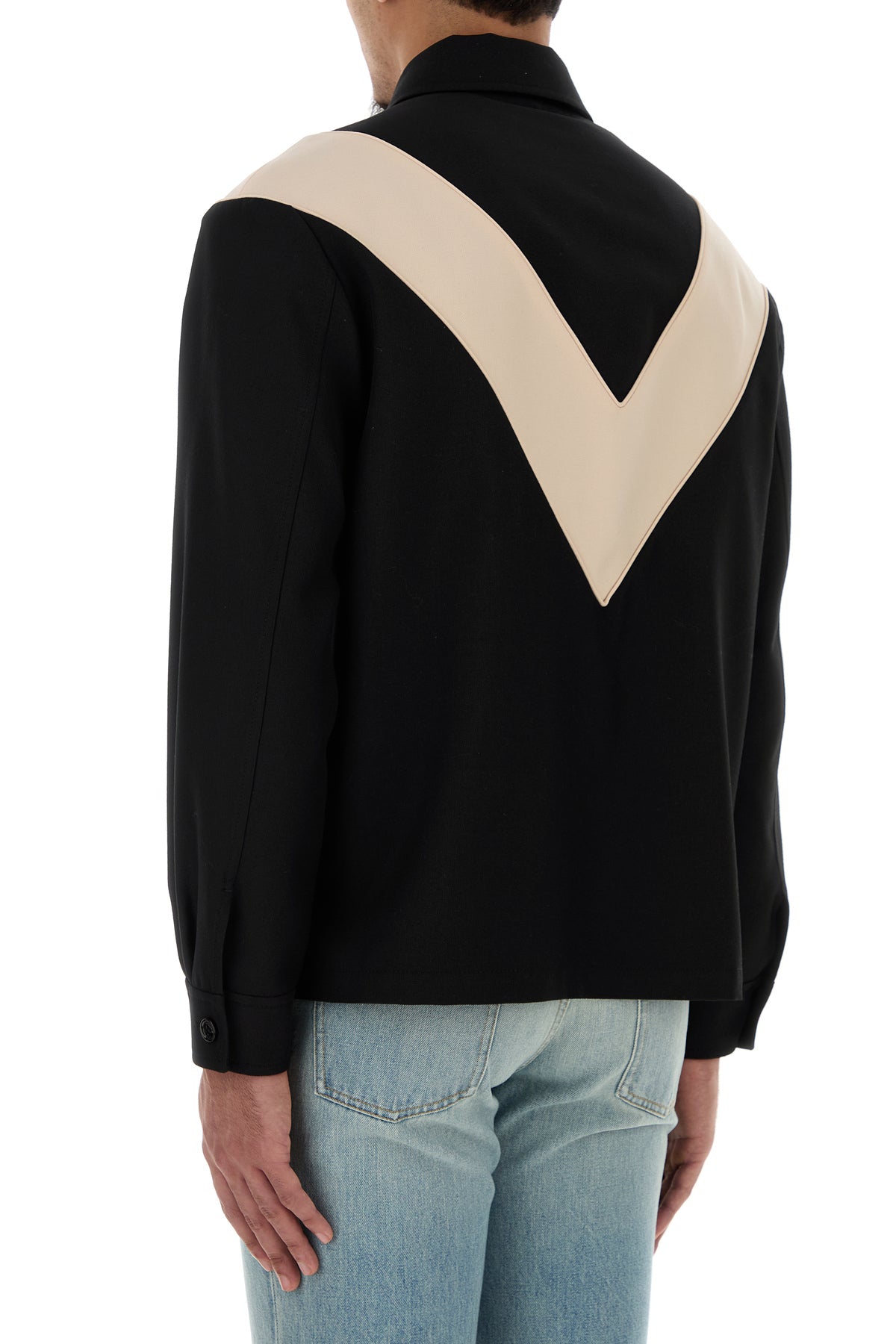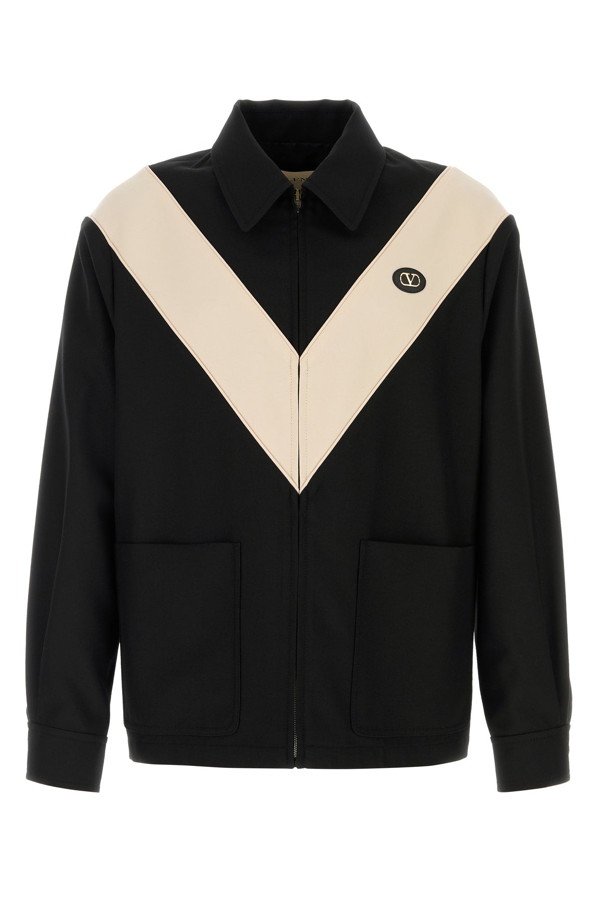 Giubbino realizzato in gabardine caratterizzato da motivo V a contrasto sulla parte frontale e sul retro arricchito da applicazione VLogo sul petto.