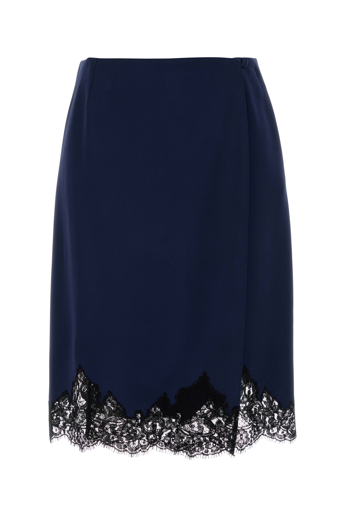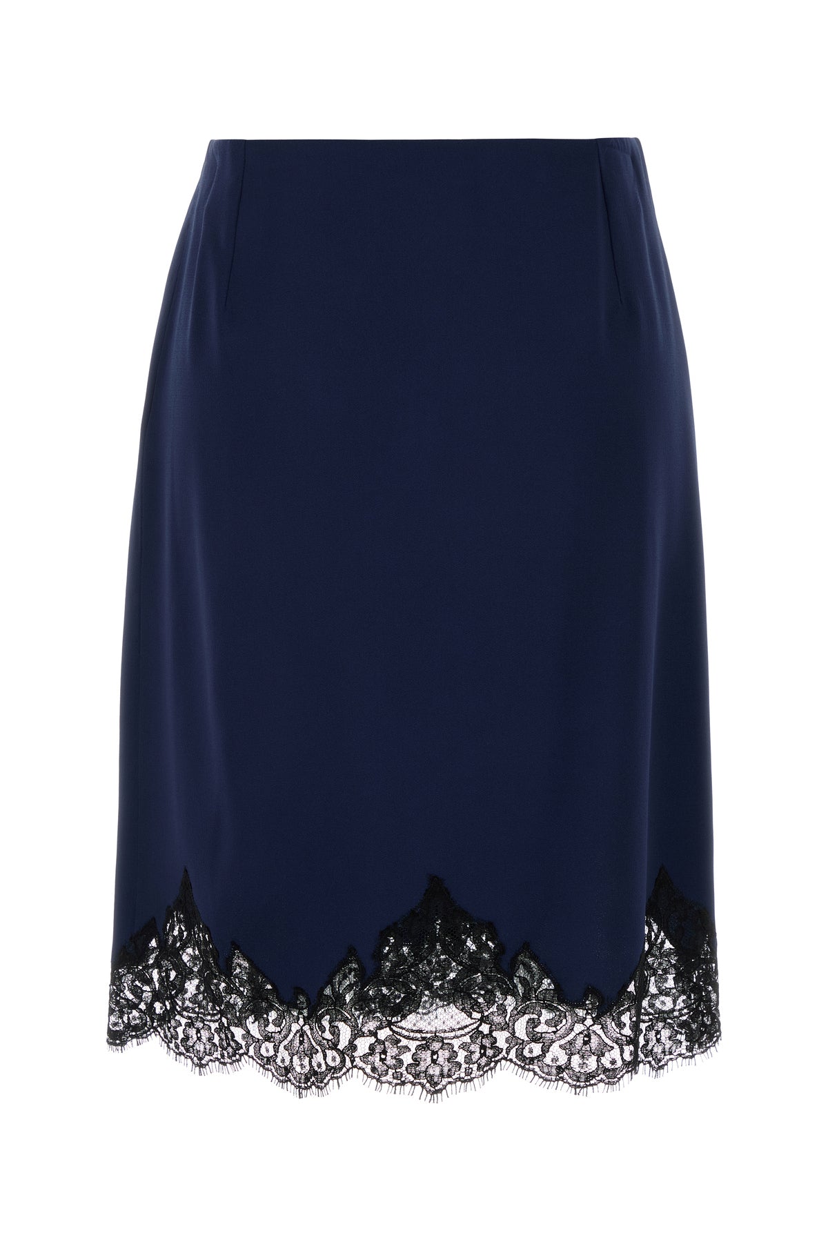 Gonna midi realizzata in raso arricchita da insetto in pizzo a contrasto sul fondo.