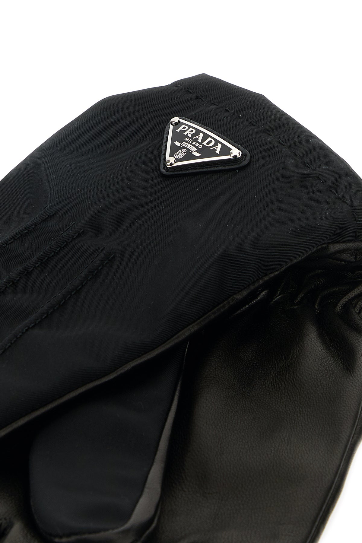Guanti realizzati in nylon e nappa arricchiti da iconico triangolo logato metallico sulla parte frontale.