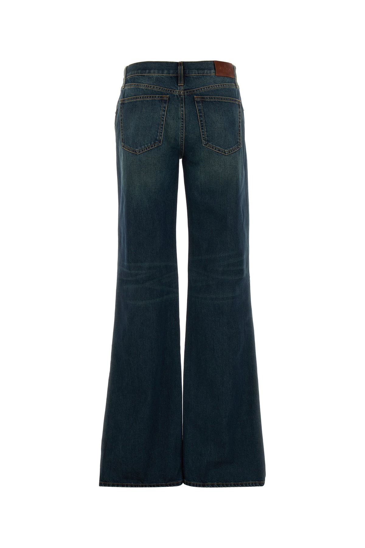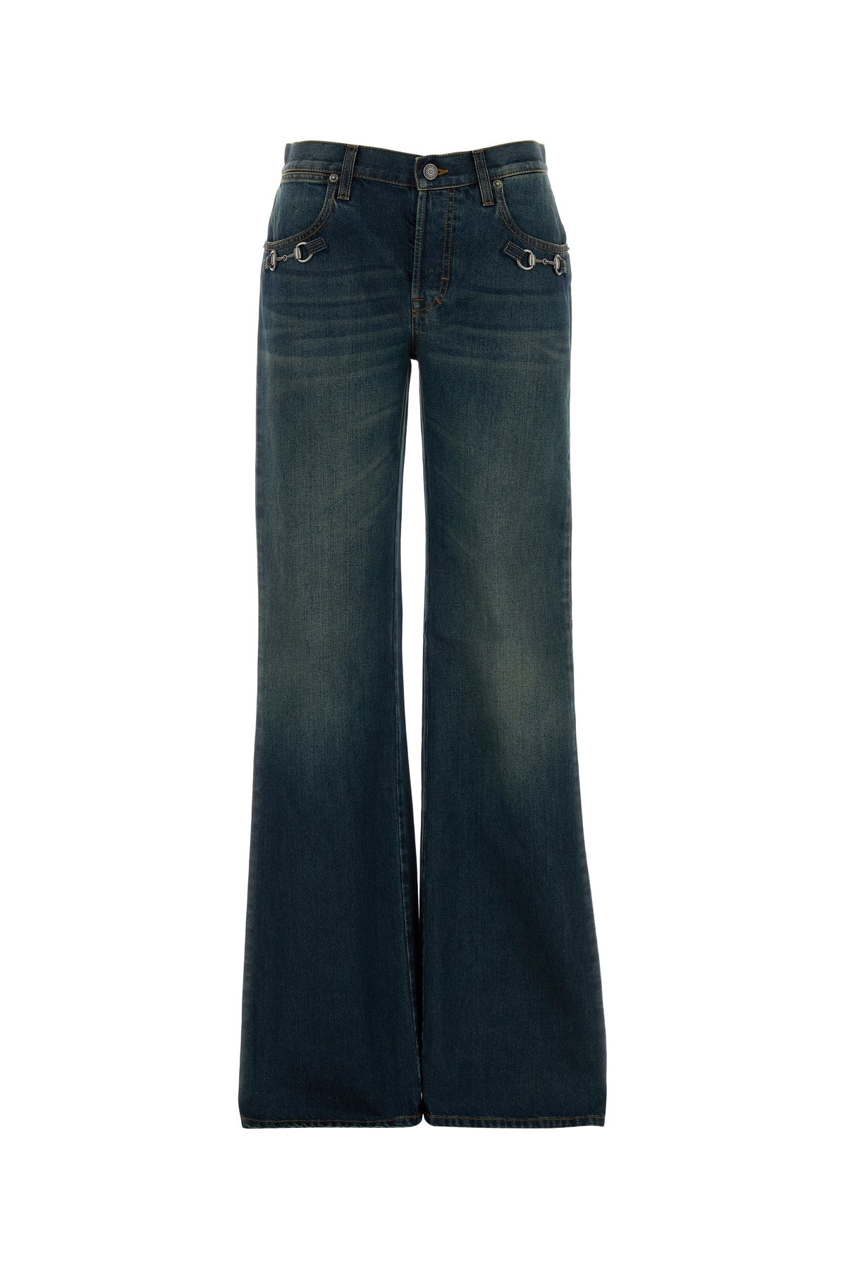 Jeans dalla gamba ampia realizzata in denim di puro cotone slavato arricchito da dettagli metallici morsetto sulla parte frontale.