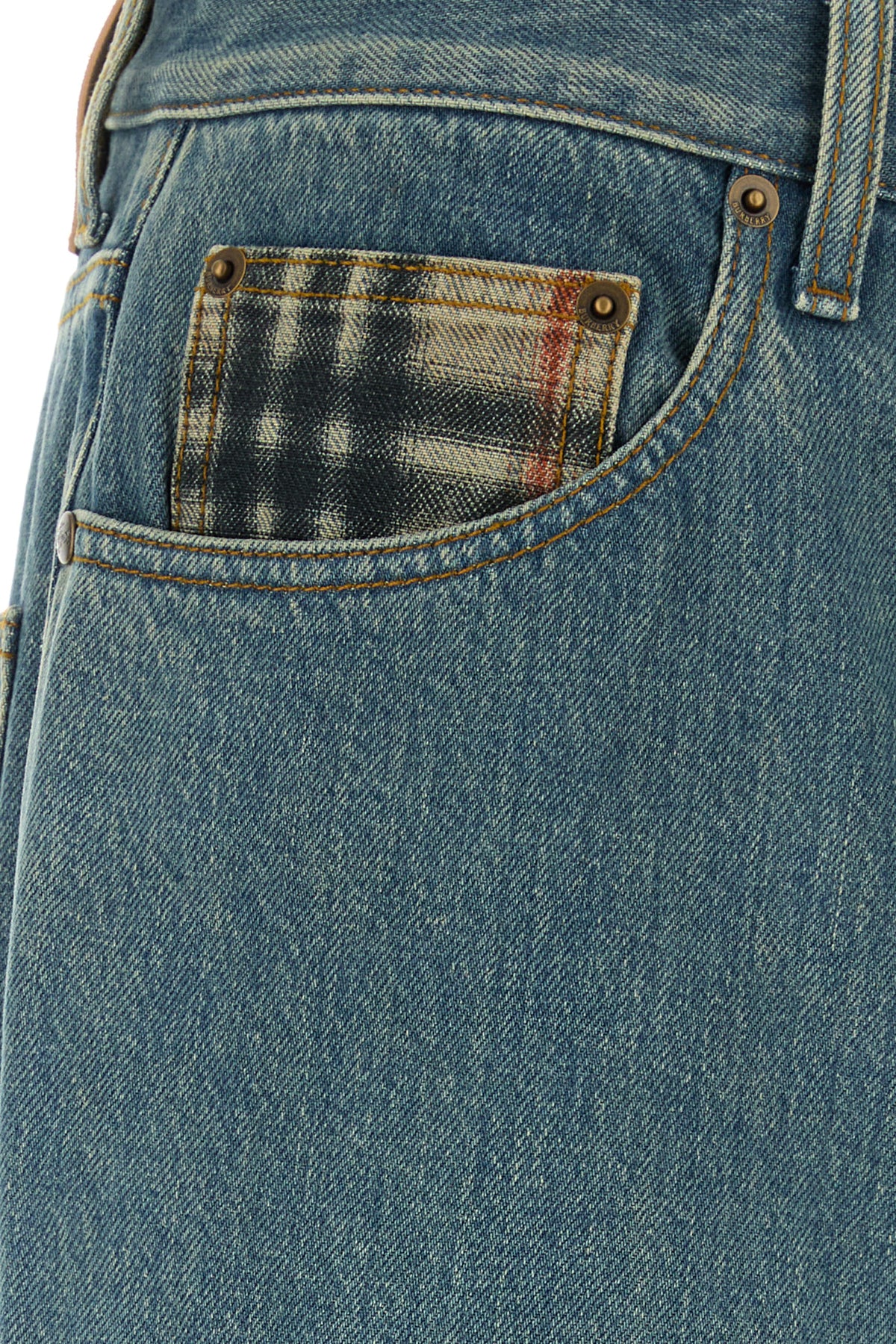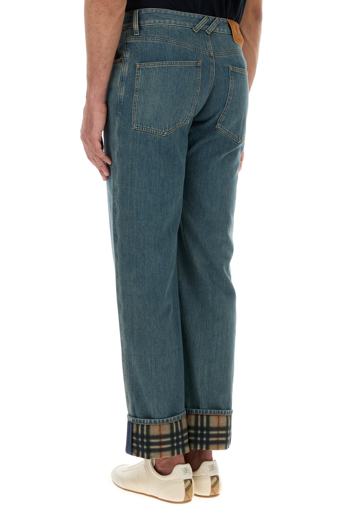 Jeans realizzati in denim caratterizzati da ricamo Burberry Check sulla parte superiore e sul fondo risvoltabile.