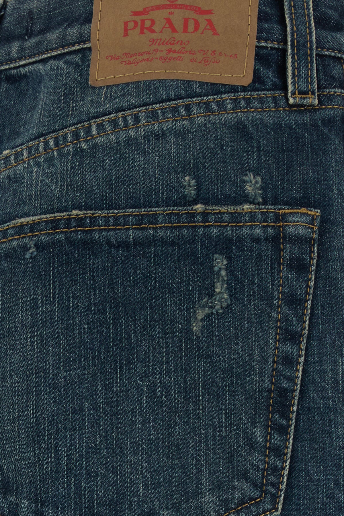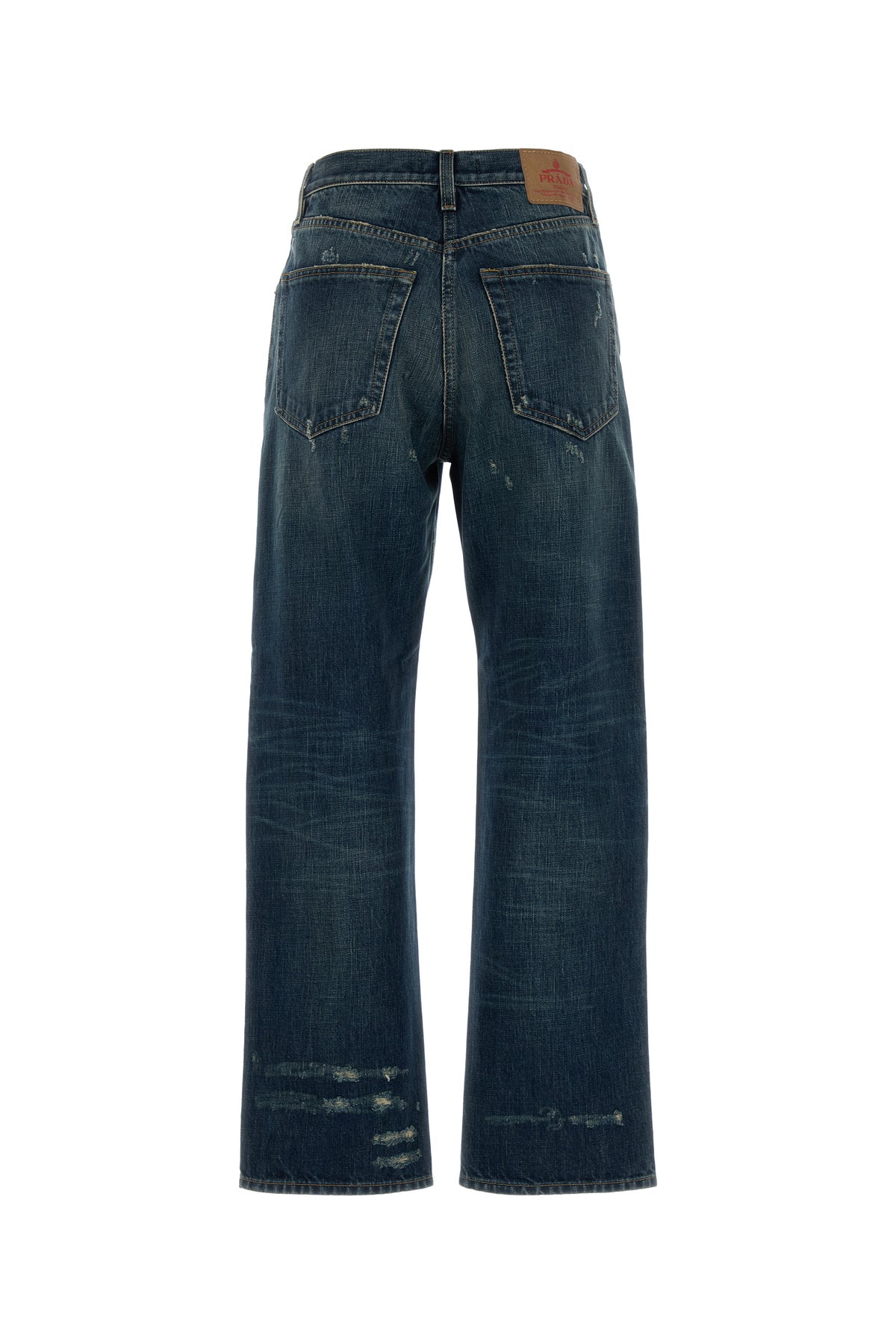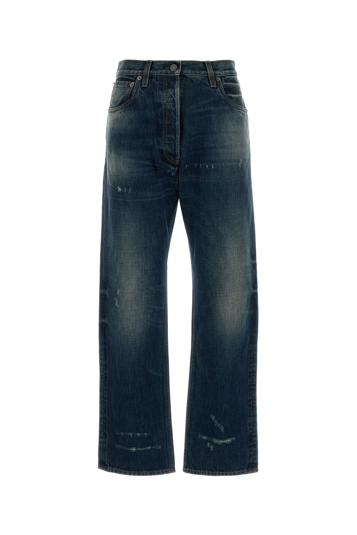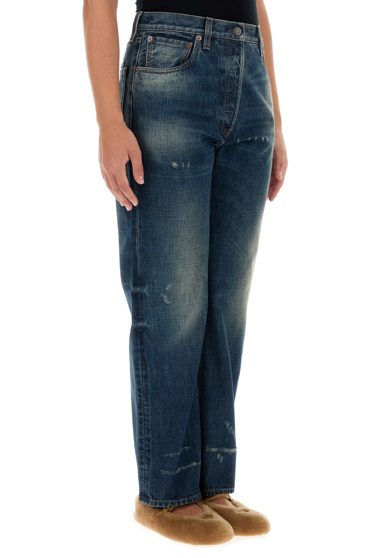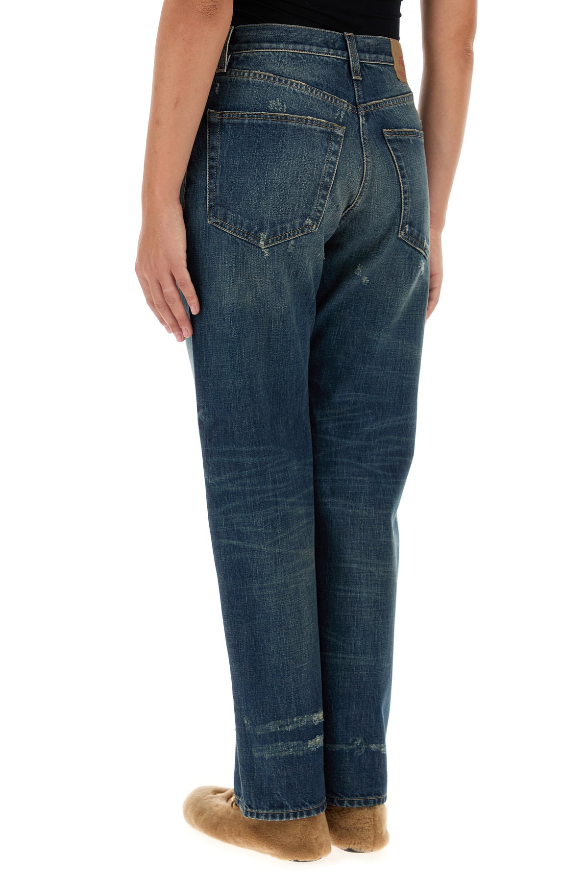 Jeans realizzati in denim di puro cotone slavato e sdrucito arricchiti da etichetta logata a contrasto sul retro.