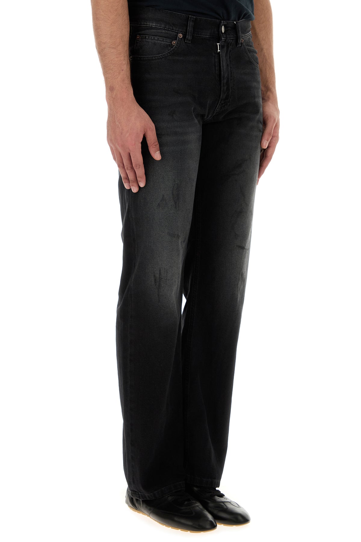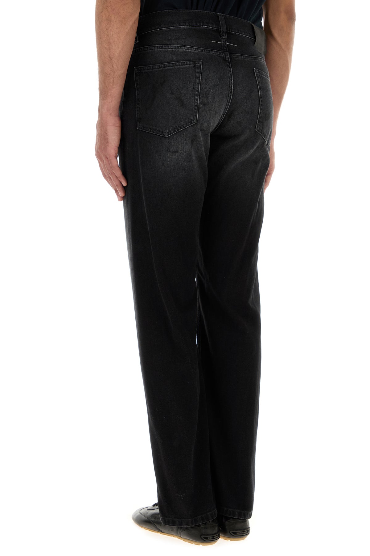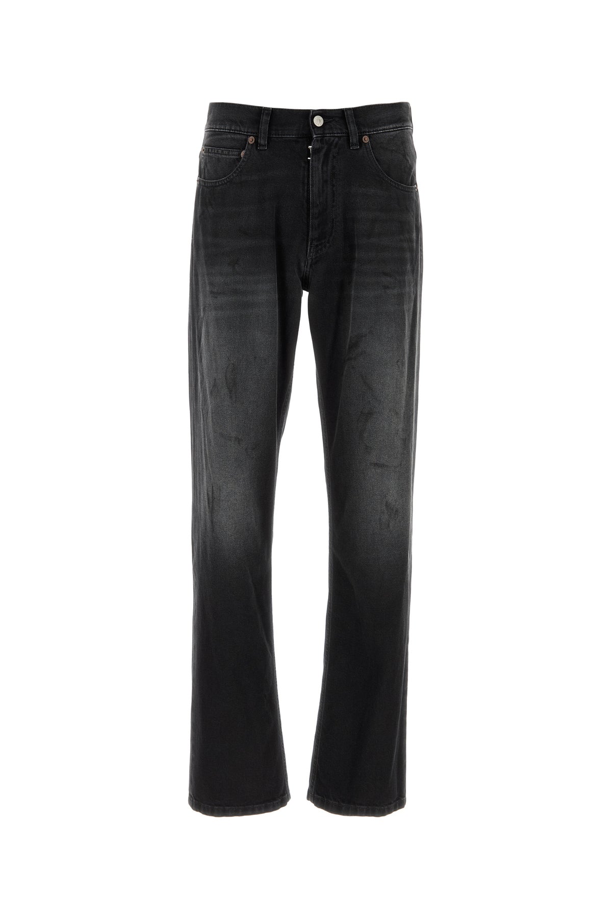 Jeans realizzati in denim di puro cotone slavato con sporcature intenzionali arricchito da iconica cucitura a contrasto sul retro.