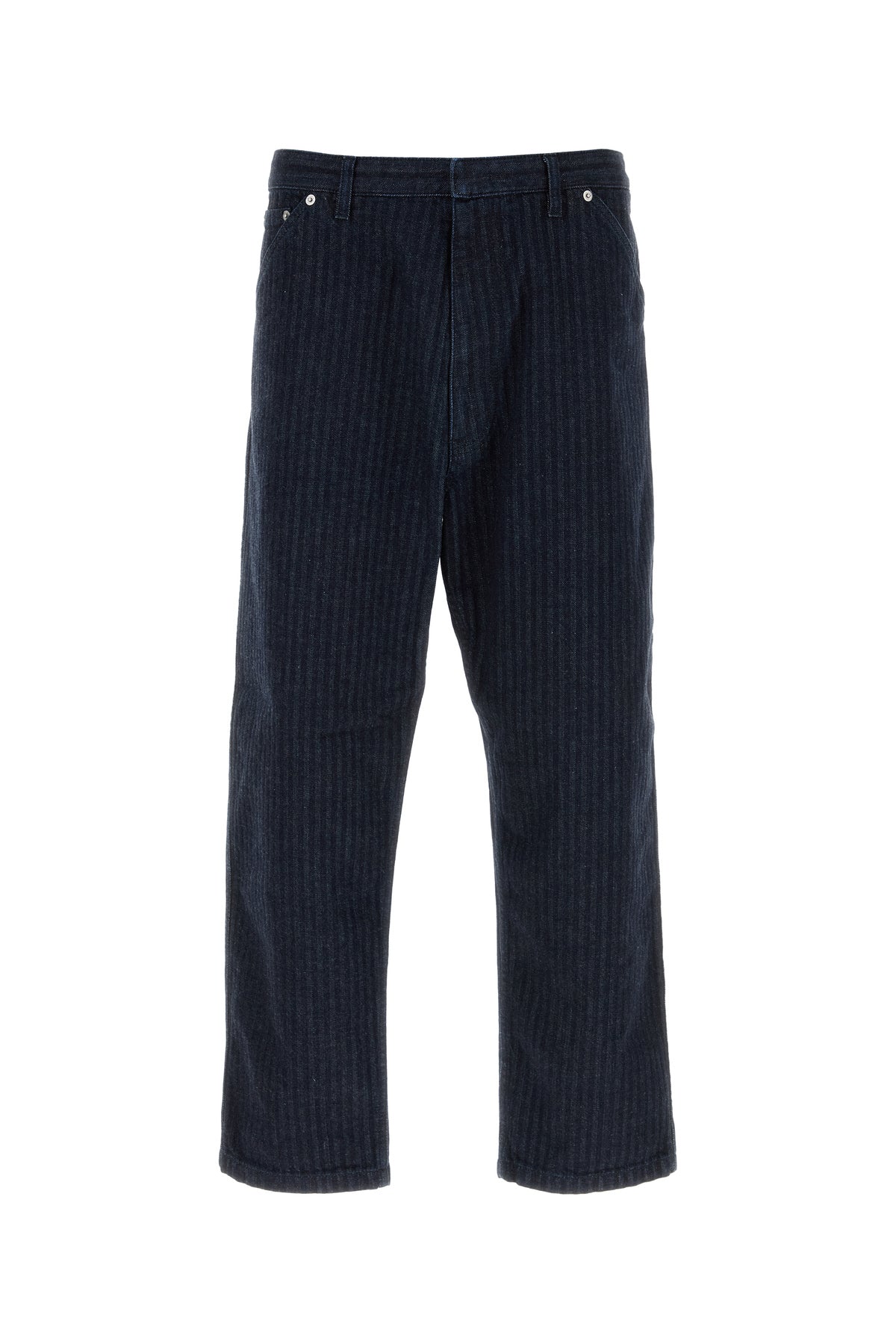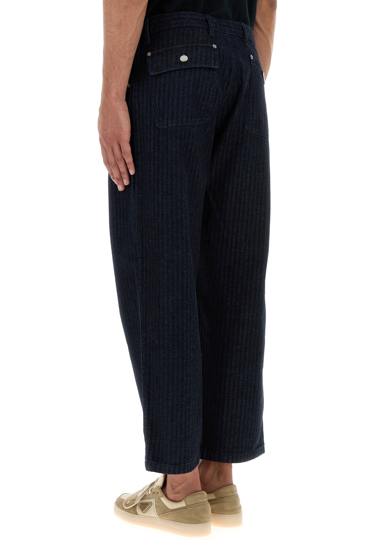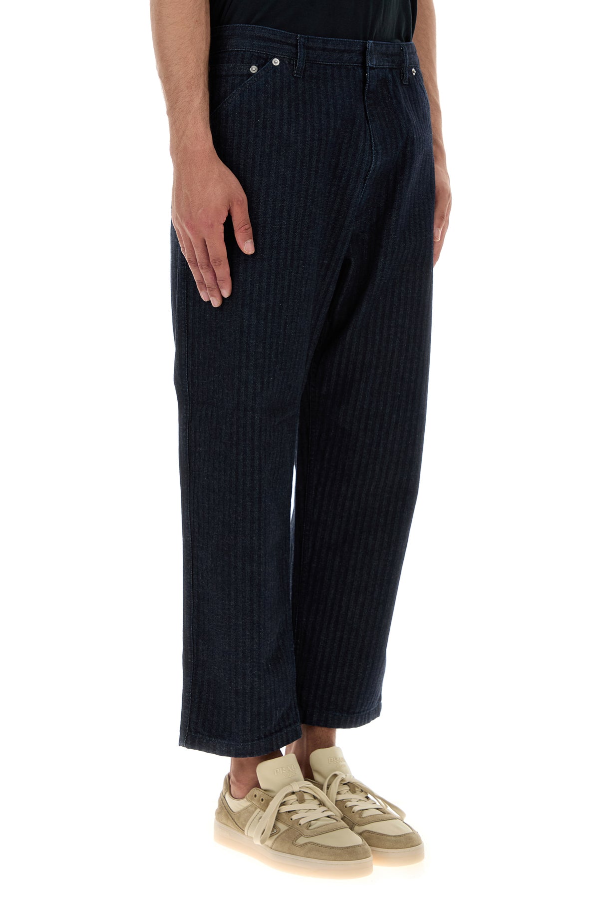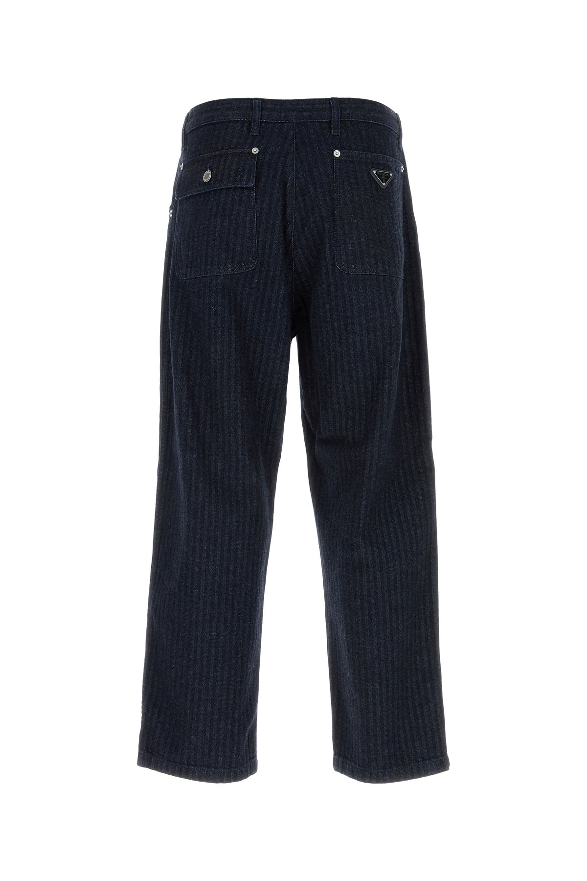 Jeans realizzati in denim di puro cotone caratterizzati da ricamo a righe su tutta la superficie arricchiti da iconico triangolo metallico logato sul retro.