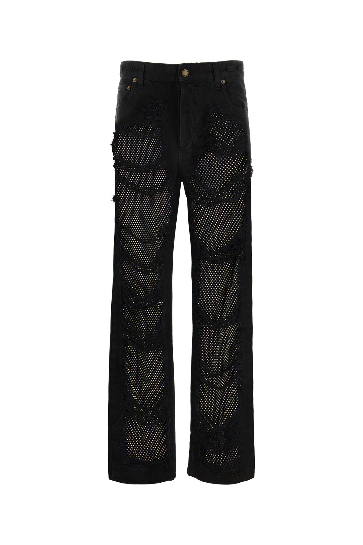 Jeans realizzati in denim di puro cotone arricchiti da strappi con cristalli sulla parte frontale.