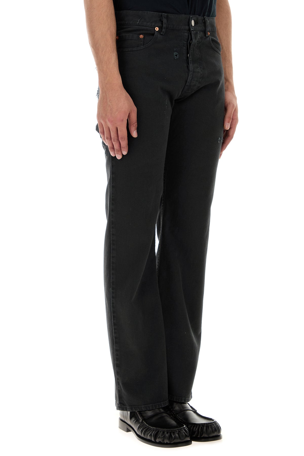 Jeans realizzati in denim di puro cotone slavato e sdrucito con strappi intenzionali arricchito da cinturino intrecciato sul retro.