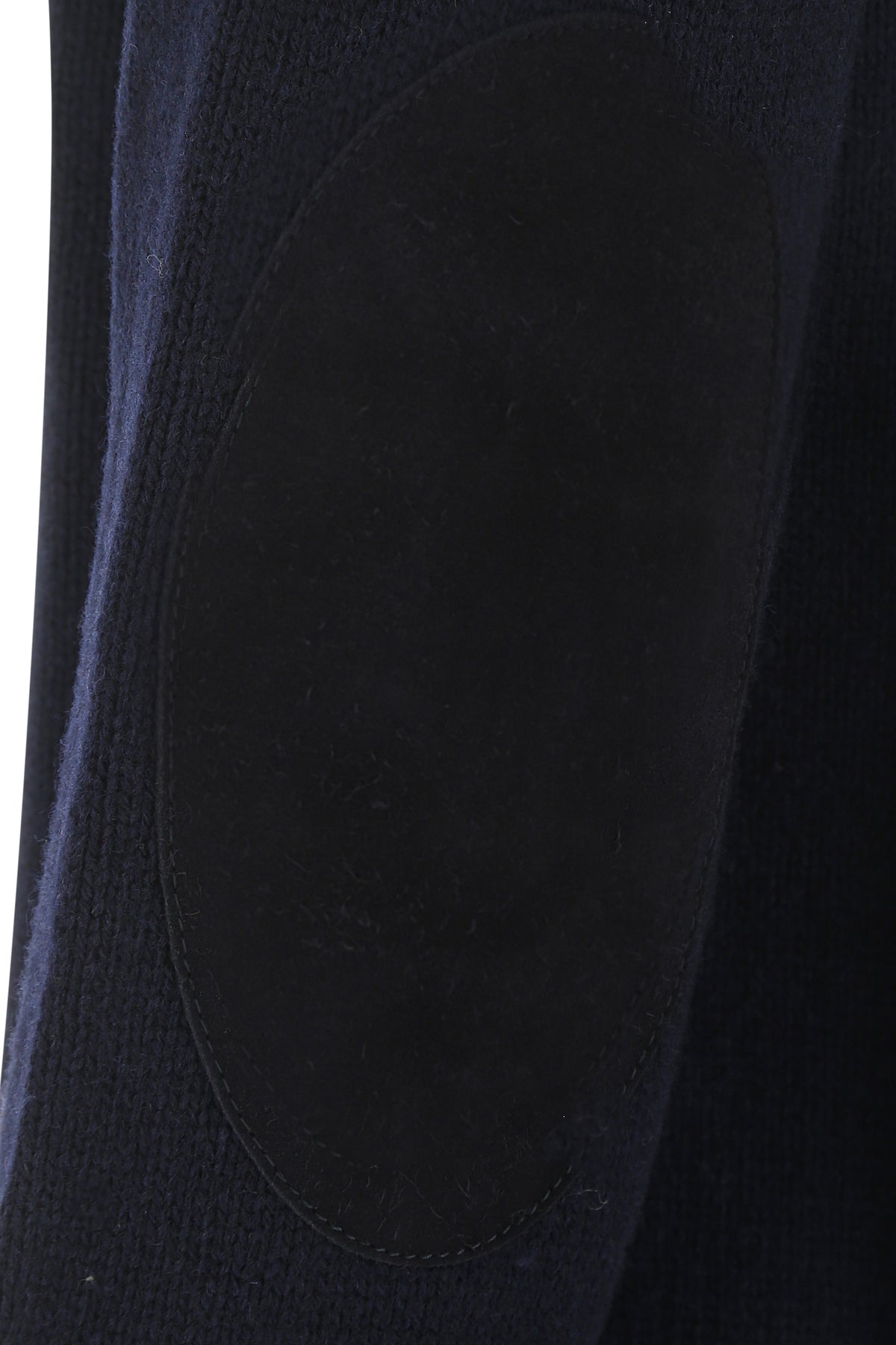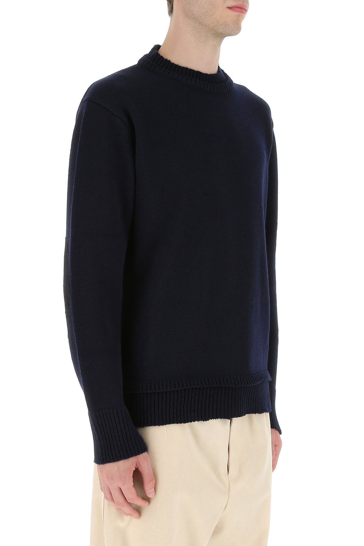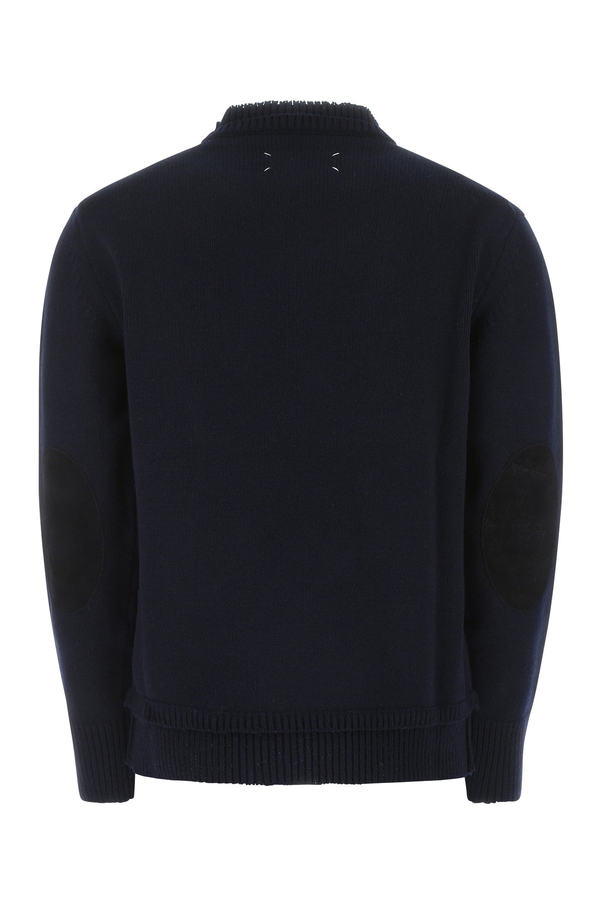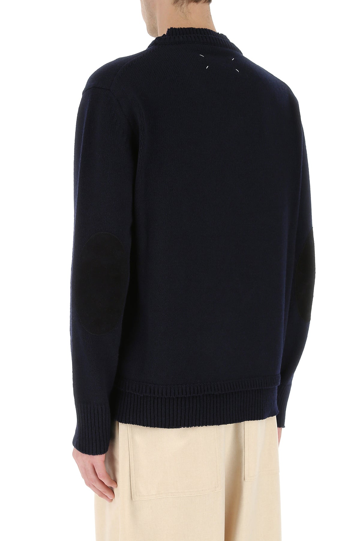 Maglione realizzato in misto lana caratterizzato da cuciture a contrasto sul retro arricchito da applicazioni in pelle scamosciata tonale sulle maniche.