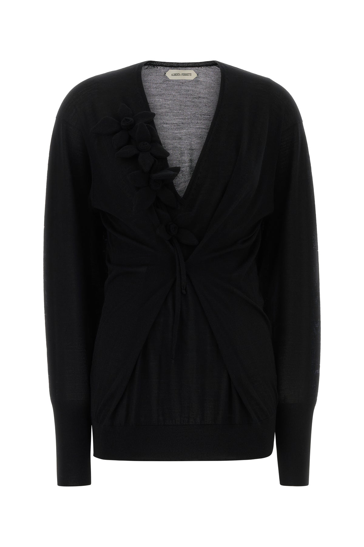Maglione realizzato in lana vergine e cashmere arricchito da applicazione floreale sulla scollatura a V.