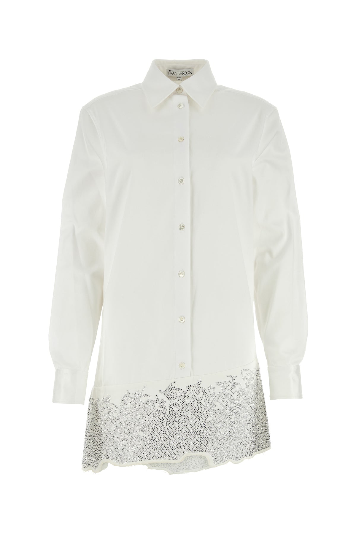 Mini abito chemisier realizzato in puro cotone arricchito da inserto in denim con cristalli sul fondo.
