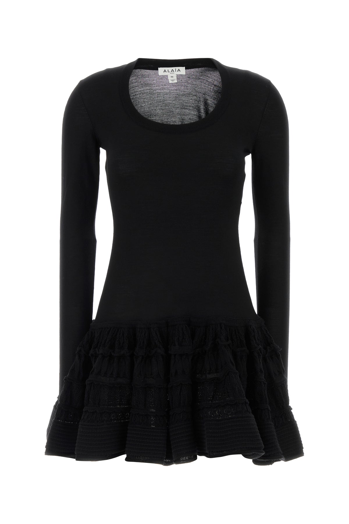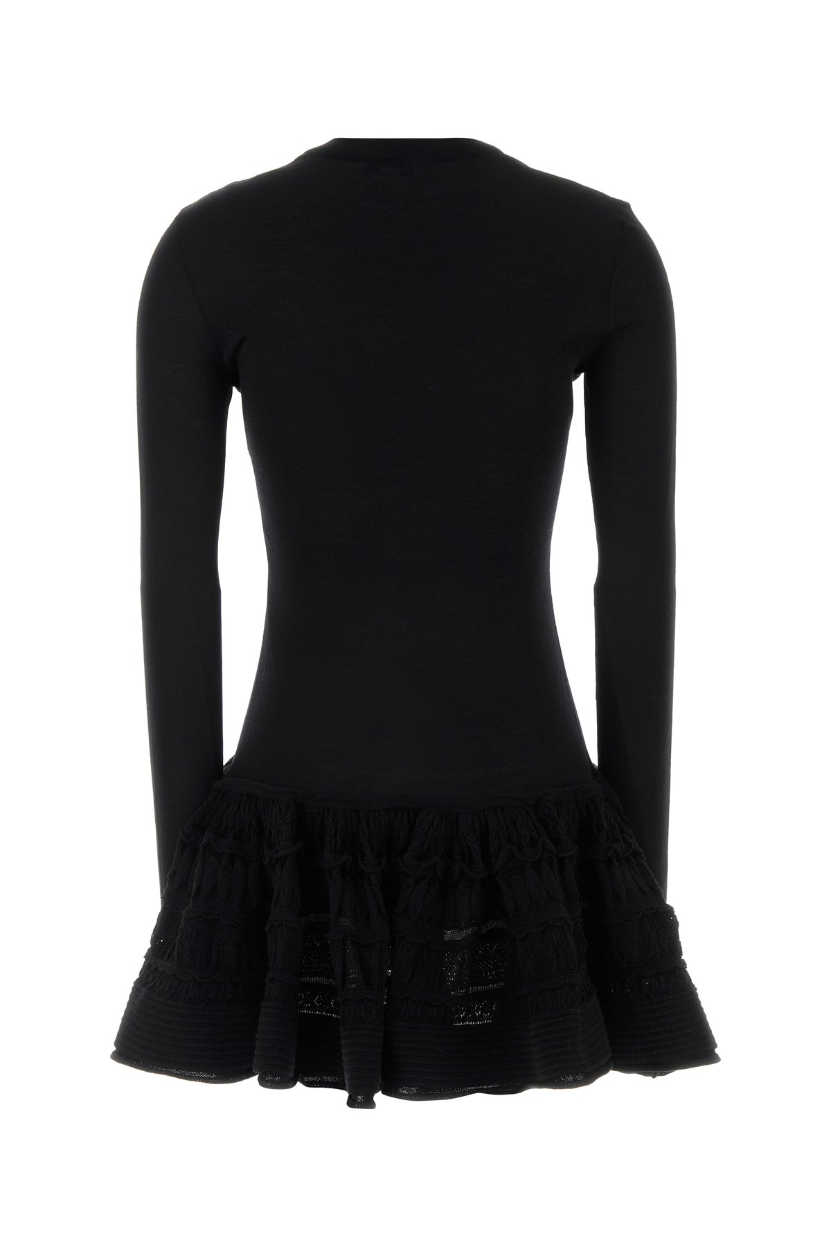Mini abito realizzato in misto lana stretch caratterizzato da volant sul fondo.