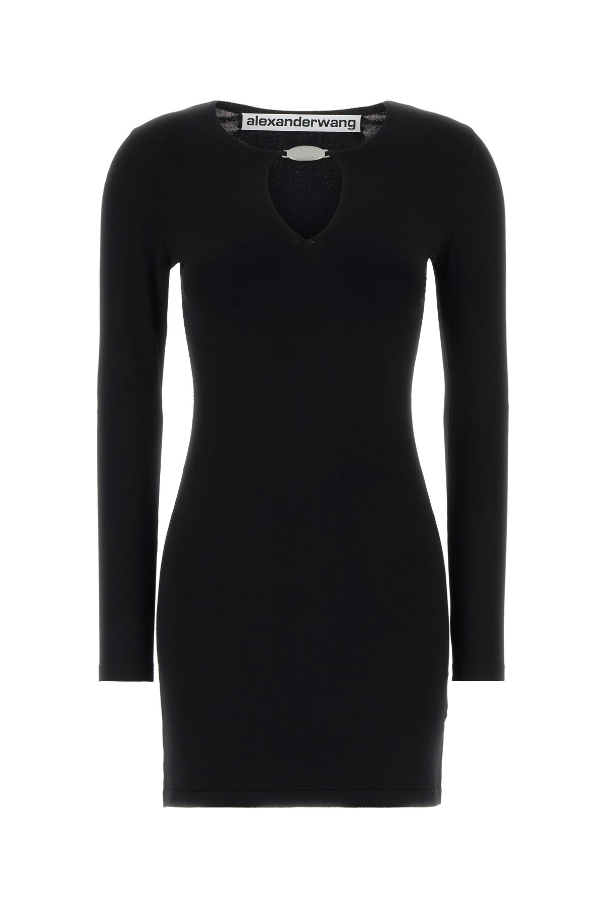 Mini abito aderente realizzato in misto viscosa stretch arricchito da targhetta metallica logata sulla scollatura.