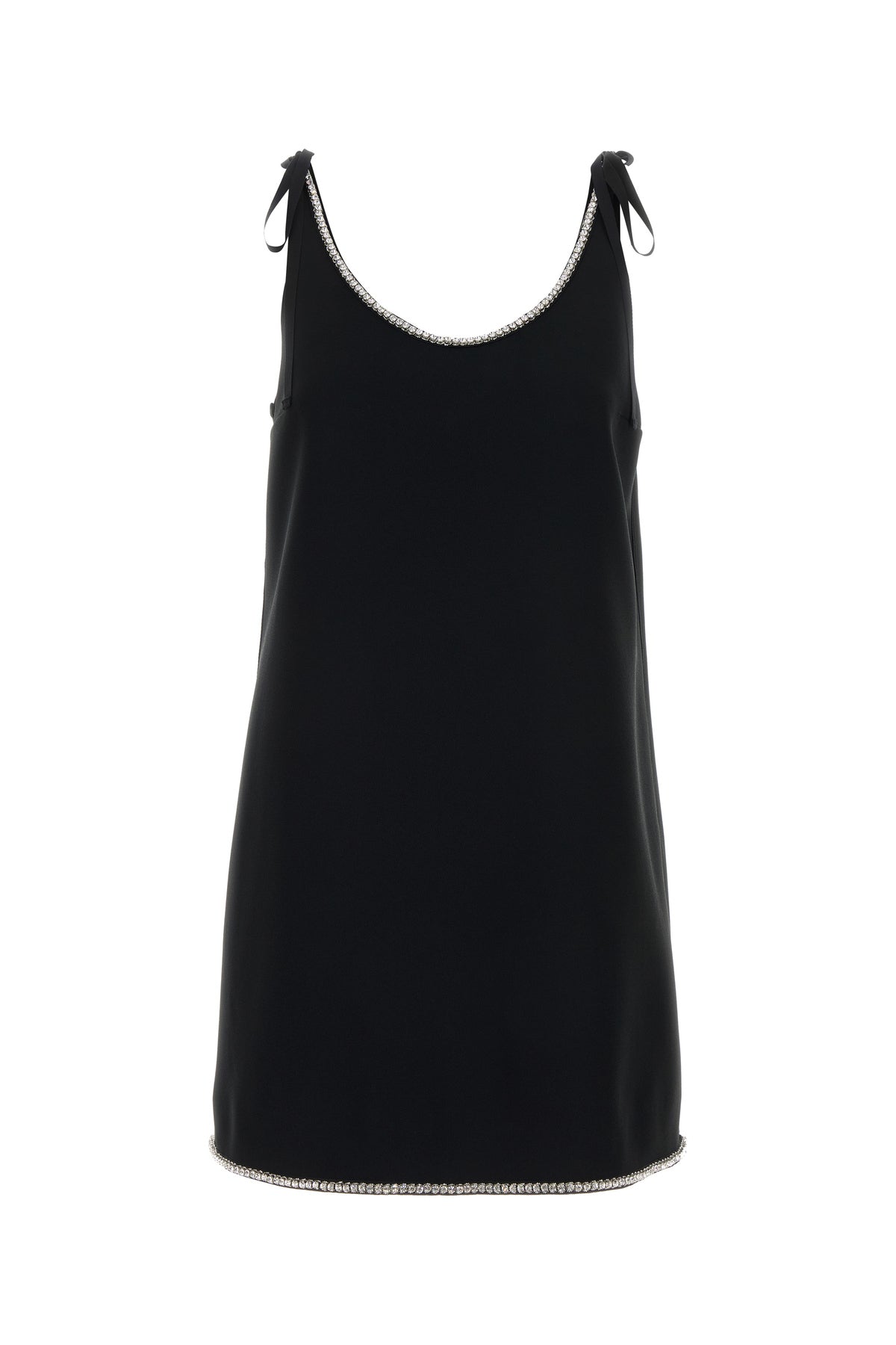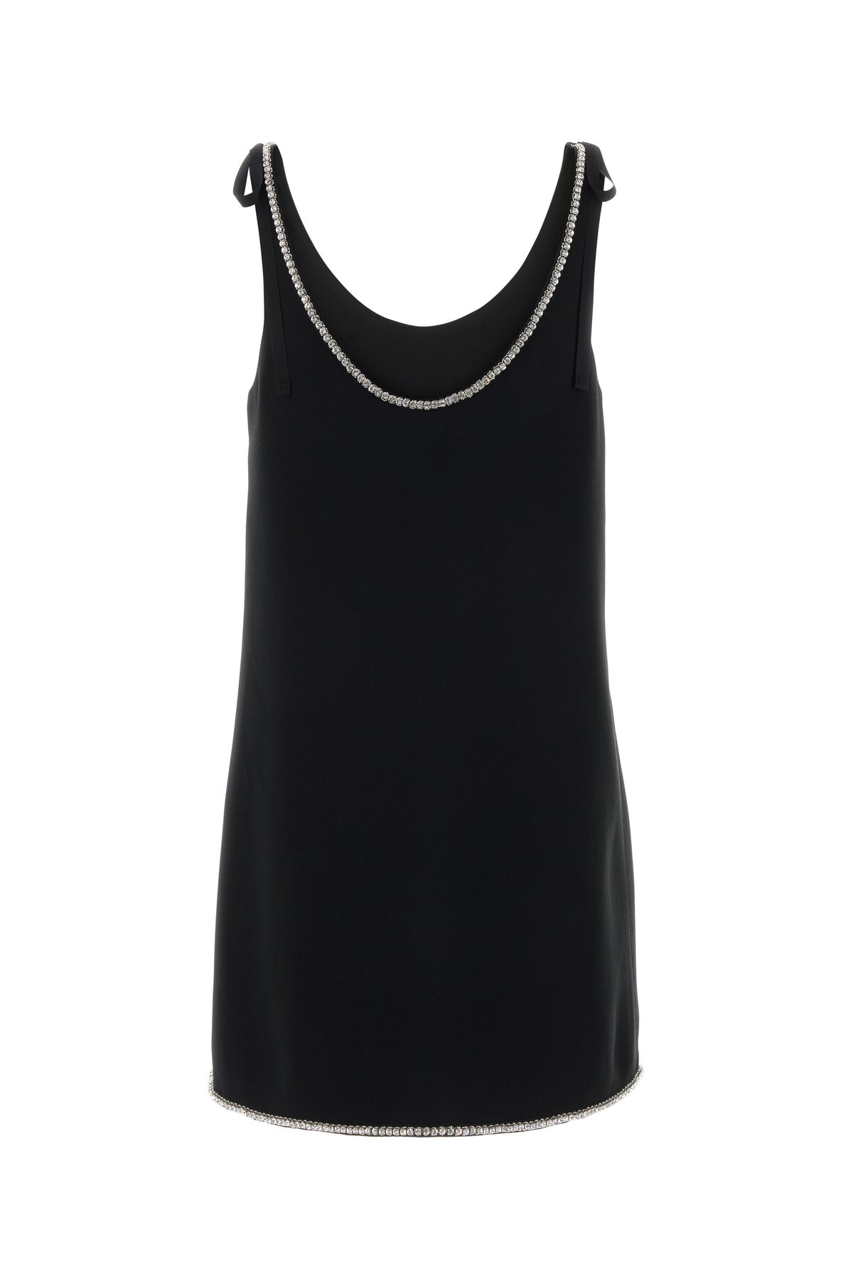 Mini abito realizzato in sablè arricchito da decorazioni gioiello sulla scollatura.