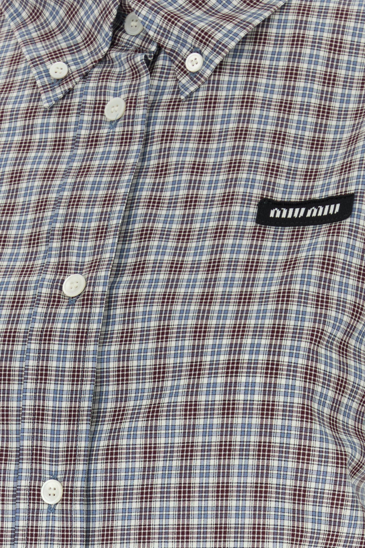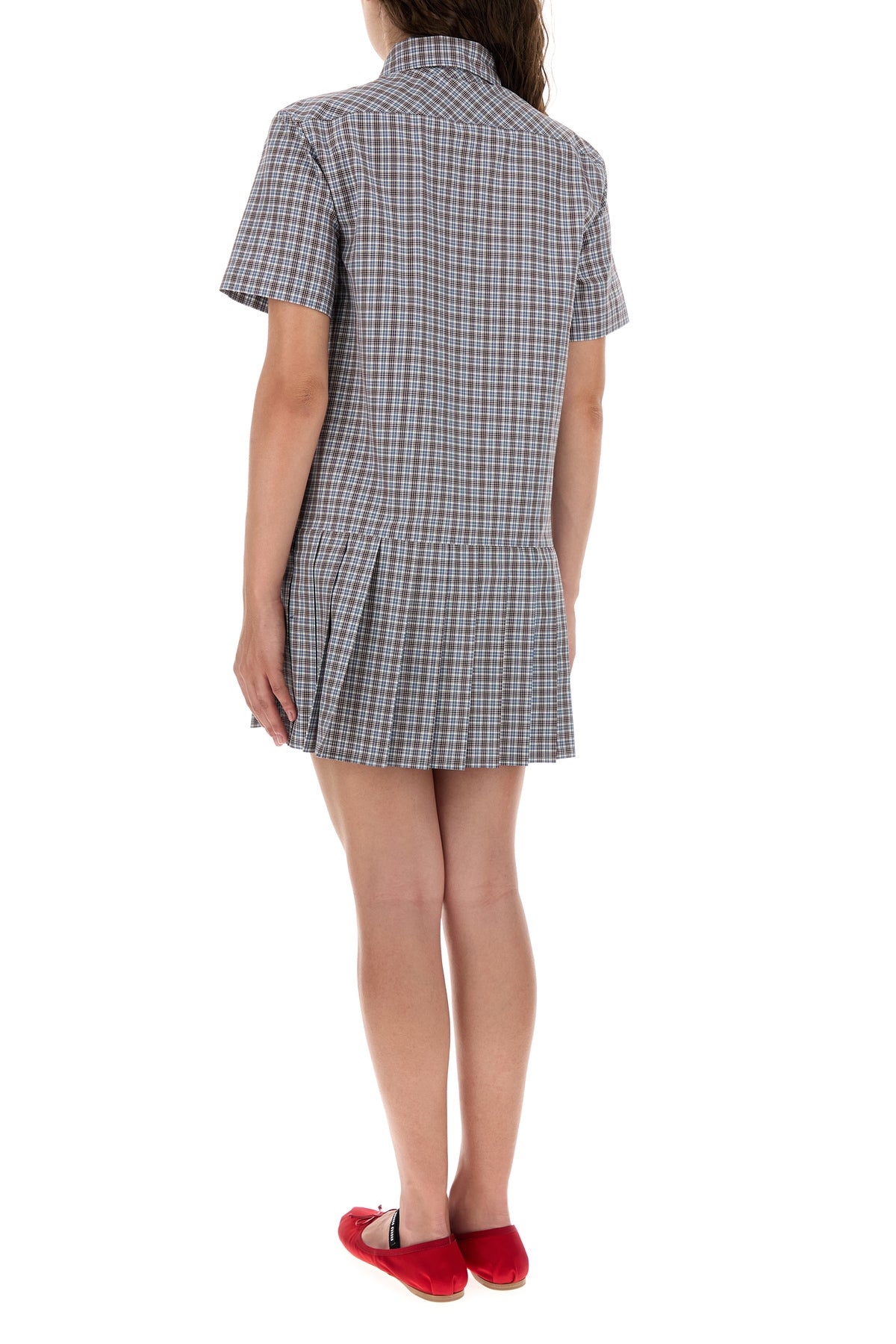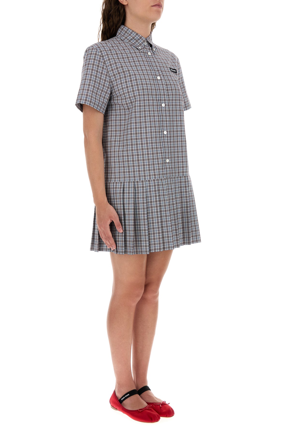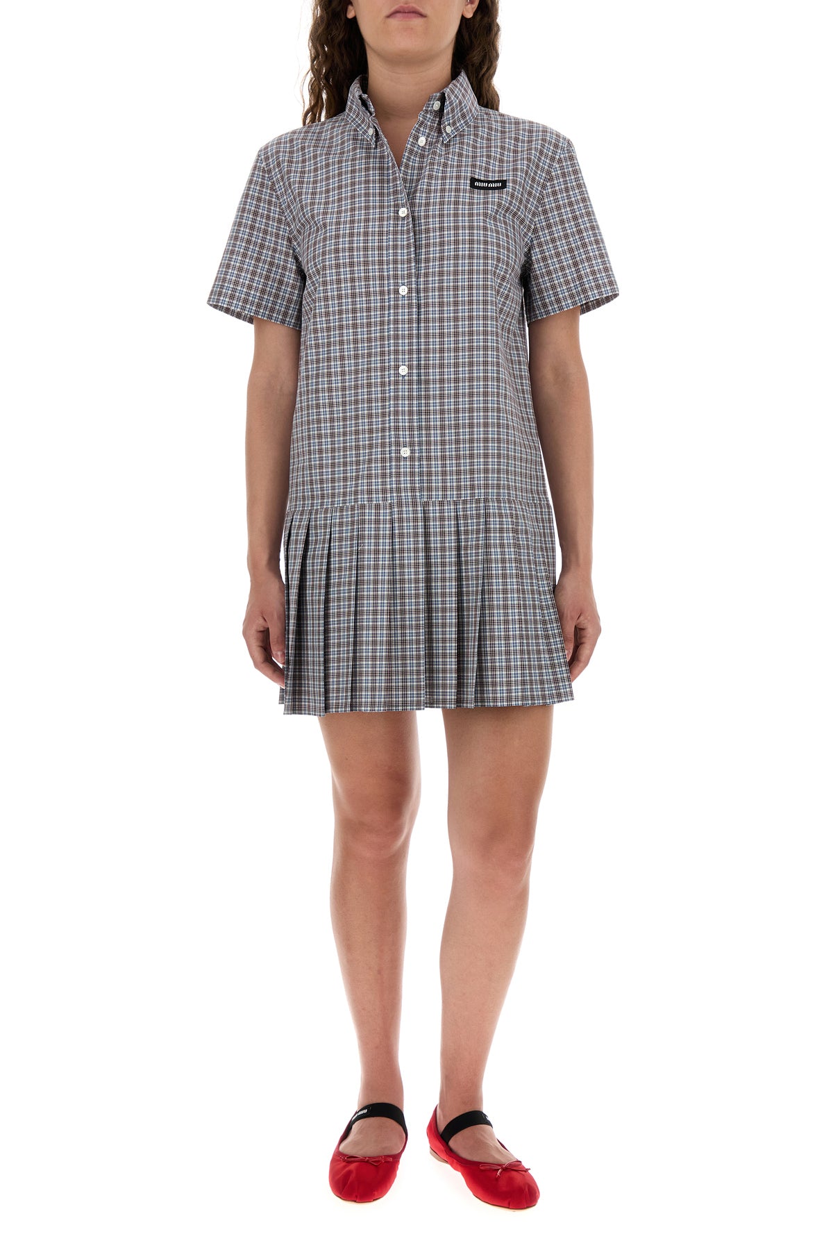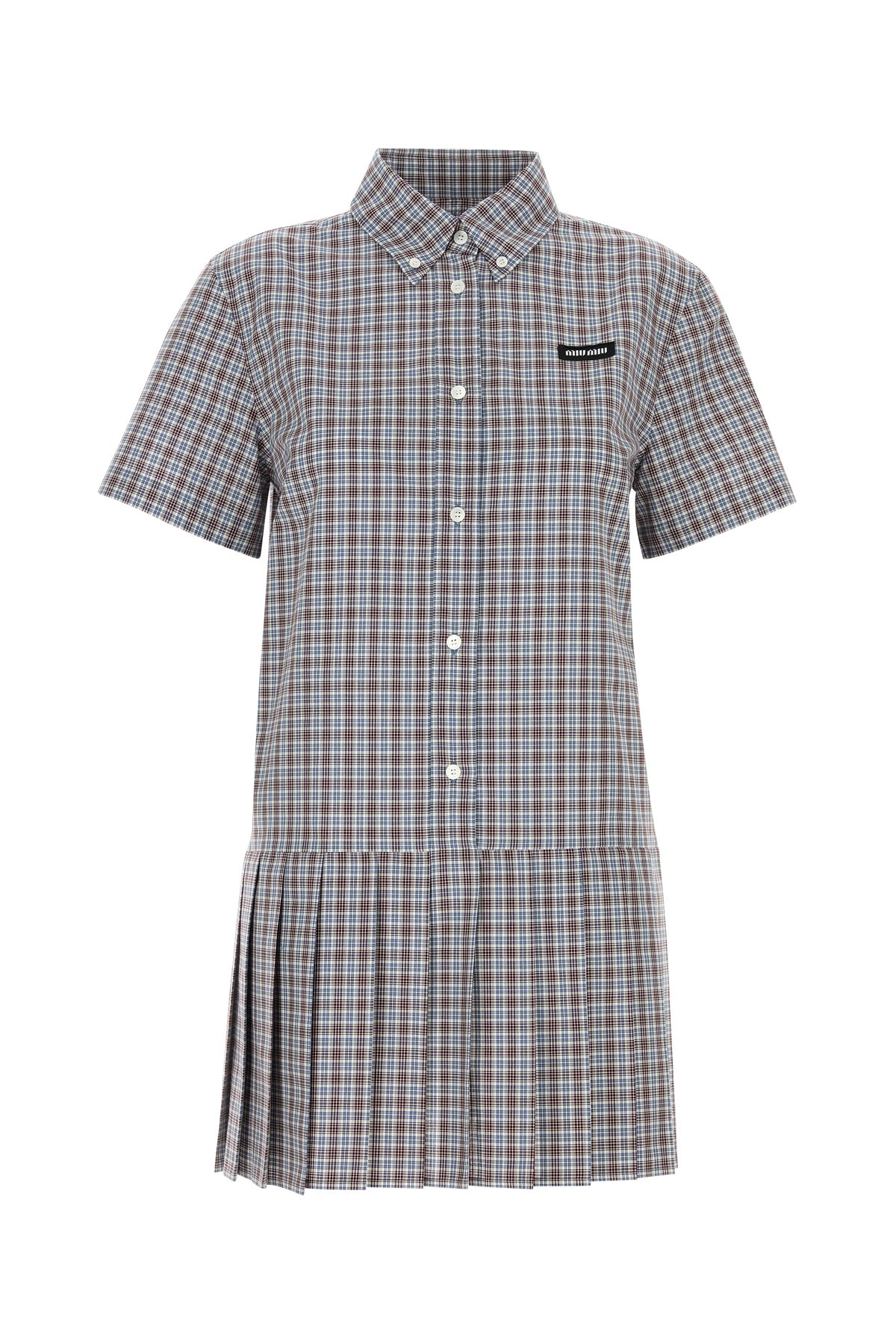 Mini abito chemisier realizzato in puro cotone caratterizzato da ricamo a quadri su tutta la superficie arricchito da etichetta logata sul petto.