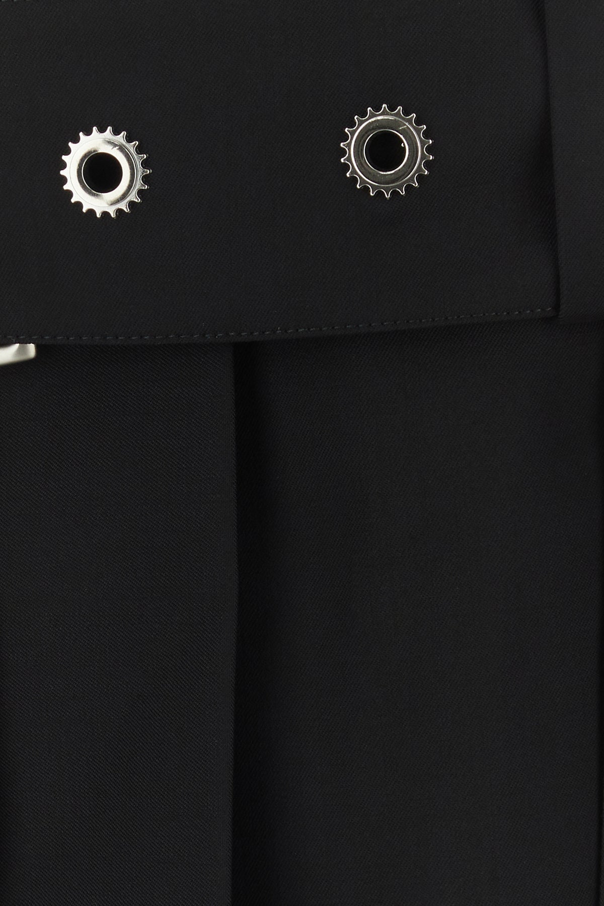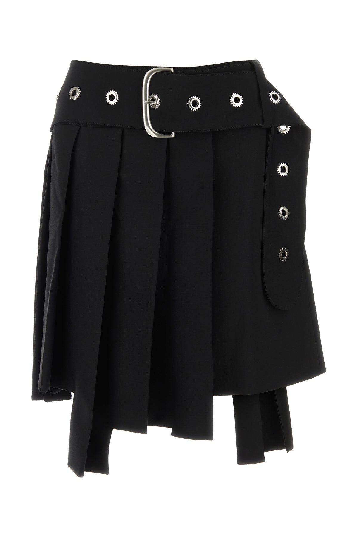 Minigonna plissettata realizzata in lana stretch arricchita da cintura regolabile con borchie metalliche.