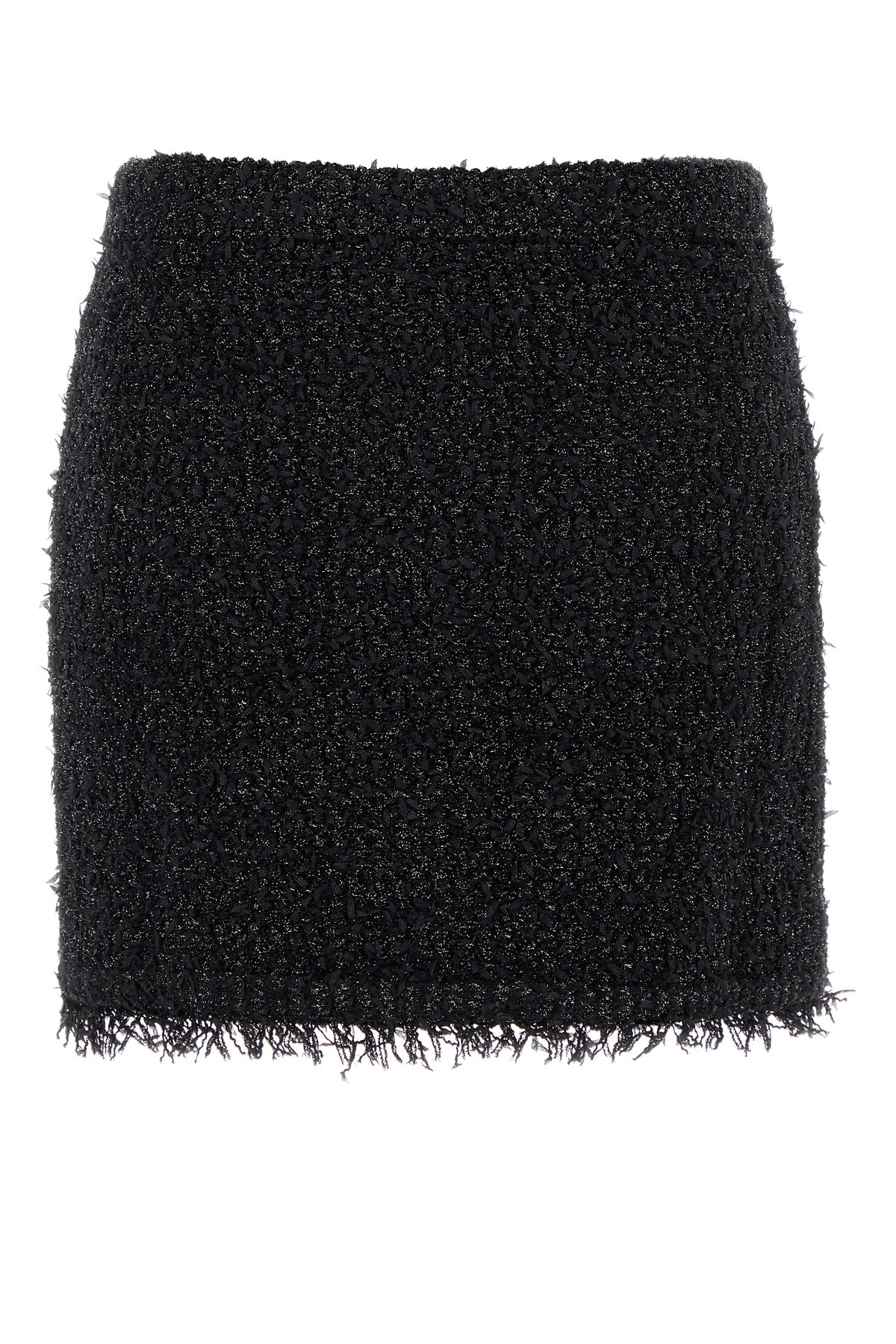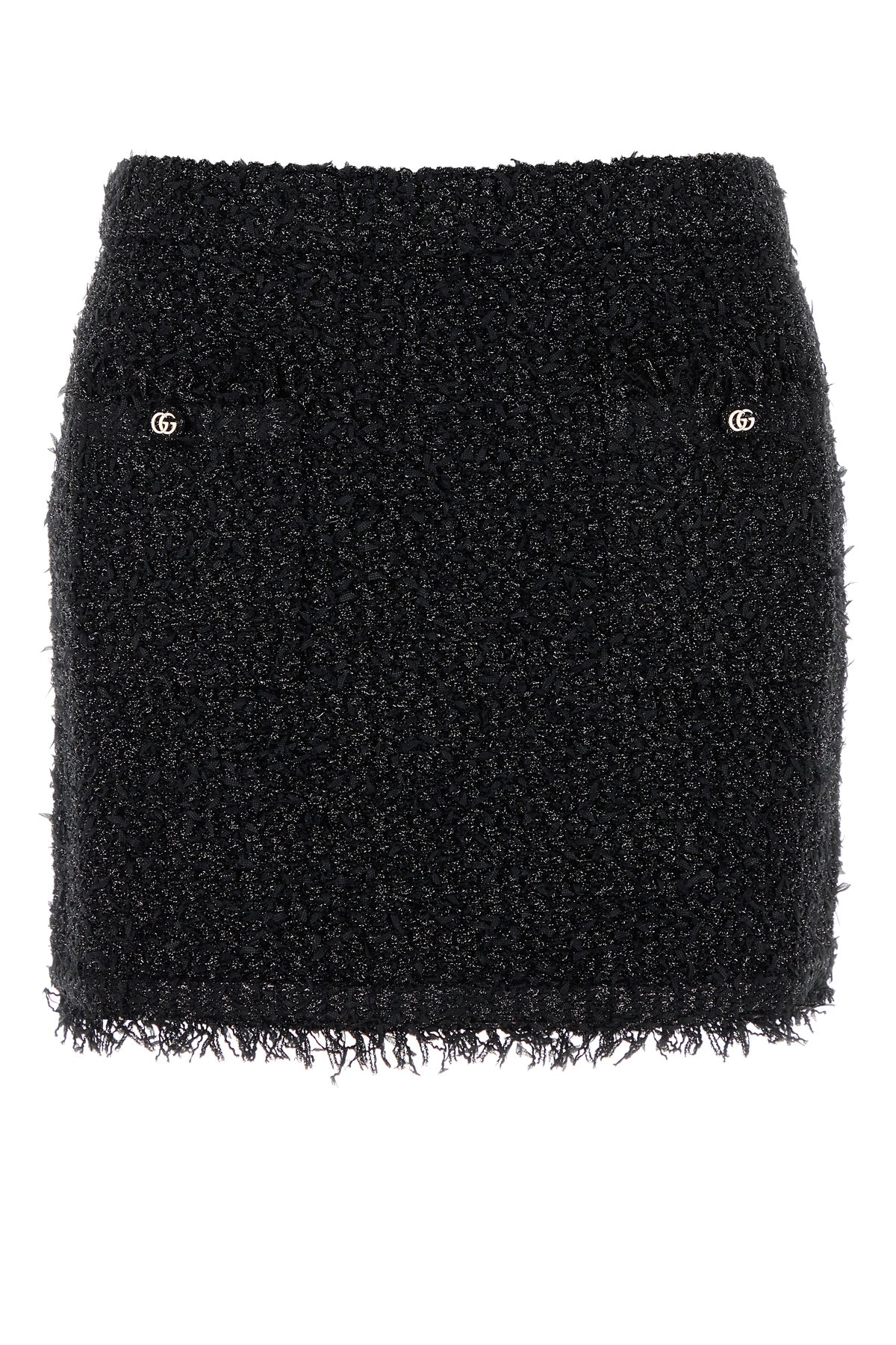 Minigonna realizzata in misto viscosa con fili di lurex arricchita da bottoni logati sulla parte frontale.