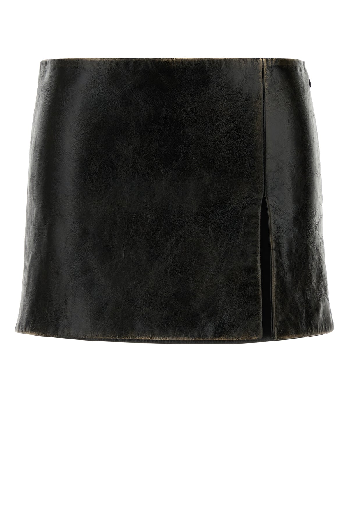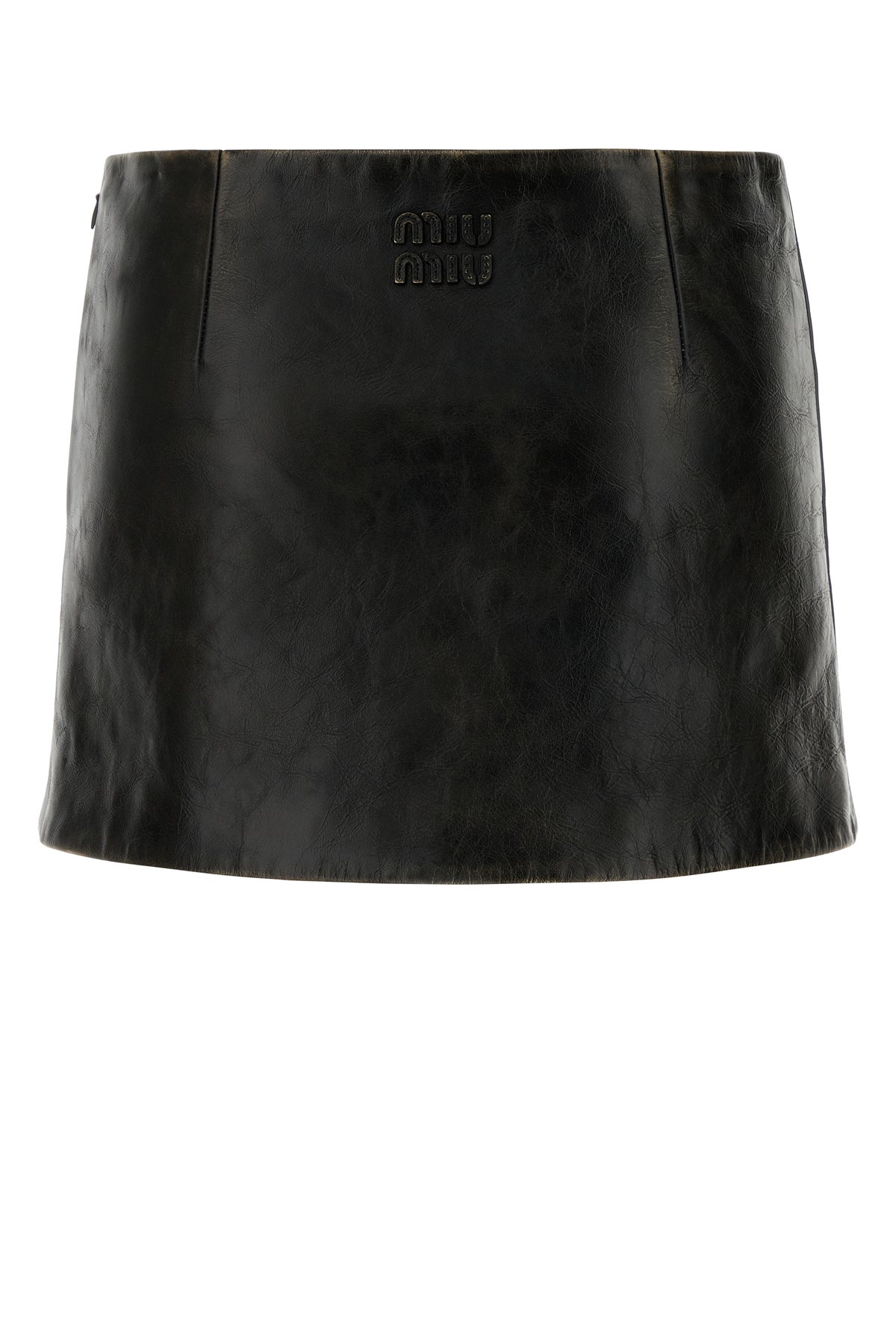 Minigonna realizzata in pelle di vitello ad effetto vintage arricchita da applicazione logata sul retro.