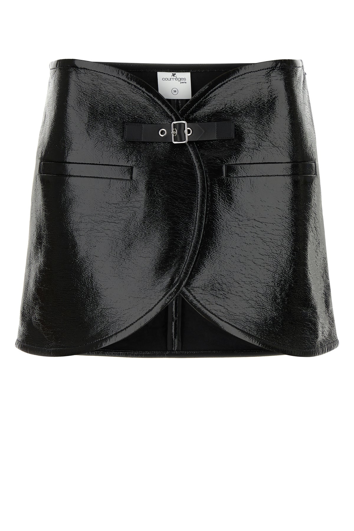 Minigonna realizzata in vinile arricchita da cinturino regolabile tonale sulla parte frontale.