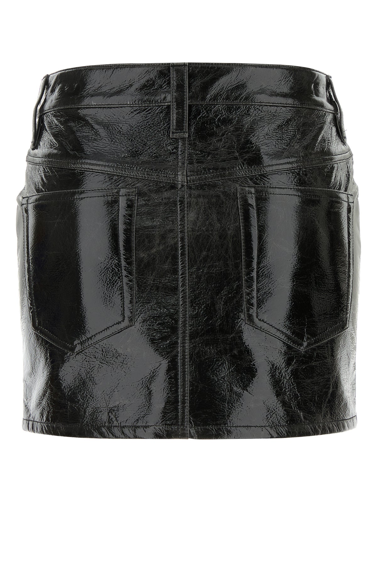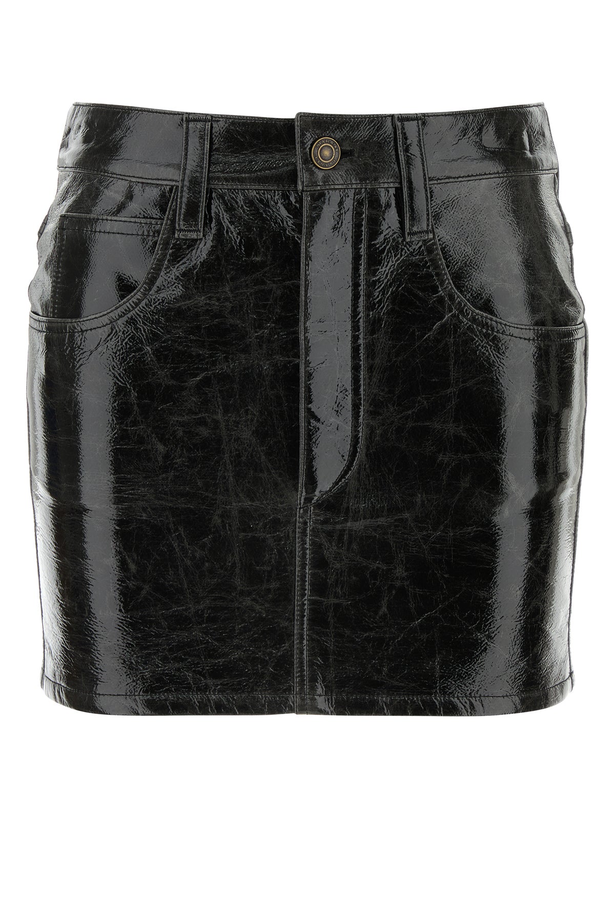 Minigonna realizzata in similpelle effetto stropicciato e vintage dal finish lucido.