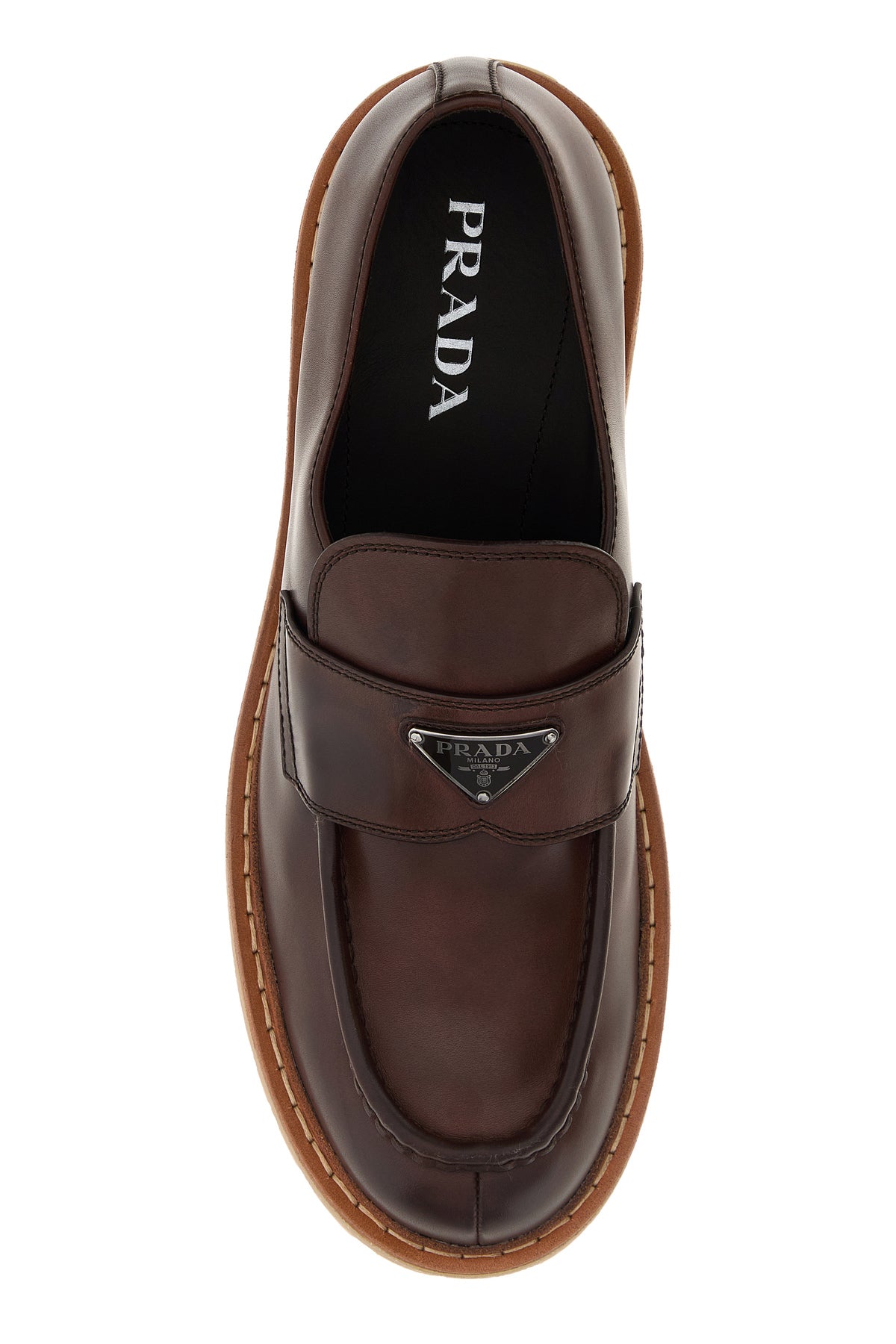 Mocassini realizzati in pelle di vitello leggermente martellata arricchiti da iconico triangolo metallico logato sulla mascherina.