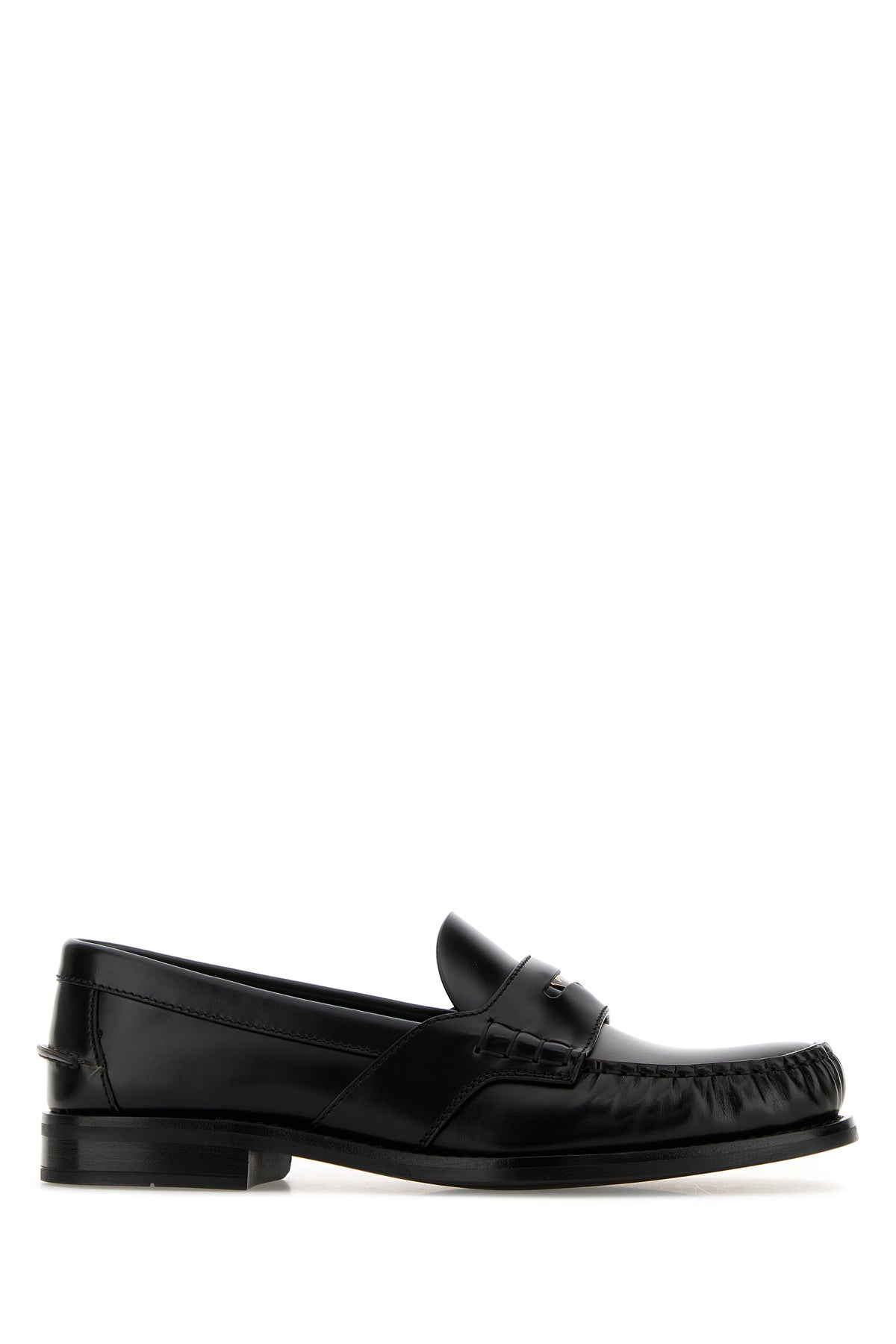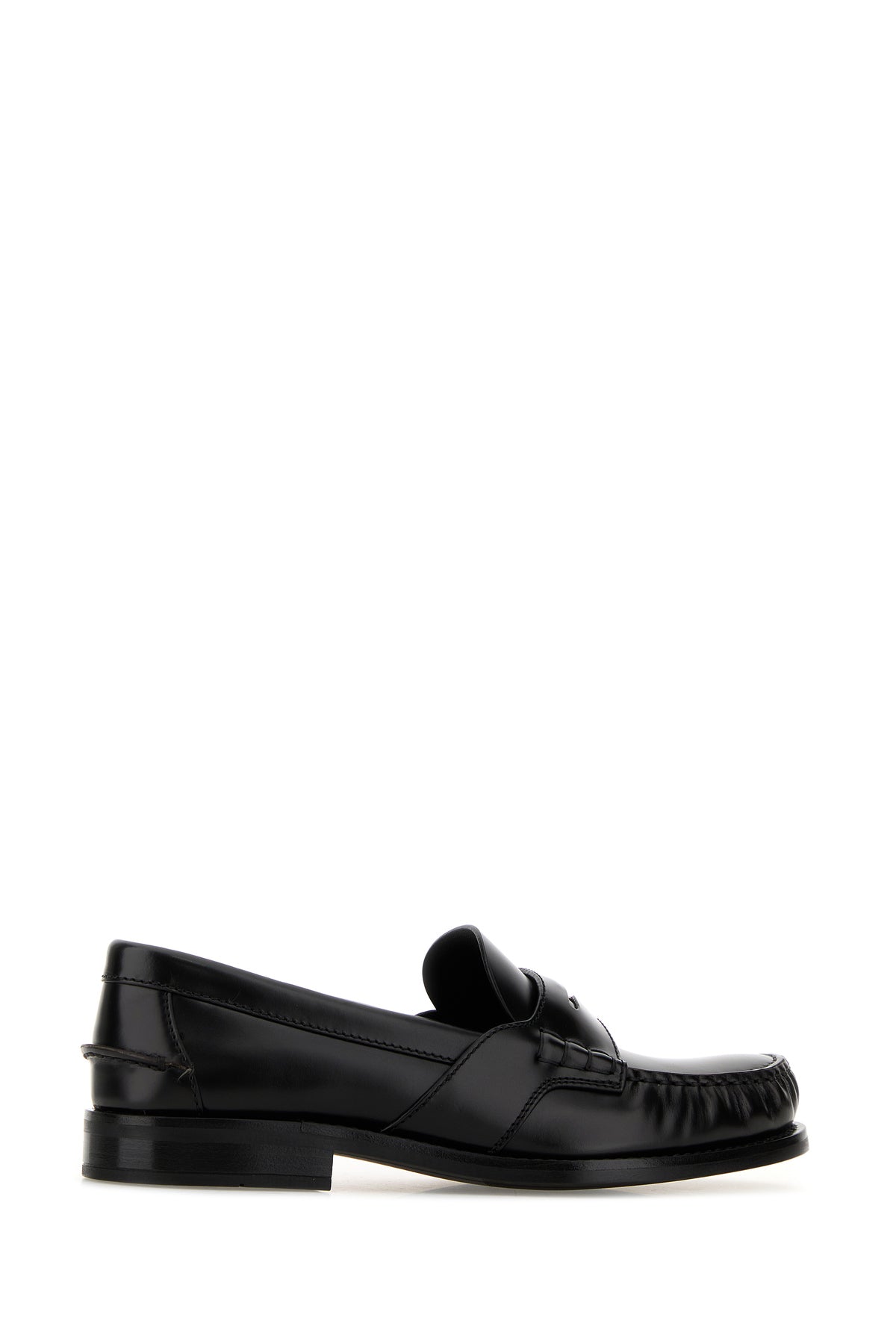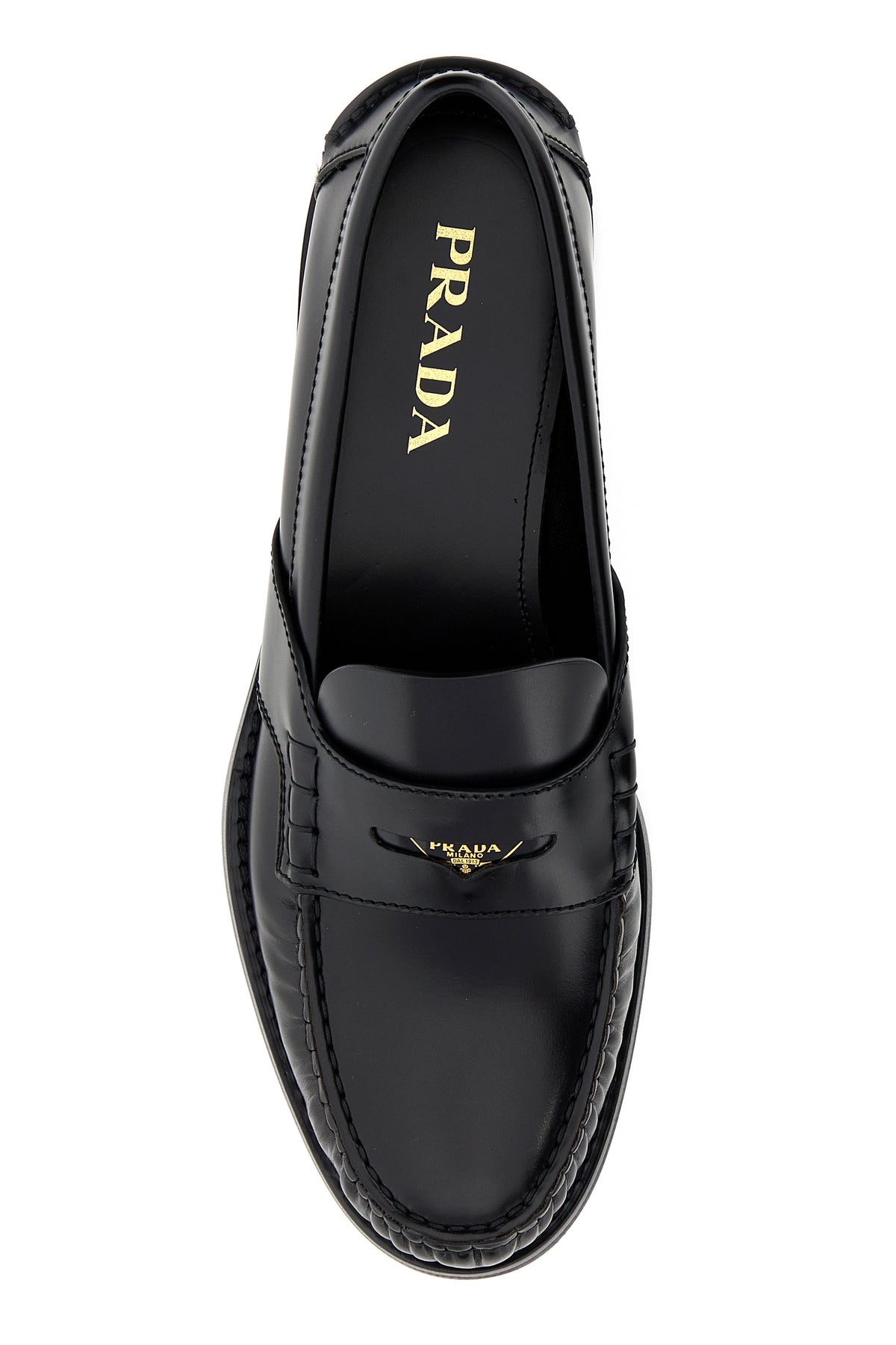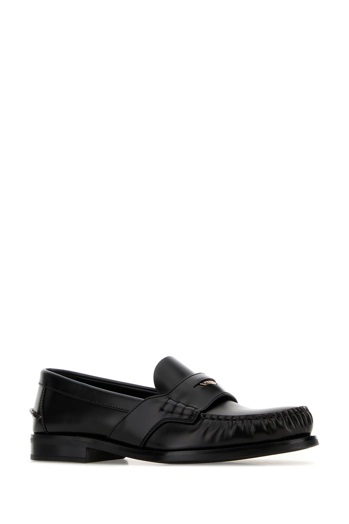 Mocassini realizzati in pelle liscia arricchiti da iconico triangolo metallico logato sulla mascherina.