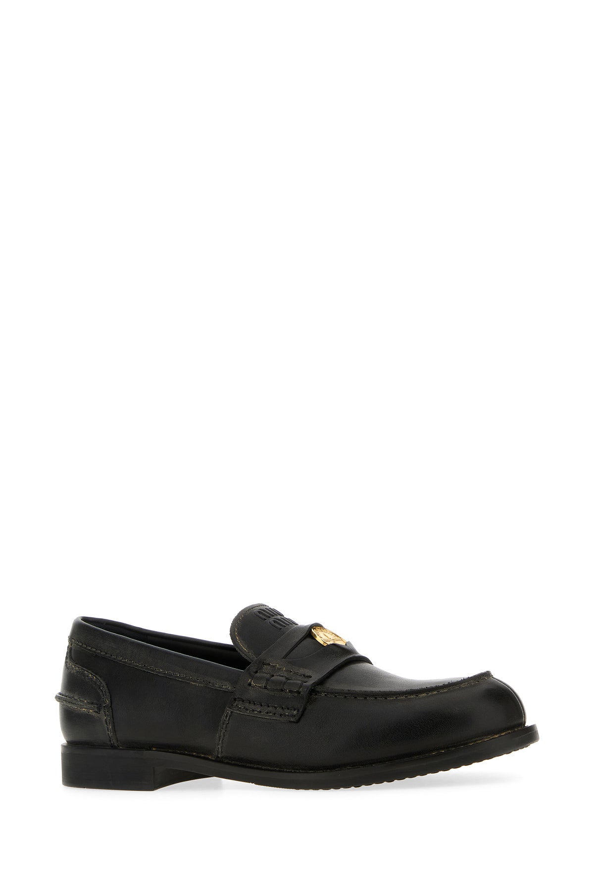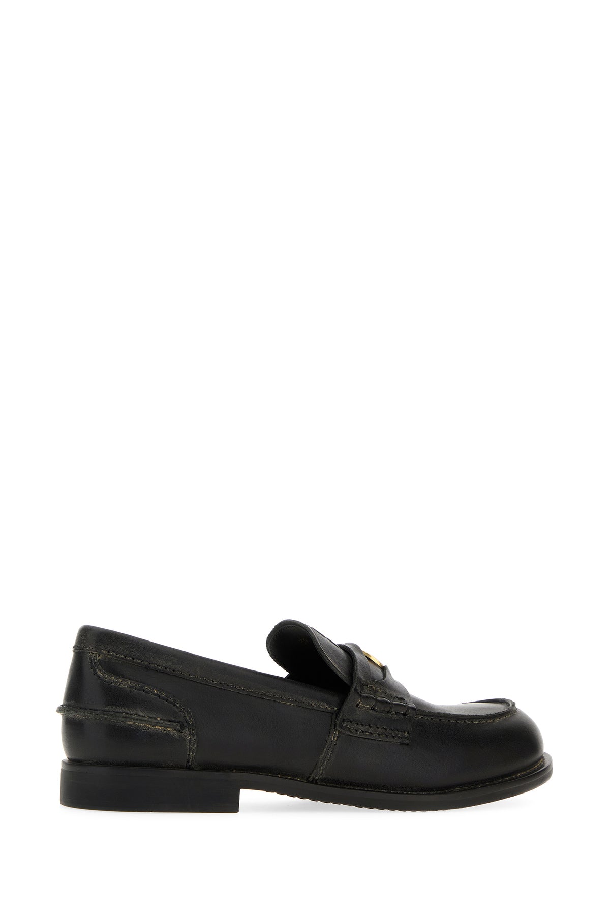 Mocassini realizzati in pelle ad effetto vintage caratterizzati da logo in rilievo sul collo del piede arricchiti da dettaglio metallico logato sulla mascherina.