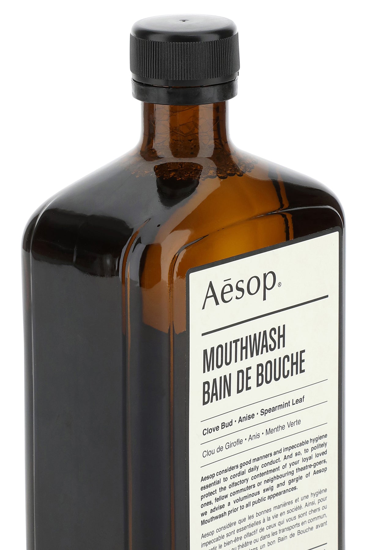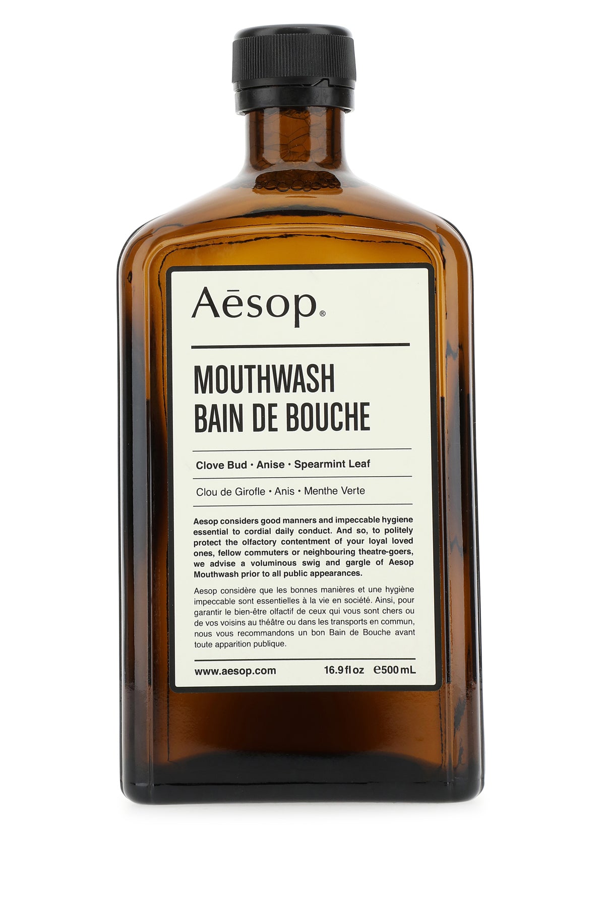Collutorio caratterizzato da flacone in vetro arricchito da etichette logate.