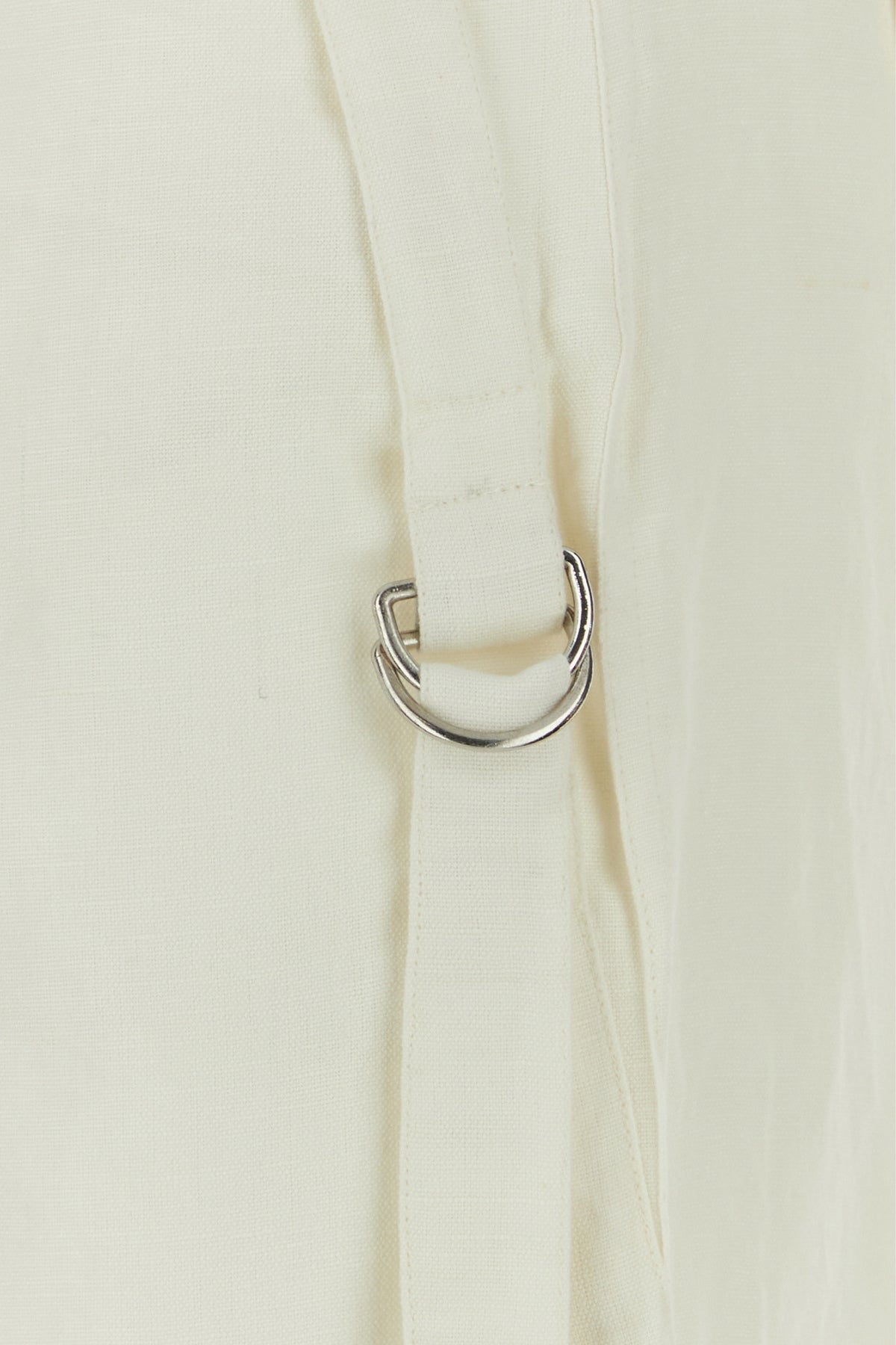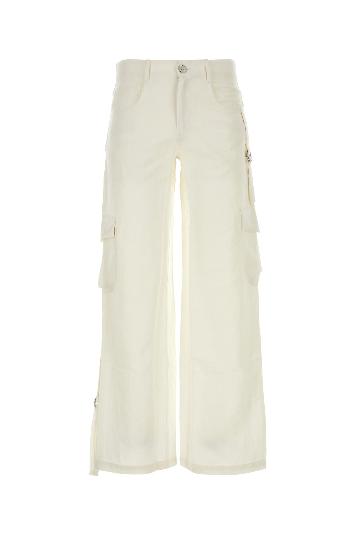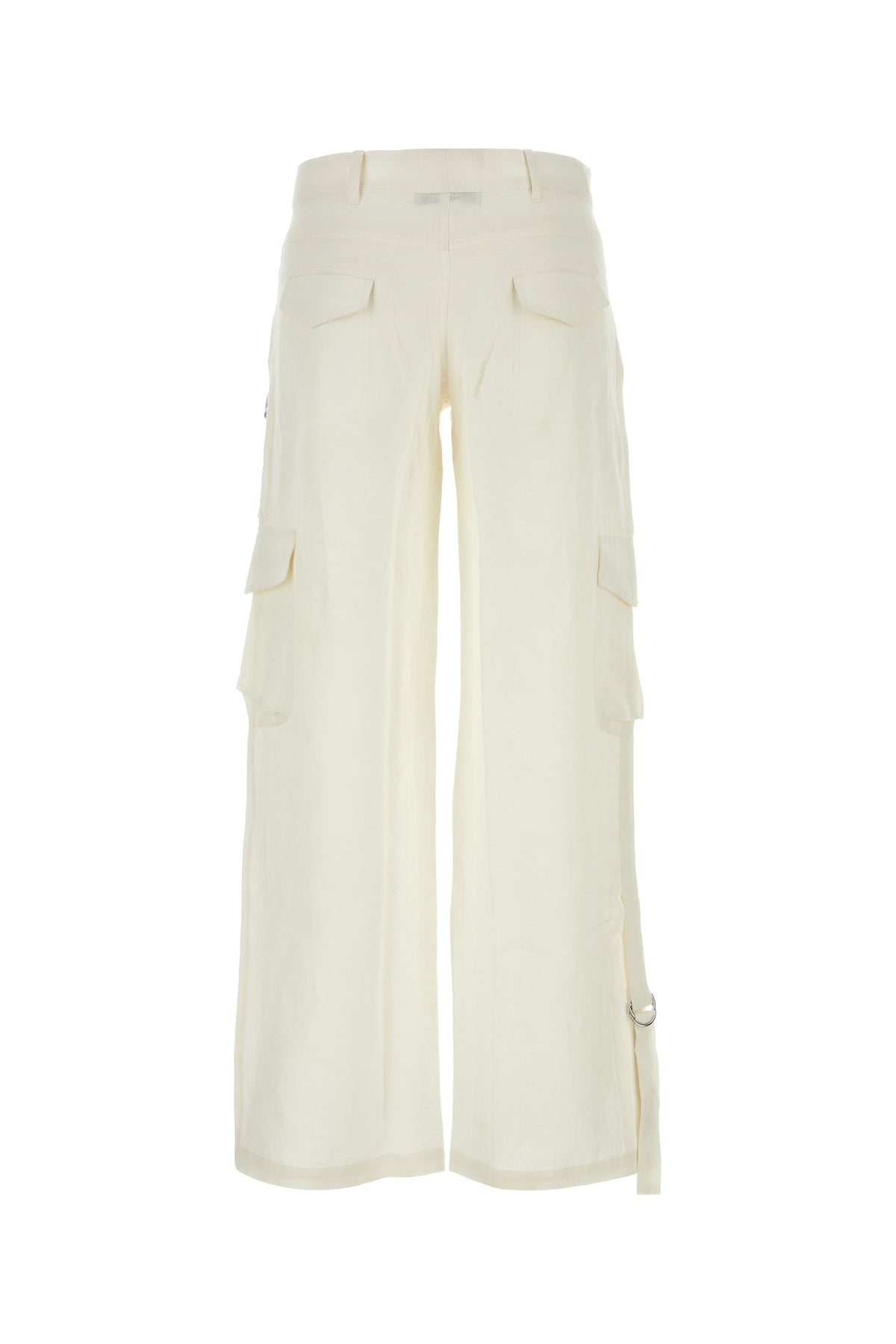 Pantalone cargo realizzato in cotone e lino arricchito da cinturini regolabili sui lati.