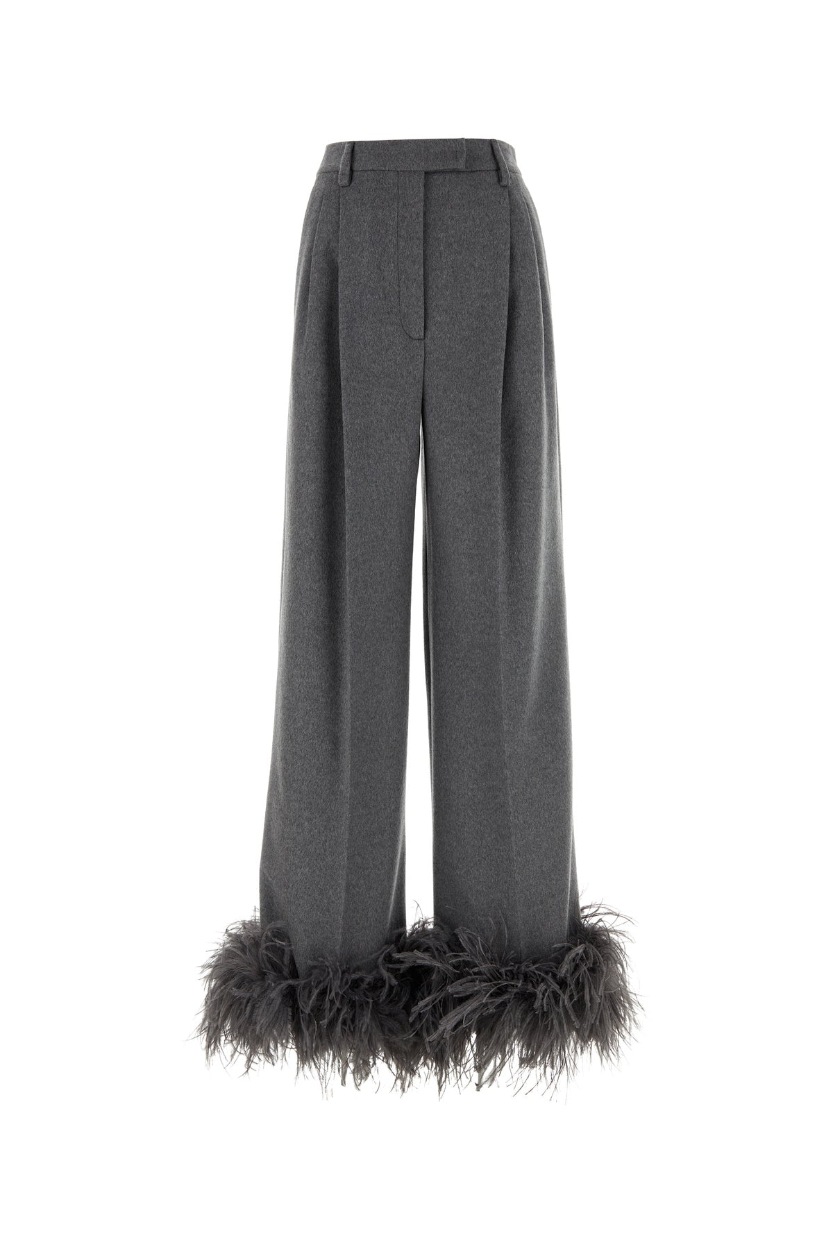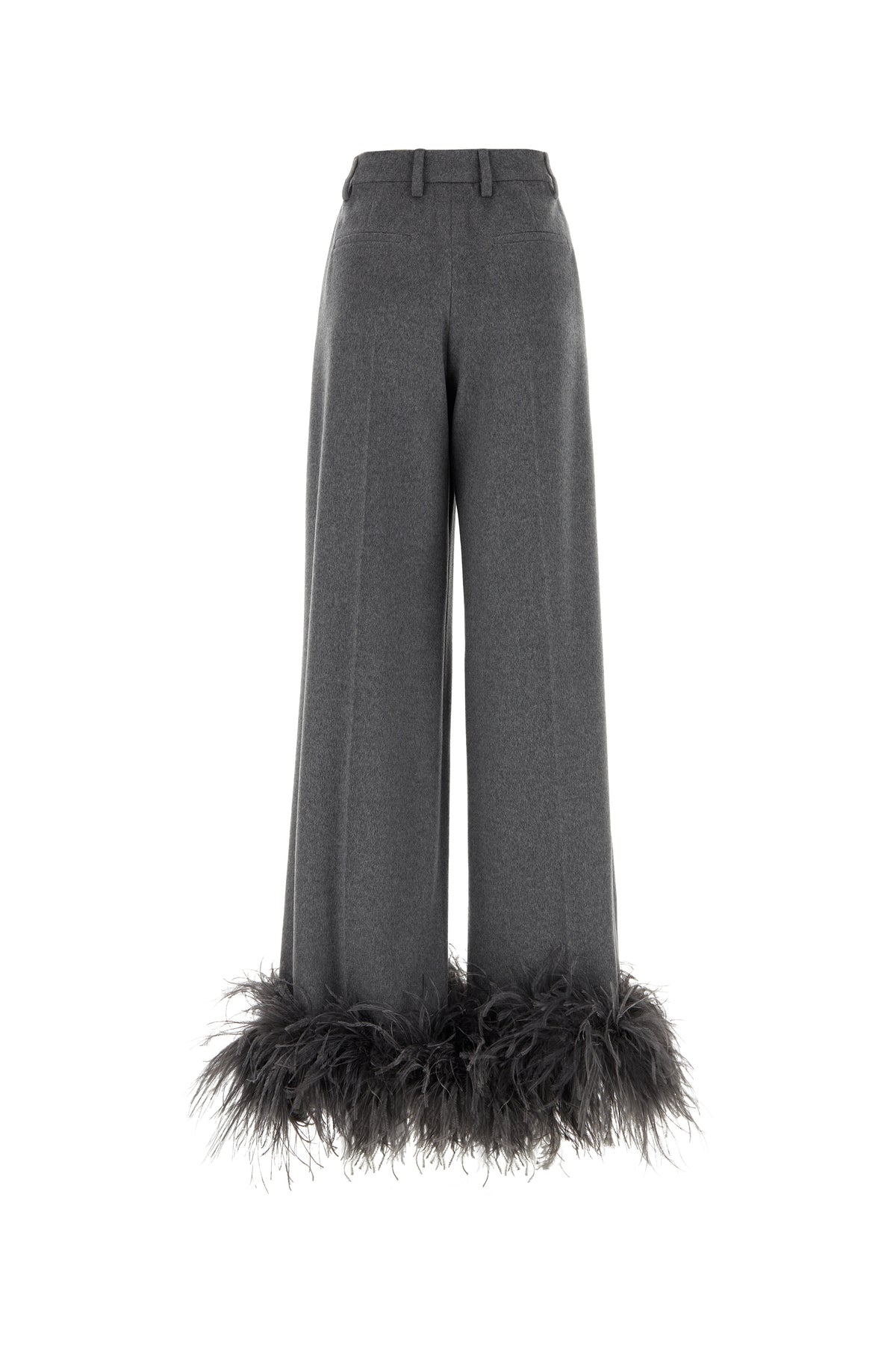 Pantalone dalla gamba ampia realizzato in puro cashmere arricchito da inserti in piume tonali sul fondo.