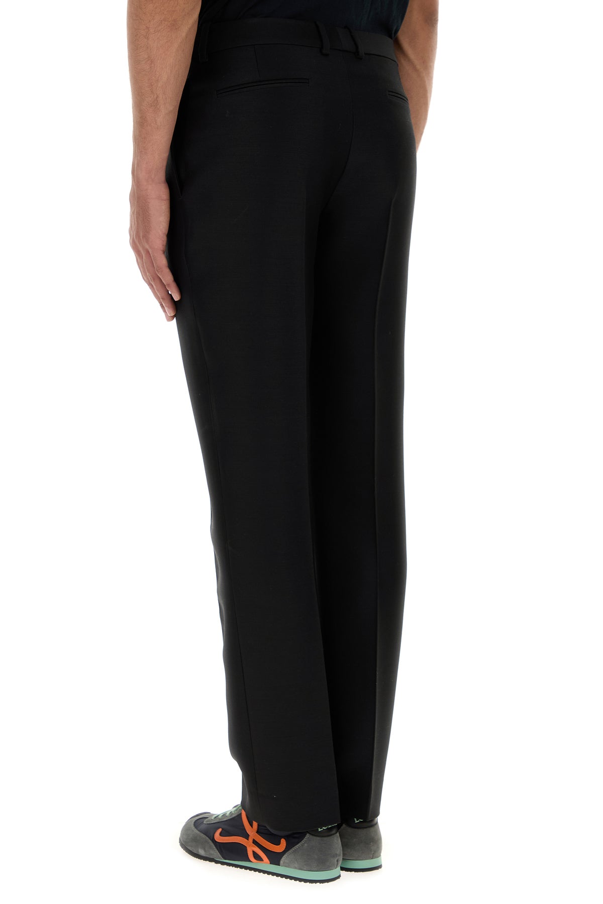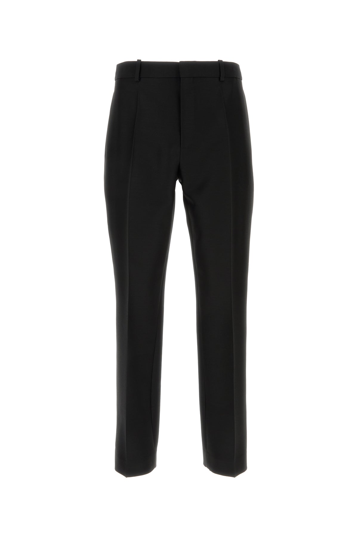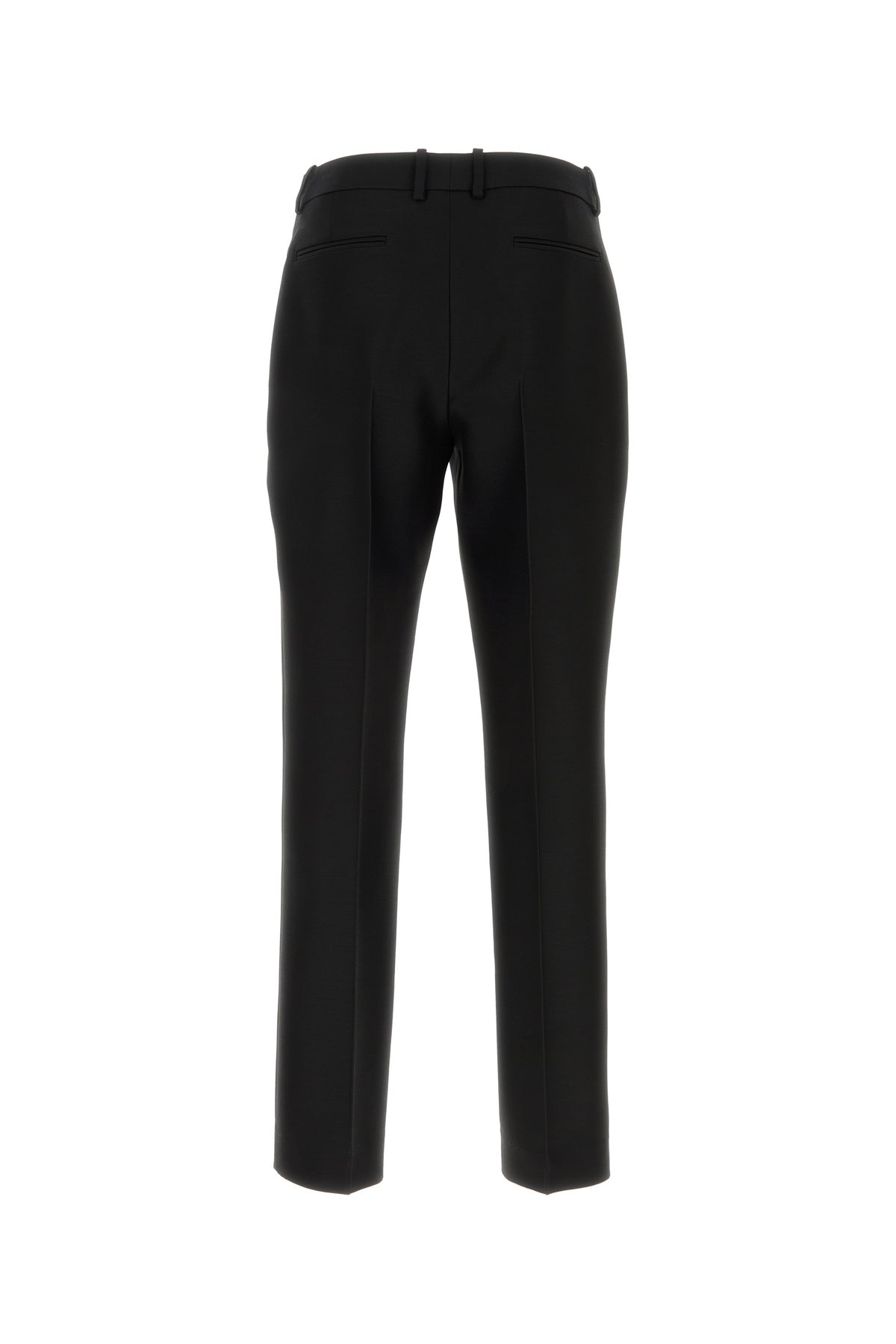 Pantalone realizzato in lana e seta caratterizzato da pieghe centrali stirate.