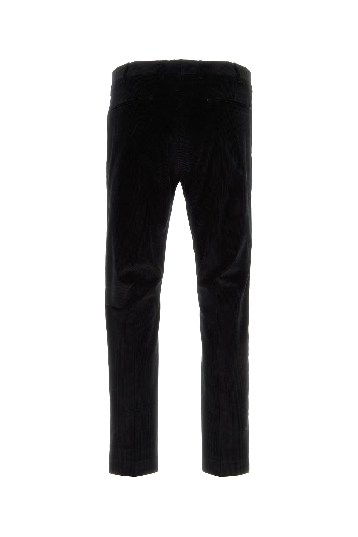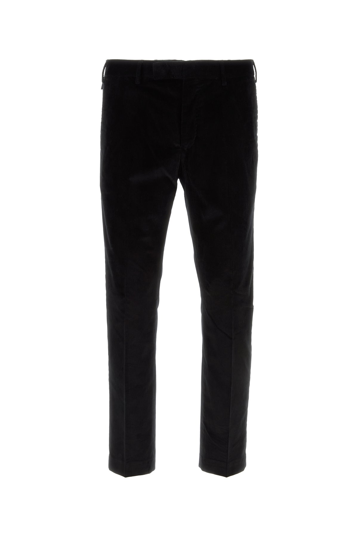 Pantalone realizzato in velluto a coste di cotone stretch caratterizzato da pieghe centrali stirate.