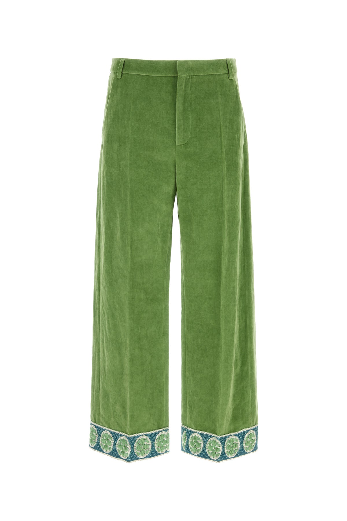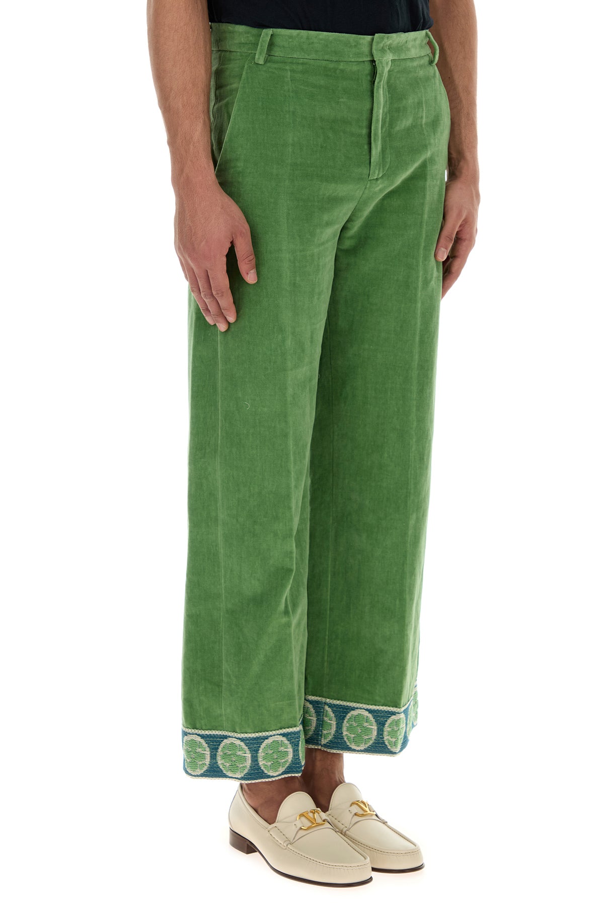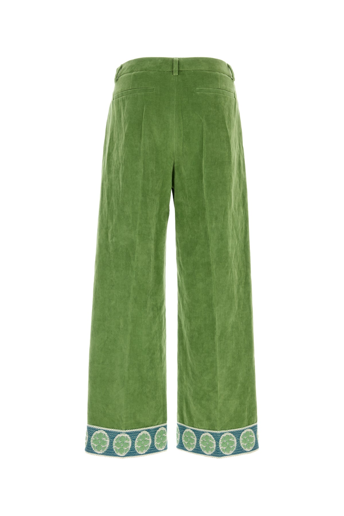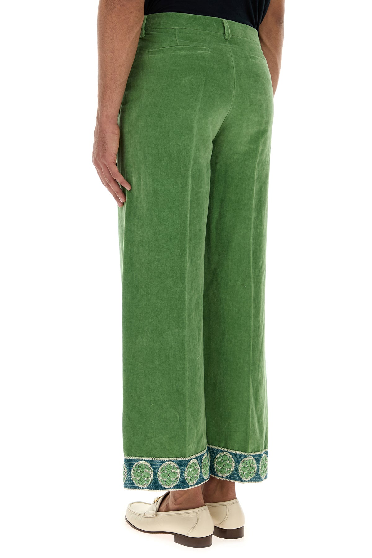 Pantalone realizzato in velluto di cotone e lino caratterizzato da particolari ricami sul fondo.