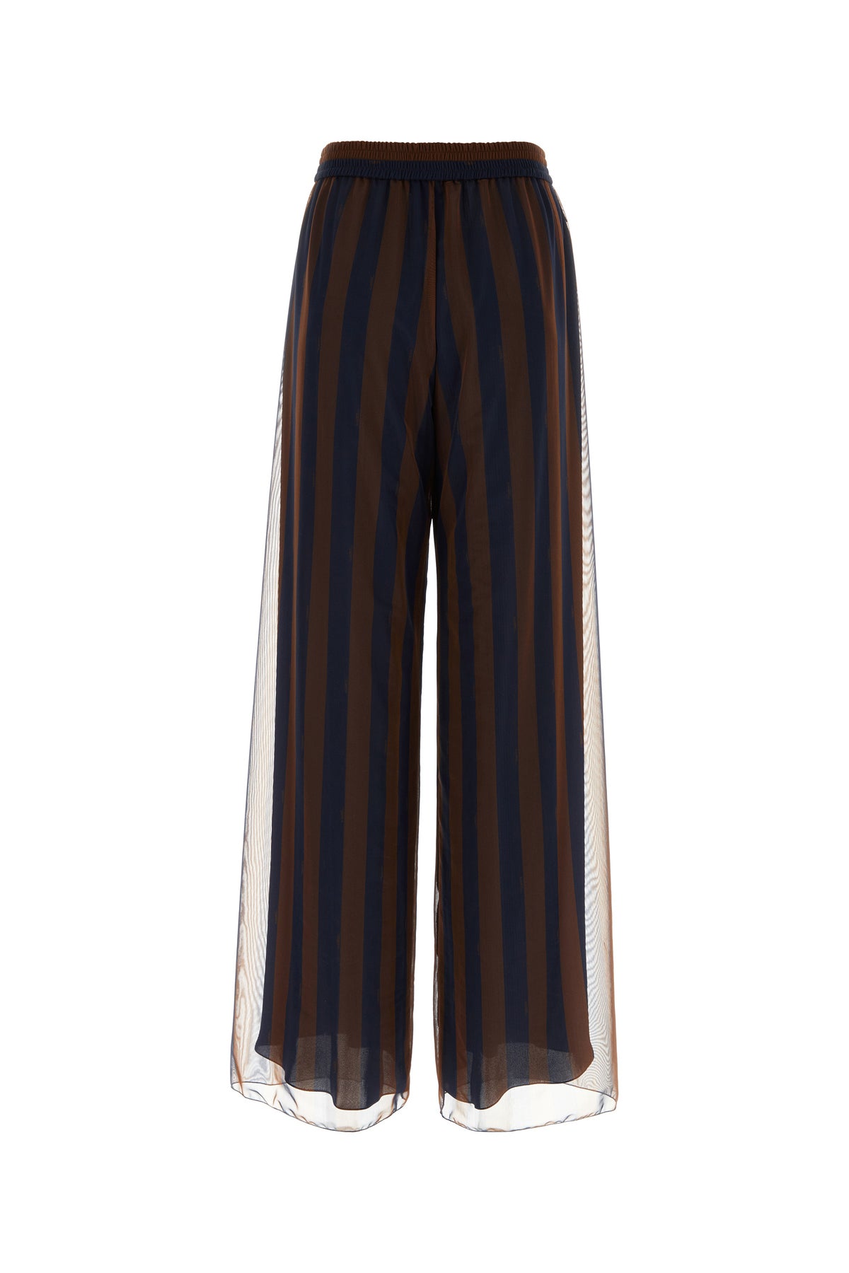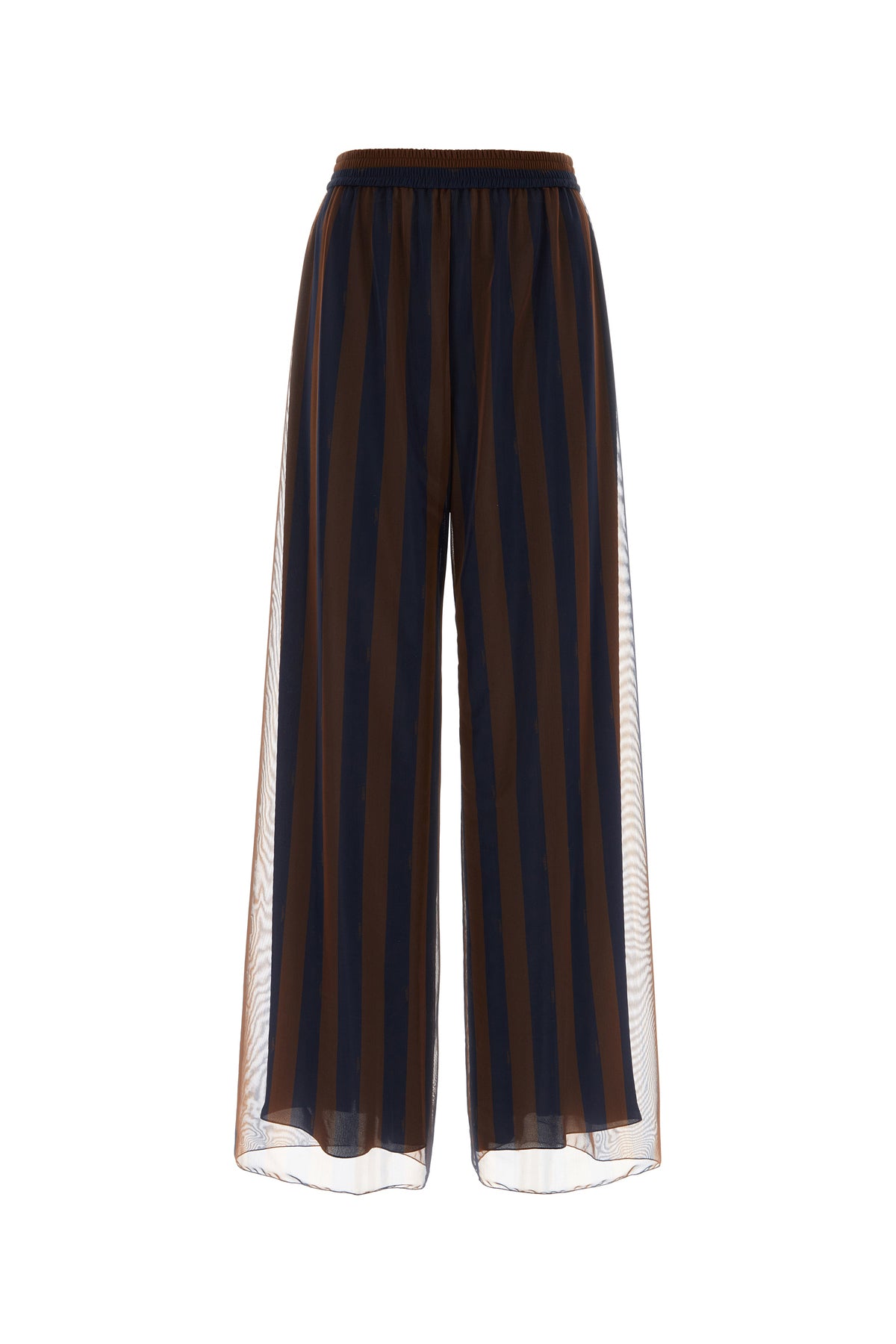 Pantalone palazzo realizzato in pura seta caratterizzato da stampa a righe su tutta la superficie.