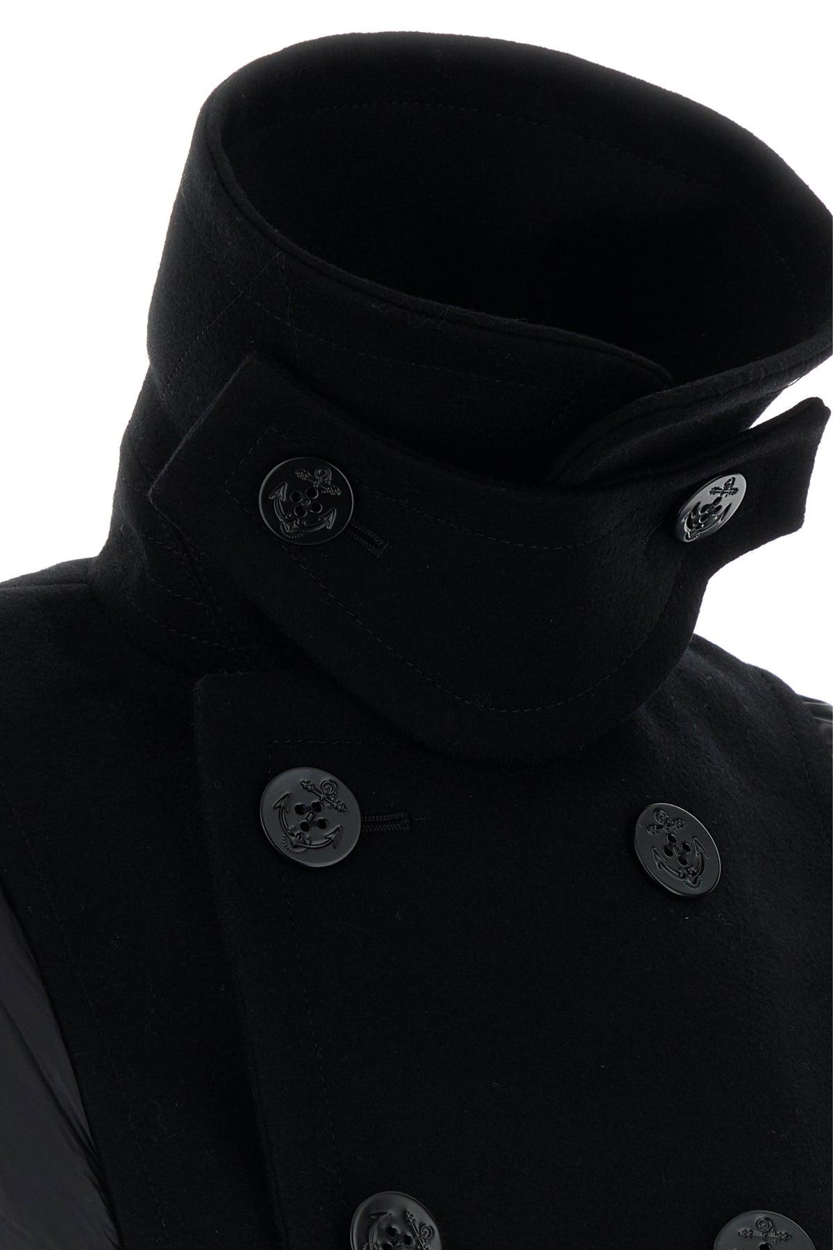 Piumino realizzato in nylon con inserto in lana sulla parte frontale caratterizzato da colletto.