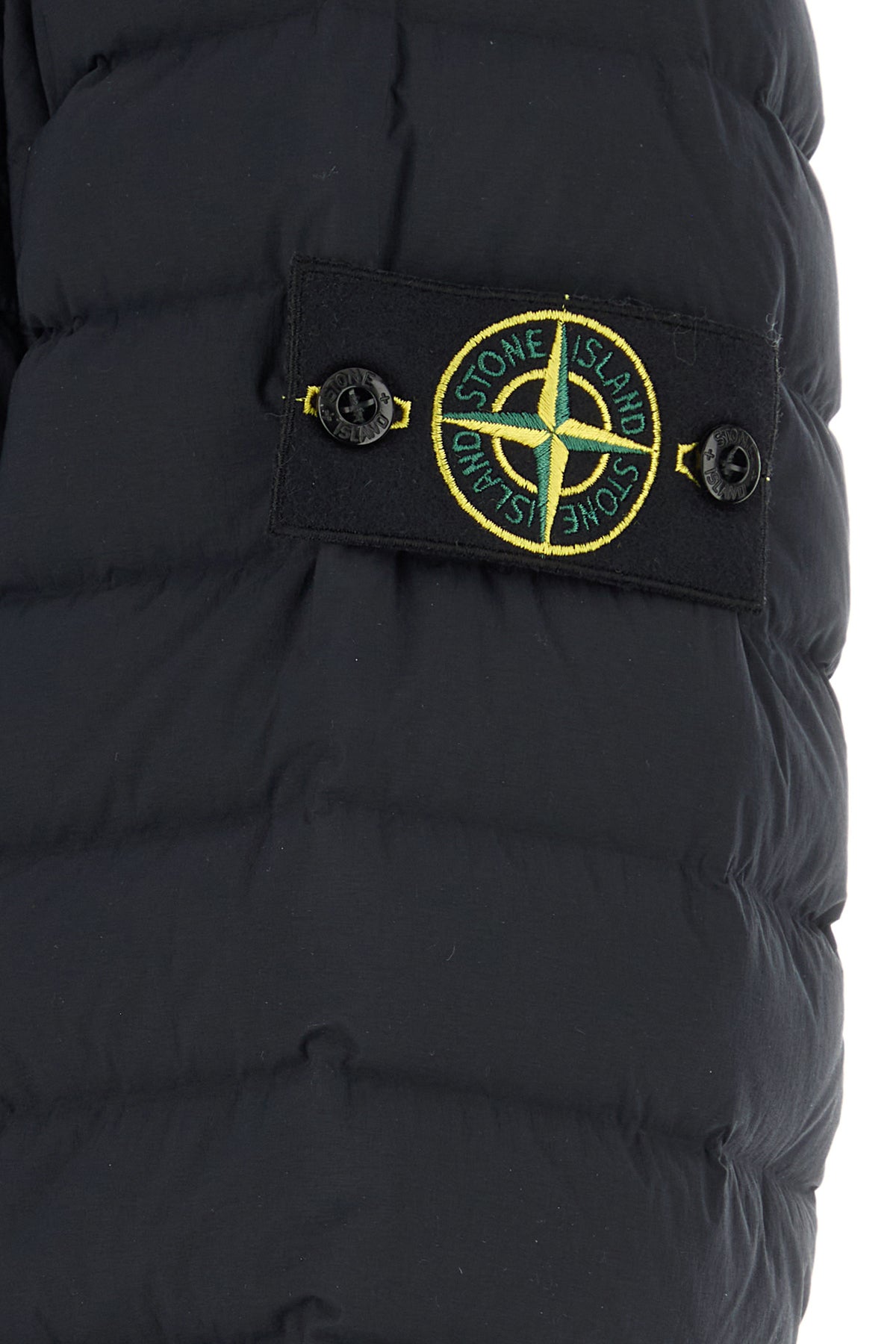 Piumino realizzato in nylon stretch trapuntato arricchito da etichetta logata amovibile sulla manica.