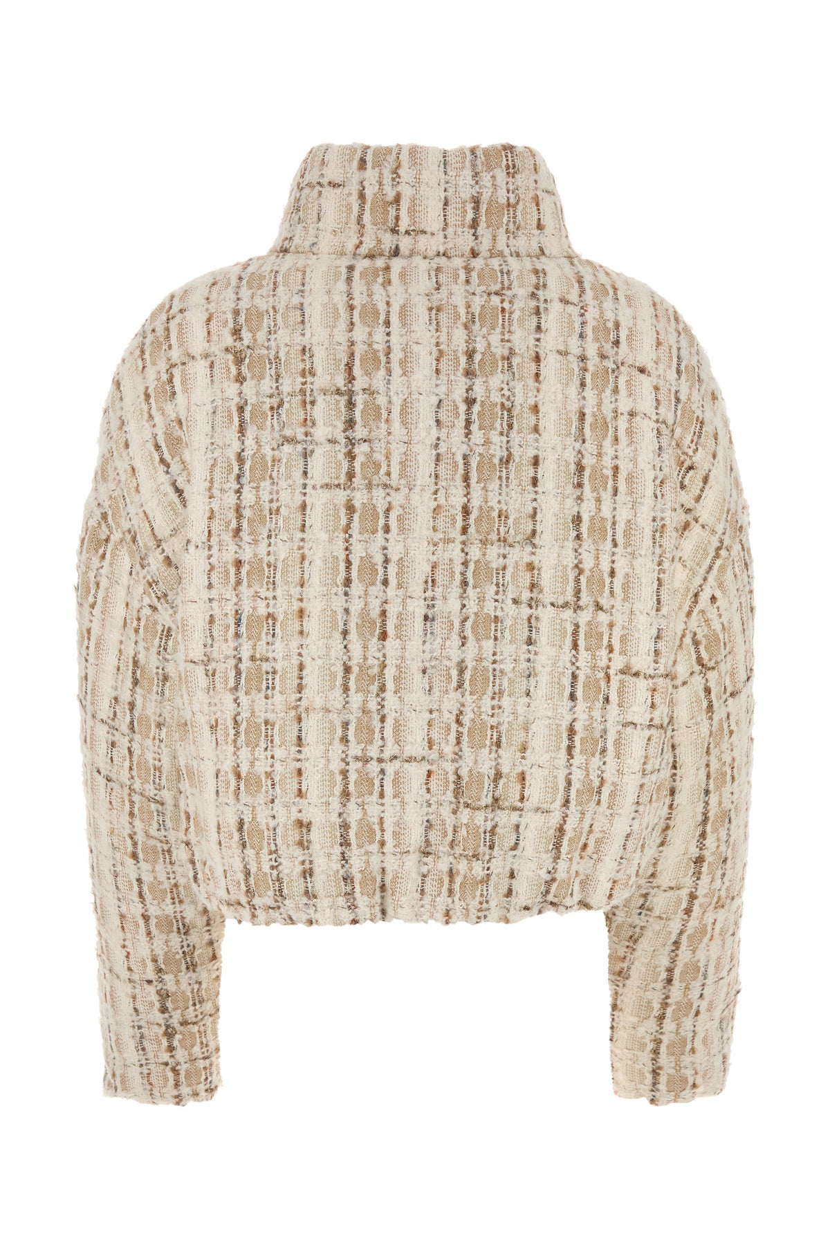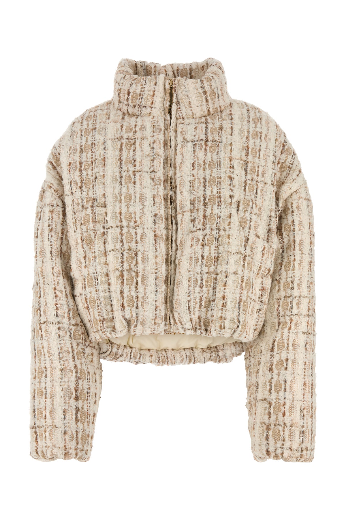 Piumino realizzato in tweed caratterizzato da cappuccio.