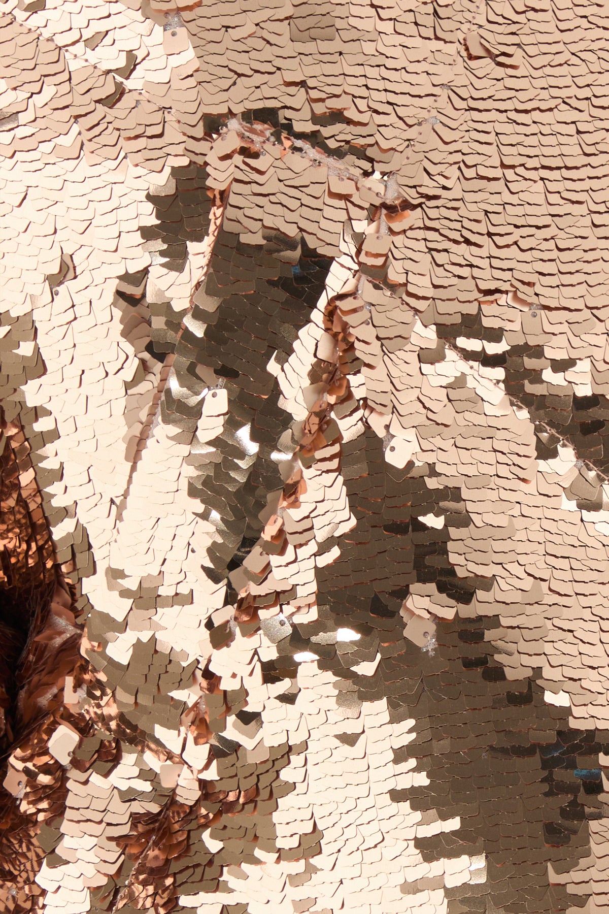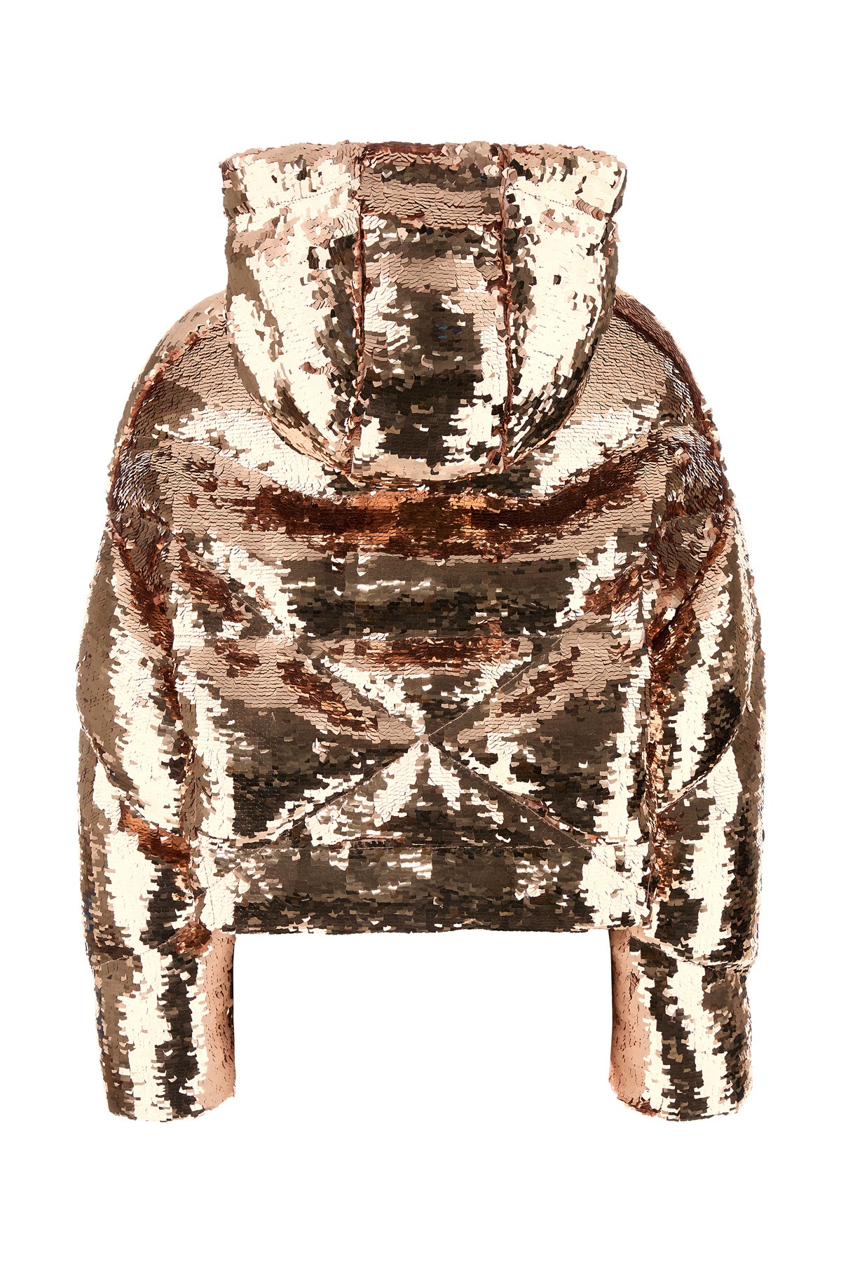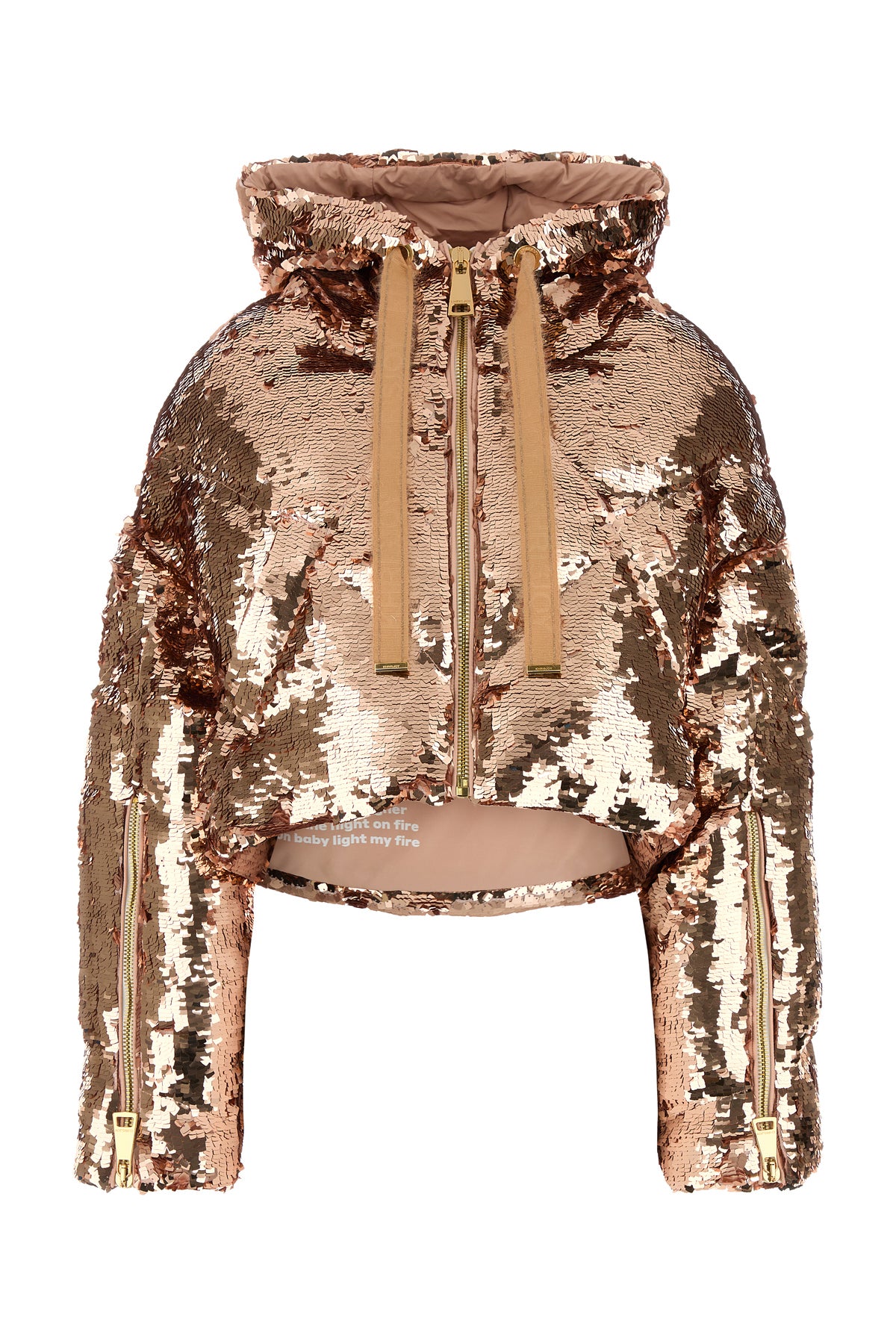 Piumino dal taglio corto realizzato in poliestere interamente ricoperto di paillettes.