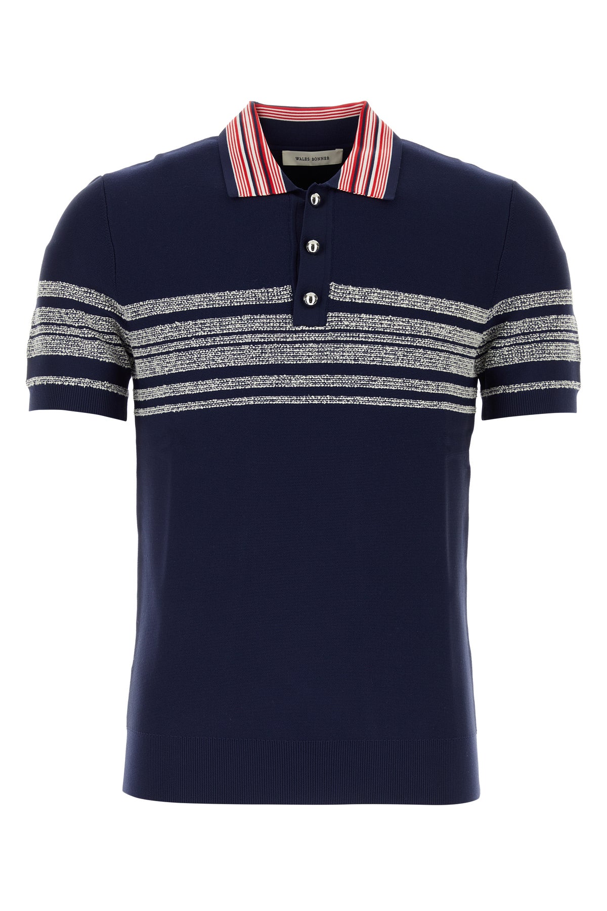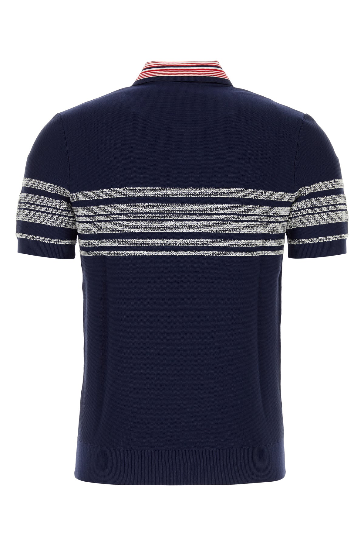 Polo realizzata in misto nylon caratterizzata da particolare ricamo a righe sulla parte frontale, sulle maniche e sul retro.