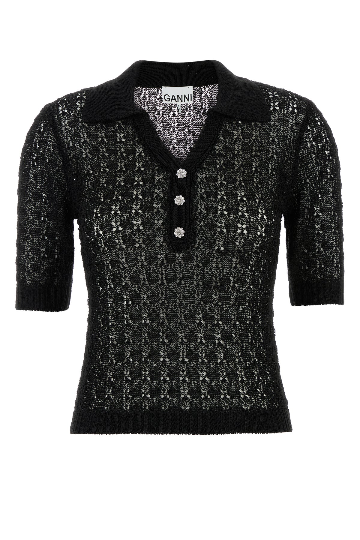 Polo realizzata in crochet caratterizzata da chiusura parziale mediante bottoni gioiello.