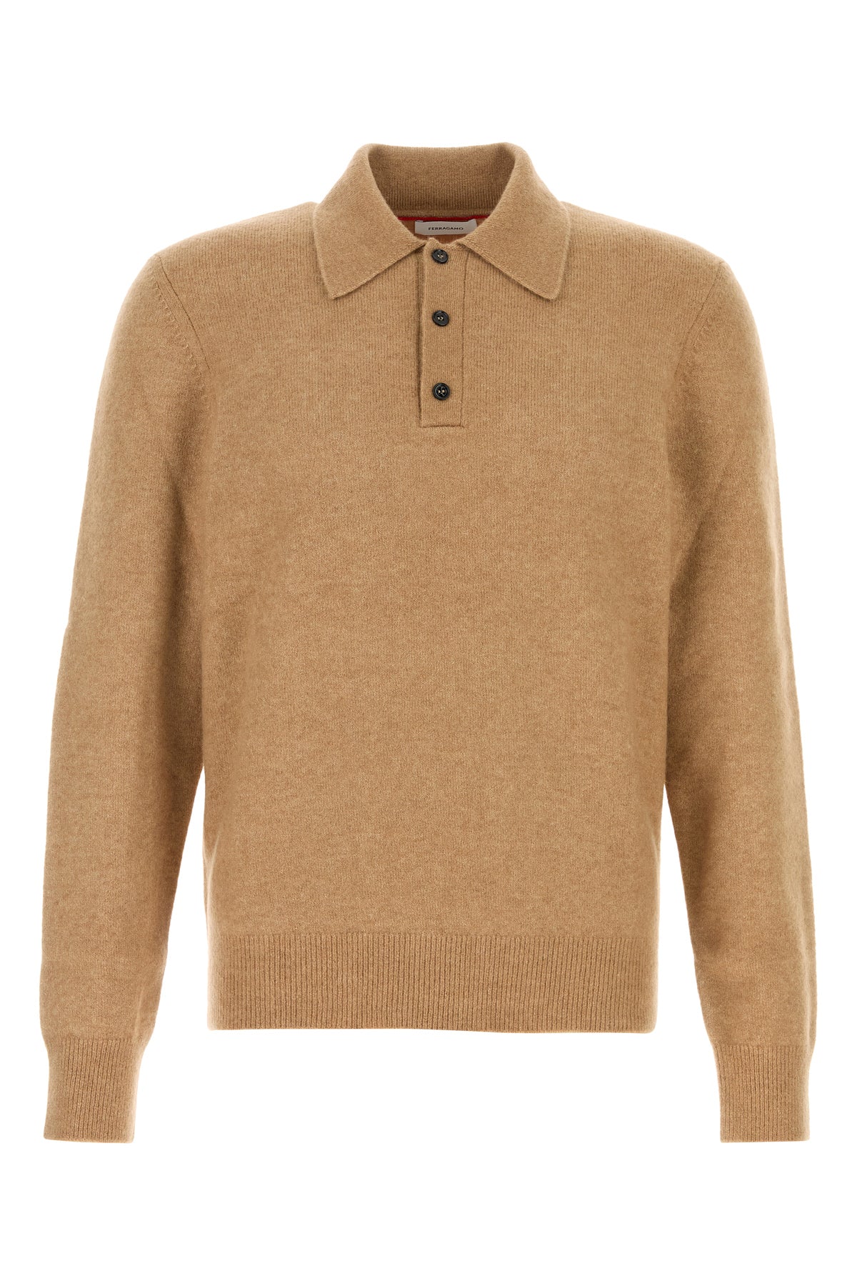 Polo a maniche lunghe realizzata in misto cammello stretch arricchita da targhetta metallica logata sul retro.