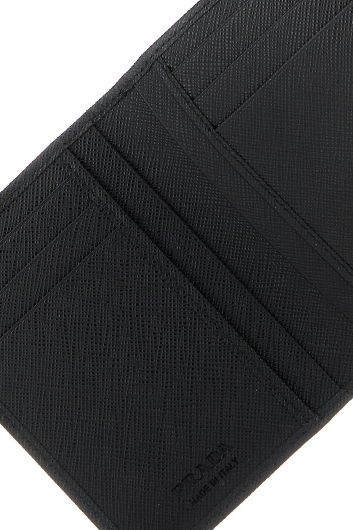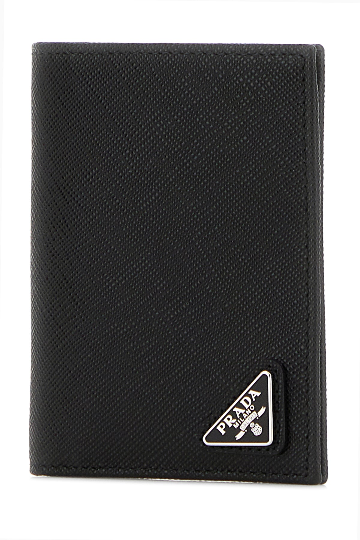 Portacarte realizzato in pelle Saffiano arricchito da iconico triangolo metallico logato sulla parte frontale.