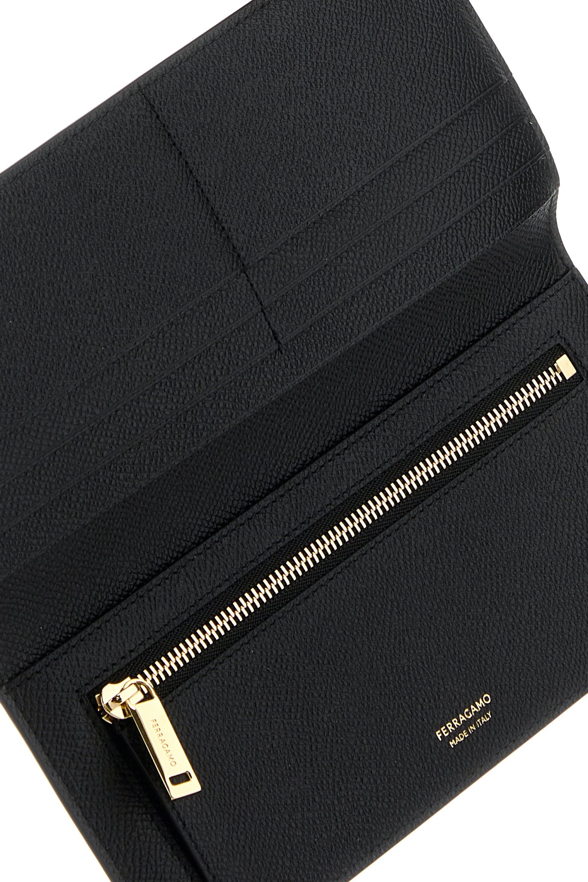 - Interno con una tasca a zip, due tasche a fessura e sei spazi per carte di credito