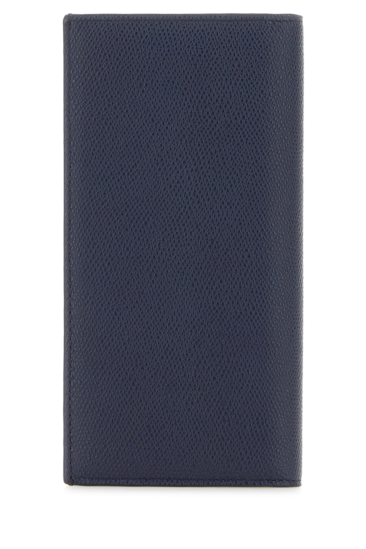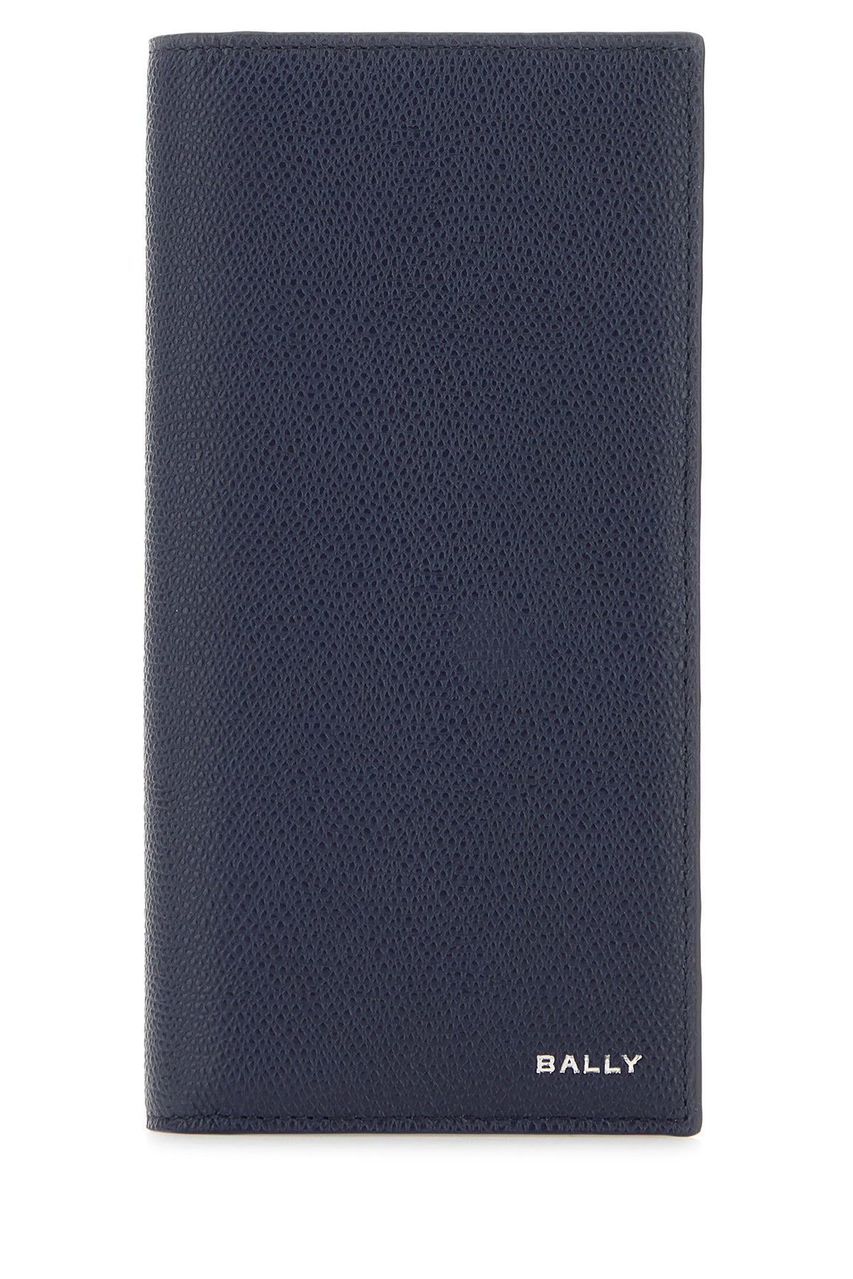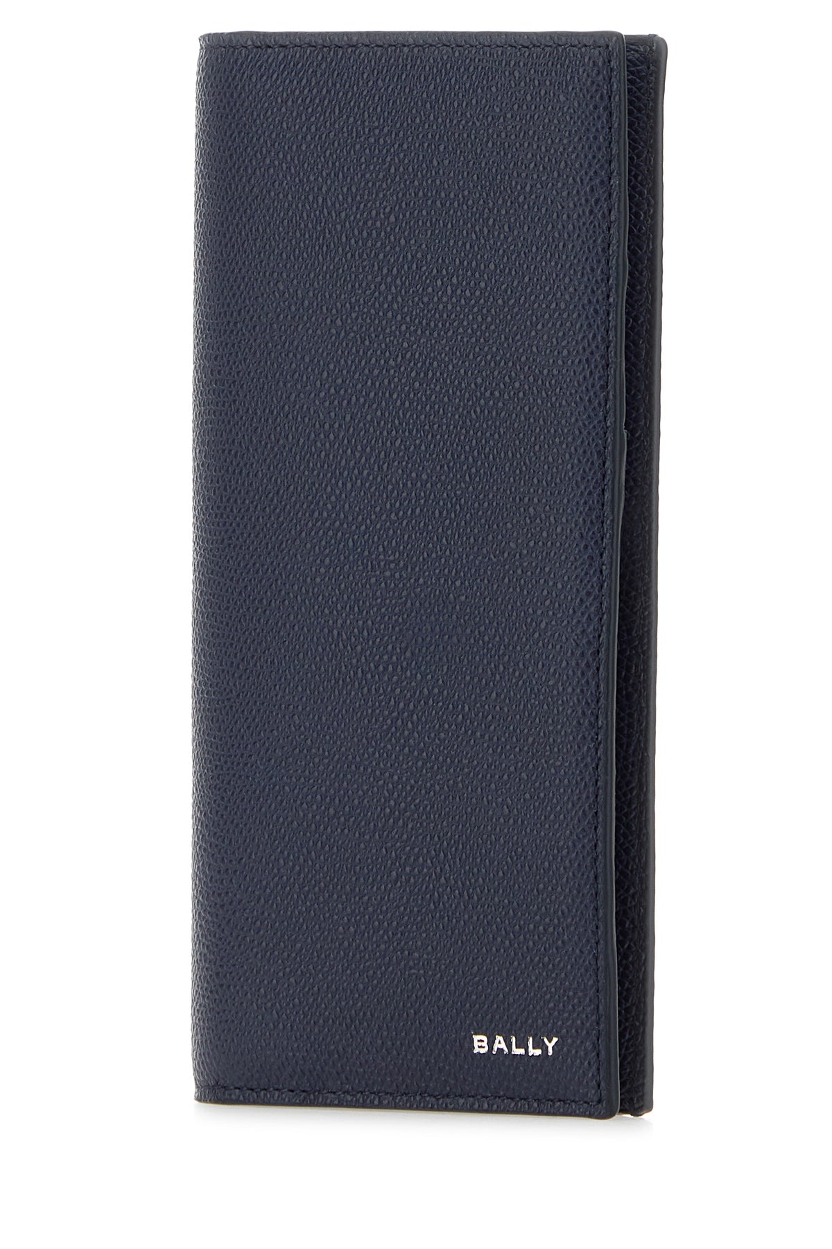 Portafoglio realizzato in pelle zigrinata arricchito da logo in lettere metalliche sul fondo.
