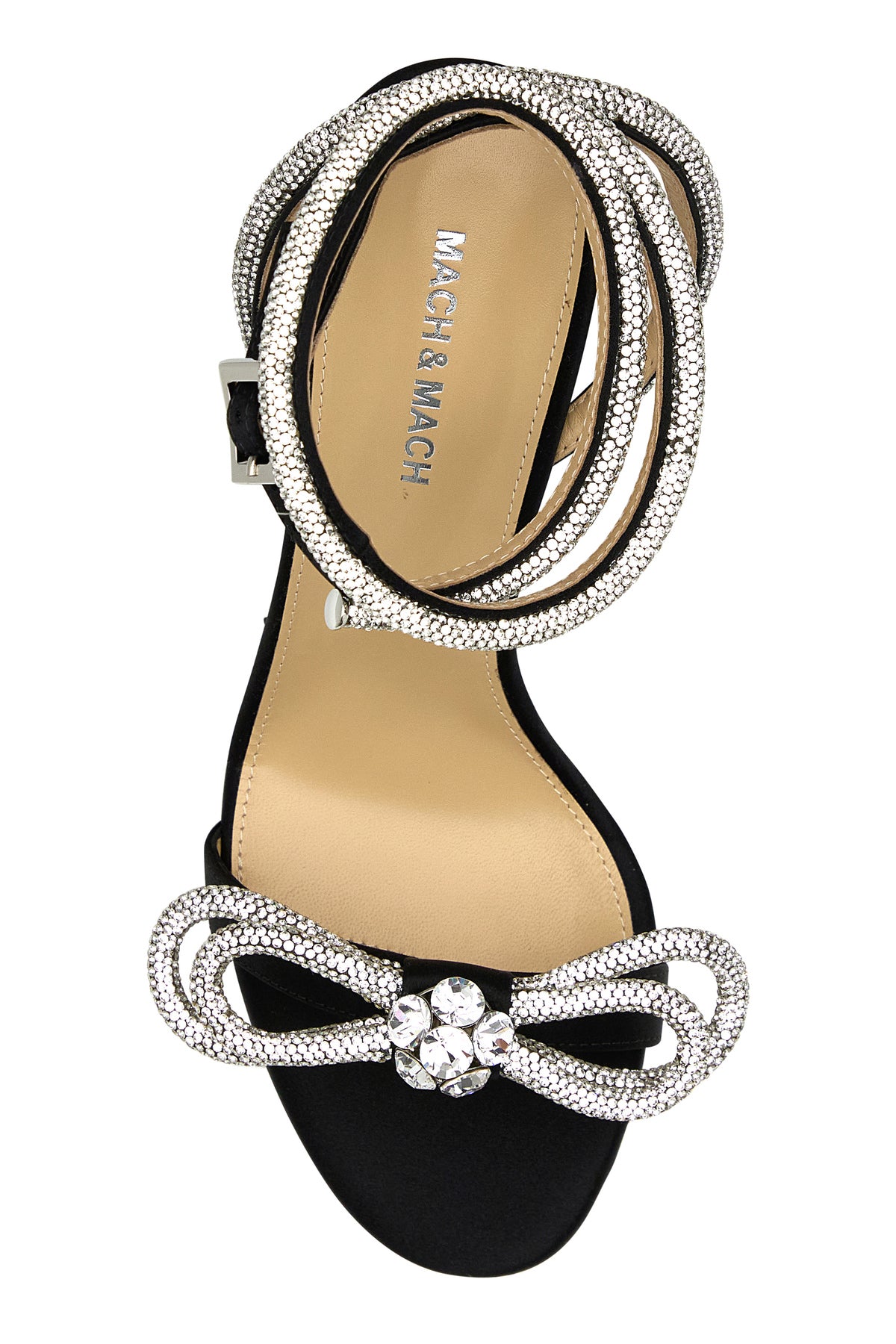 Sandali realizzati in raso arricchiti da fiocco gioiello su collo del piede.