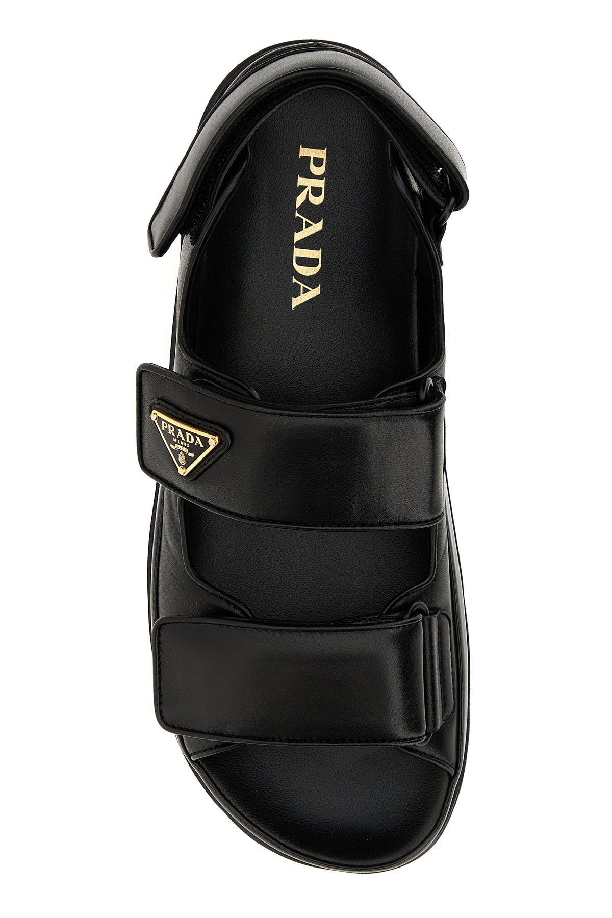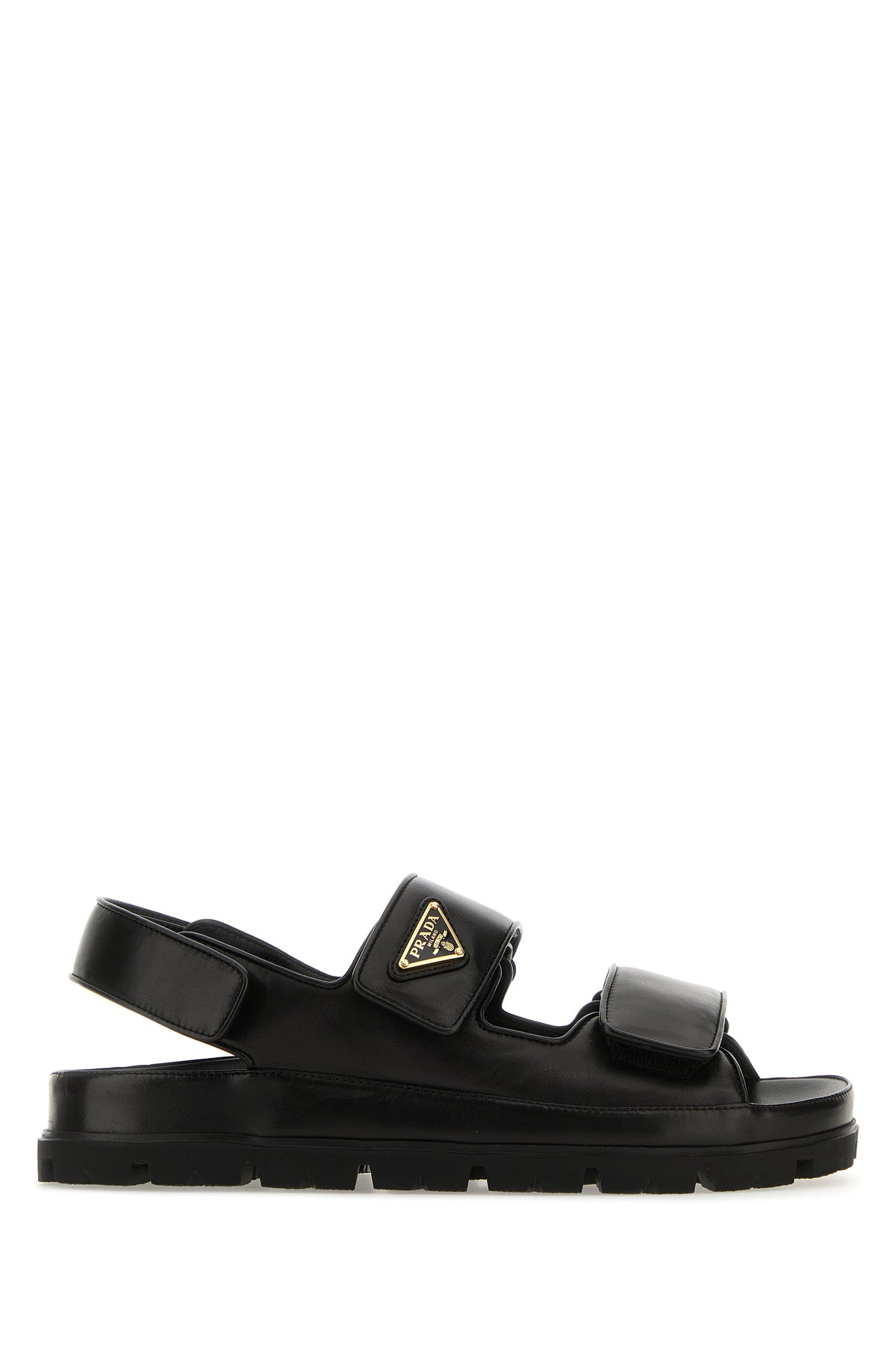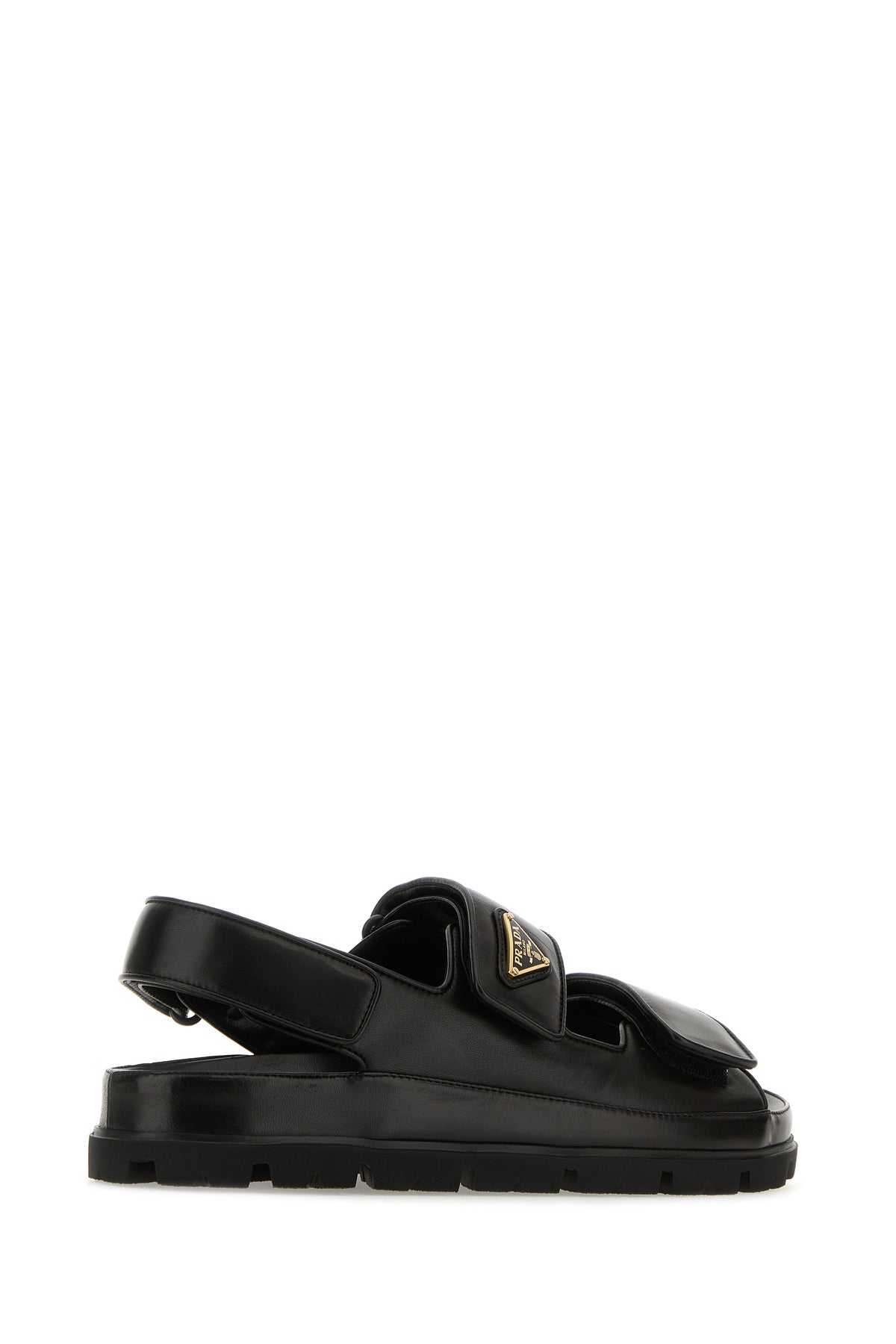 Sandali realizzati in nappa liscia arricchiti da iconic triangolo metallico logato sul collo del piede.