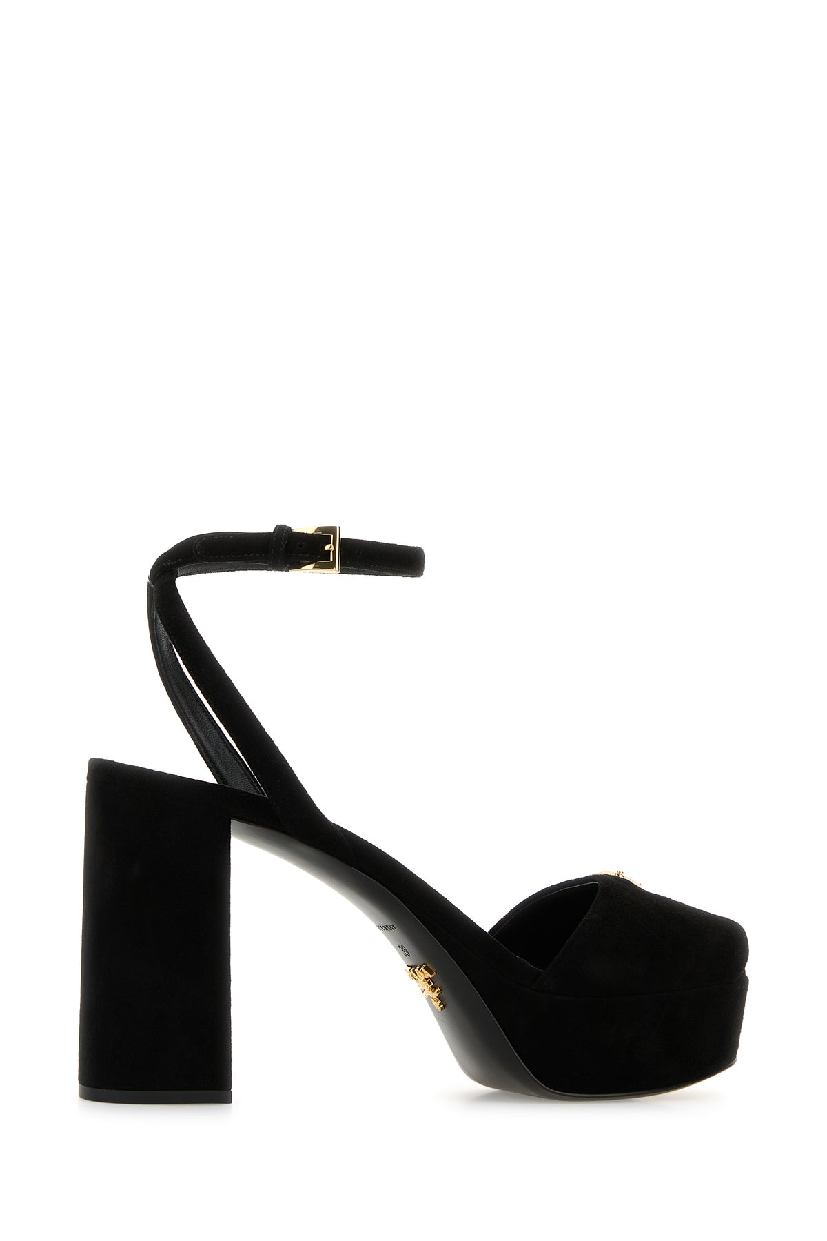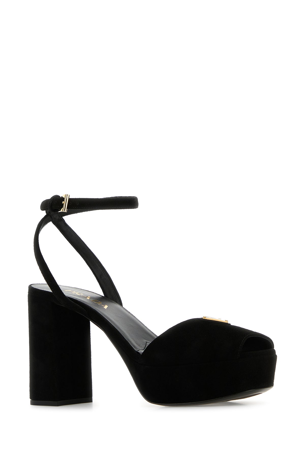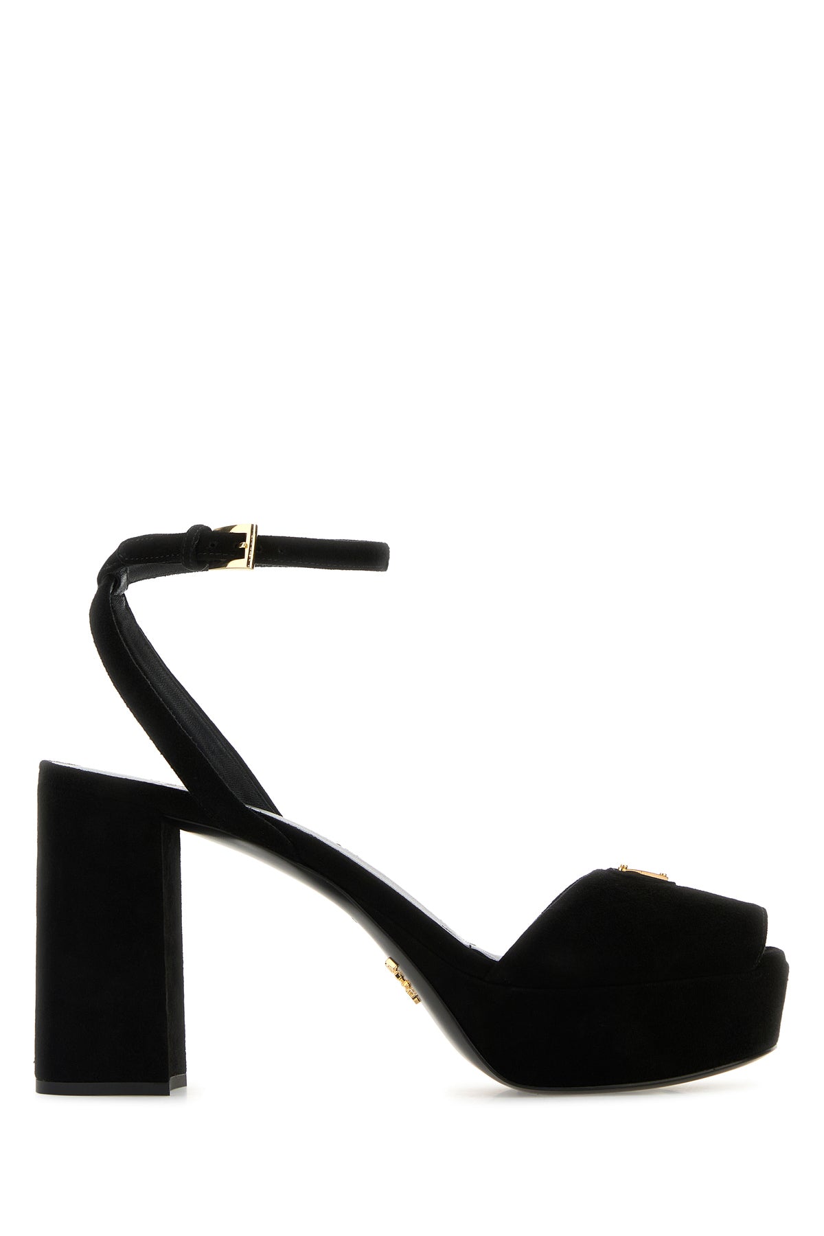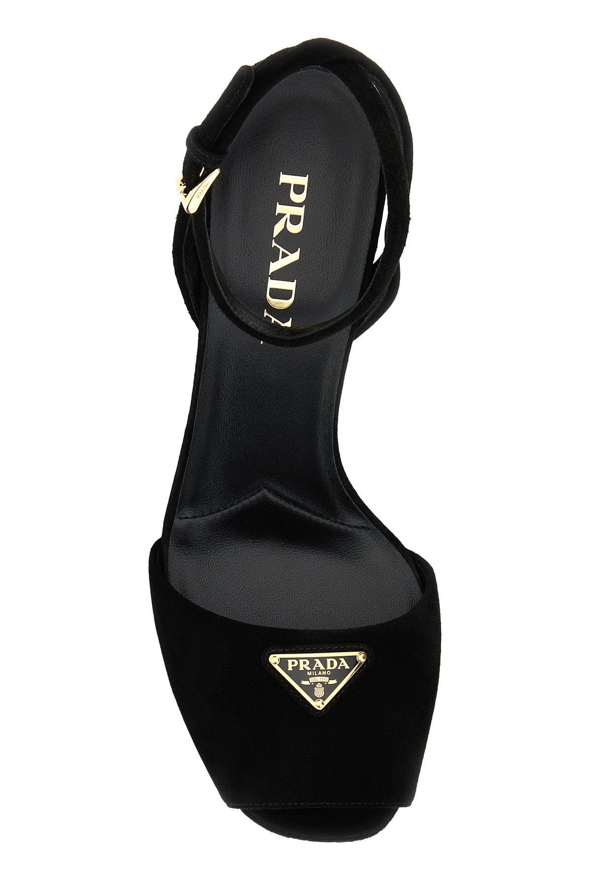 Sandali realizzati in pelle scamosciata arricchita da iconico triangolo metallico logato sul collo del piede.