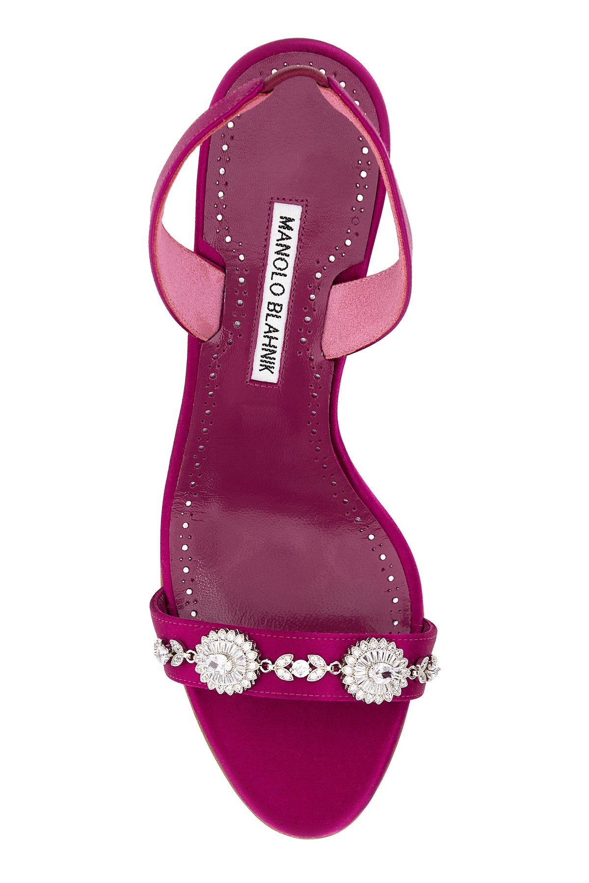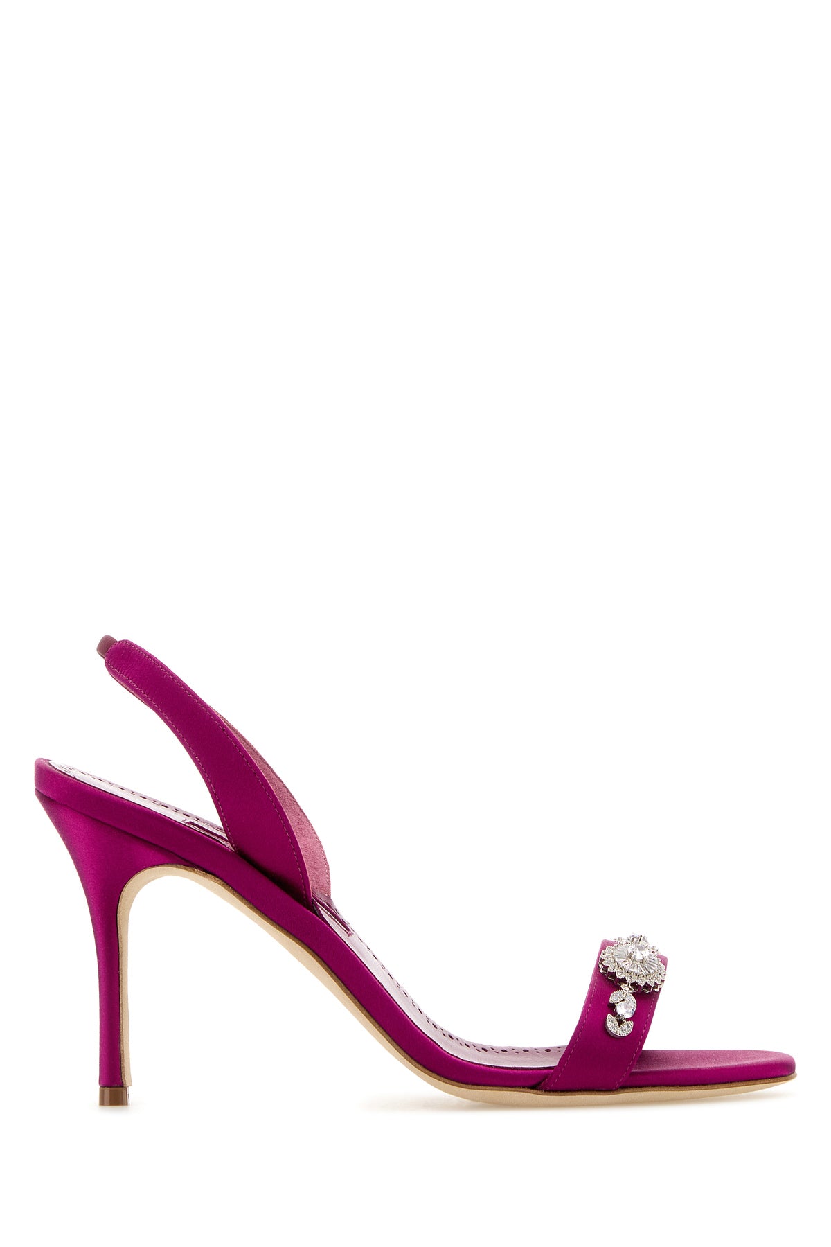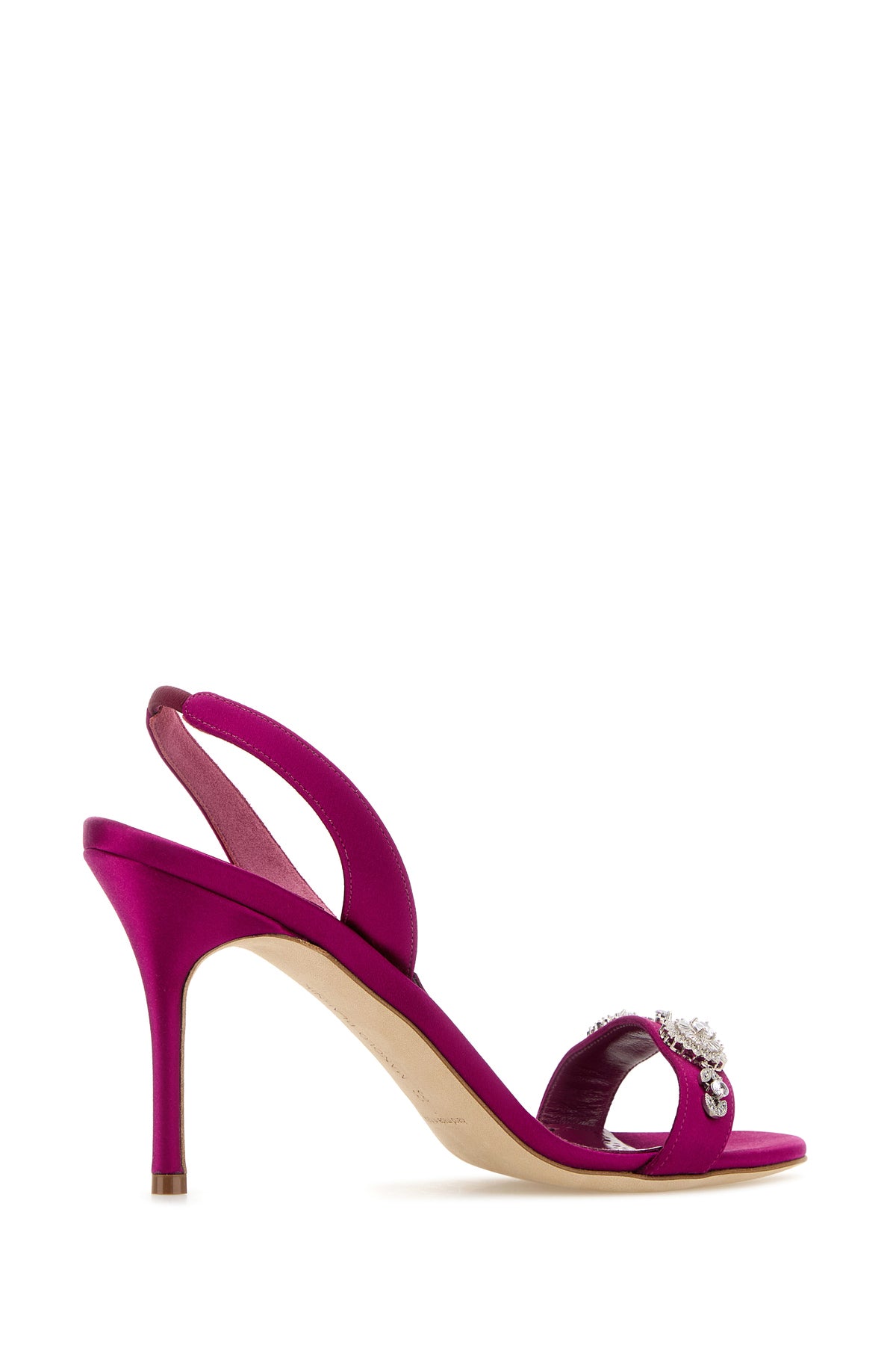 Sandali realizzati in raso arricchiti da dettaglio gioiello sul collo del piede.