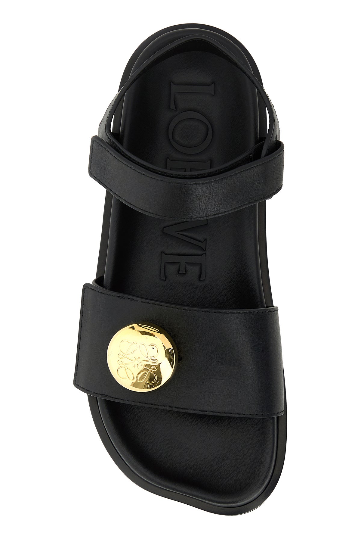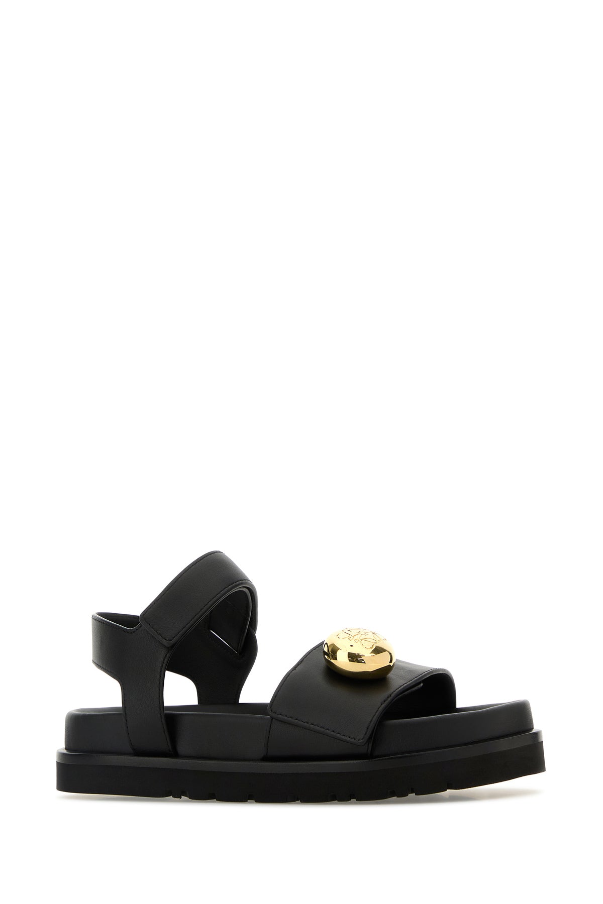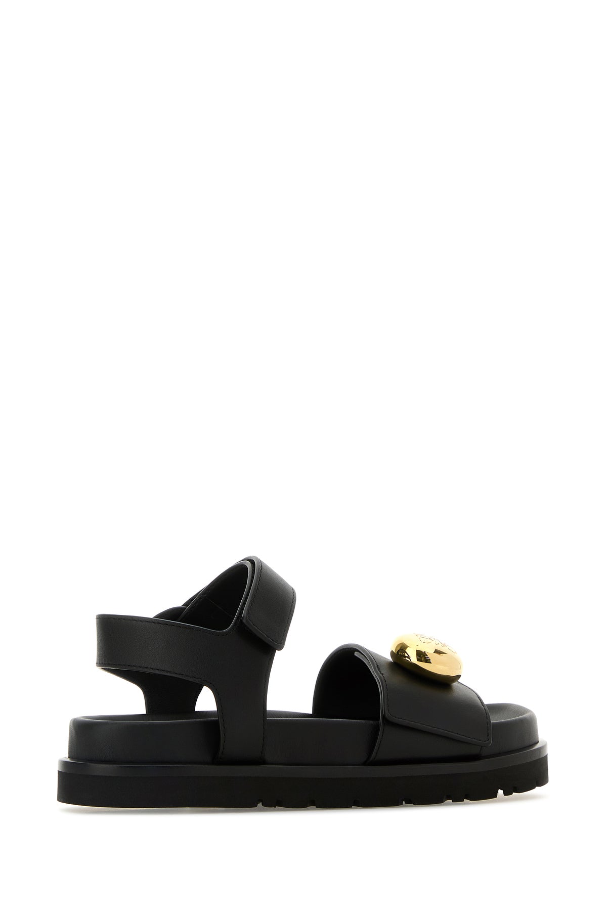 Sandali realizzati in pelle di vitello liscia arricchiti da dettaglio metallico logato sul collo del piede.